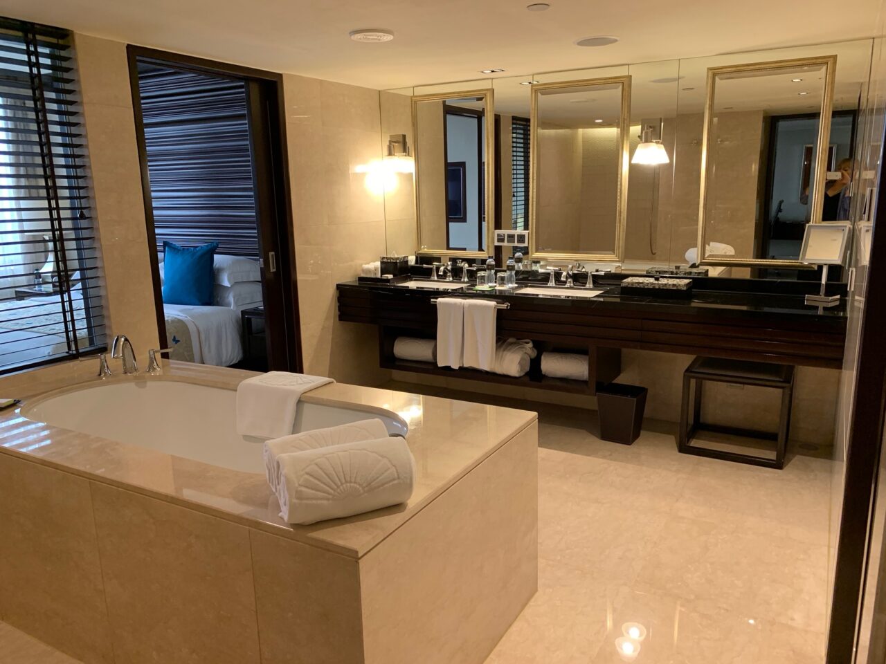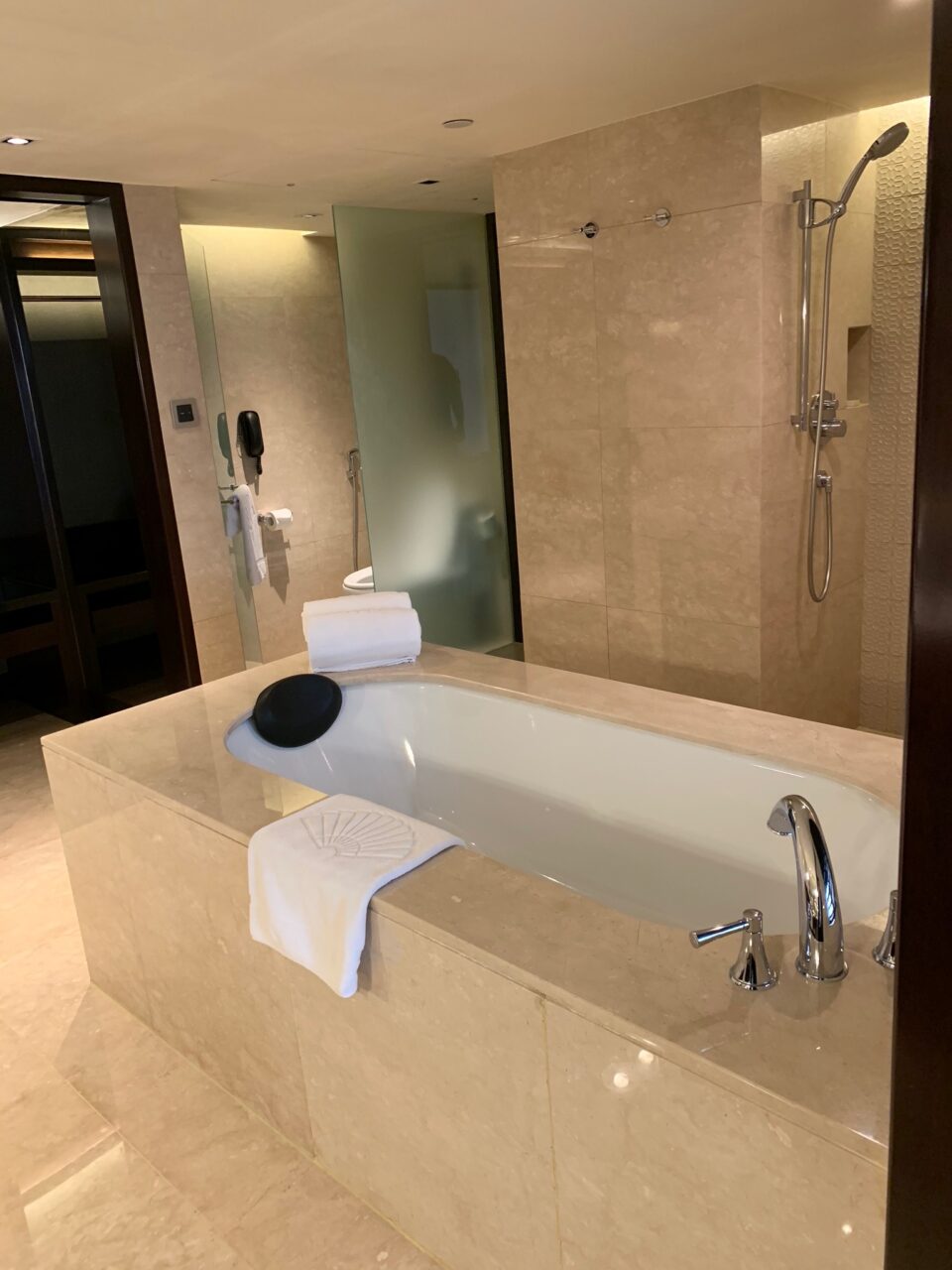 We had been upgraded to a premium suite which had a large bedroom and a lounge area complete with a work desk, mini hallway and the largest bathroom and walk-in wardrobe I’d seen.