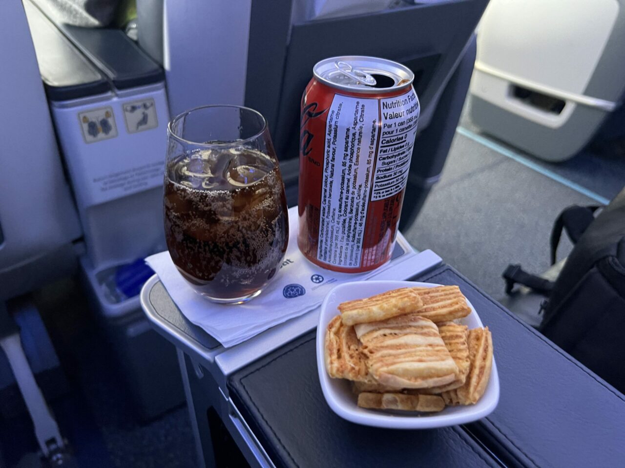 Only instant coffee and black tea, along with milk, were provided as hot drinks on this flight. Air Transat could do with improving their hot drink offering – whether that’s offering alternative tea bag options or some kind of filter coffee. I can say I didn’t enjoy this cup of coffee! A snack service was offered during the flight consisting of chocolates, crisps and other sweet or savoury options.