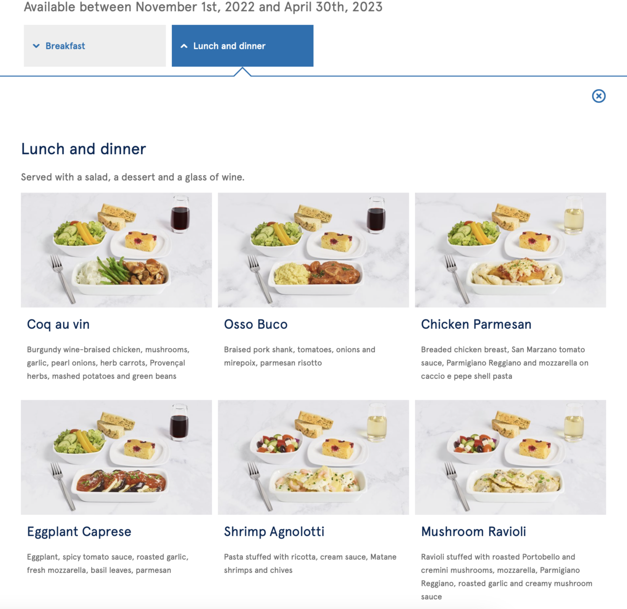 The first meal service began around ninety minutes after departing from Gatwick. Options were offered off a card but you could also pre-select online a minimum of 72 hours before the flight. This didn’t work for me although the options were very similar, but here was the on-board and ‘Book the Cook’ options: