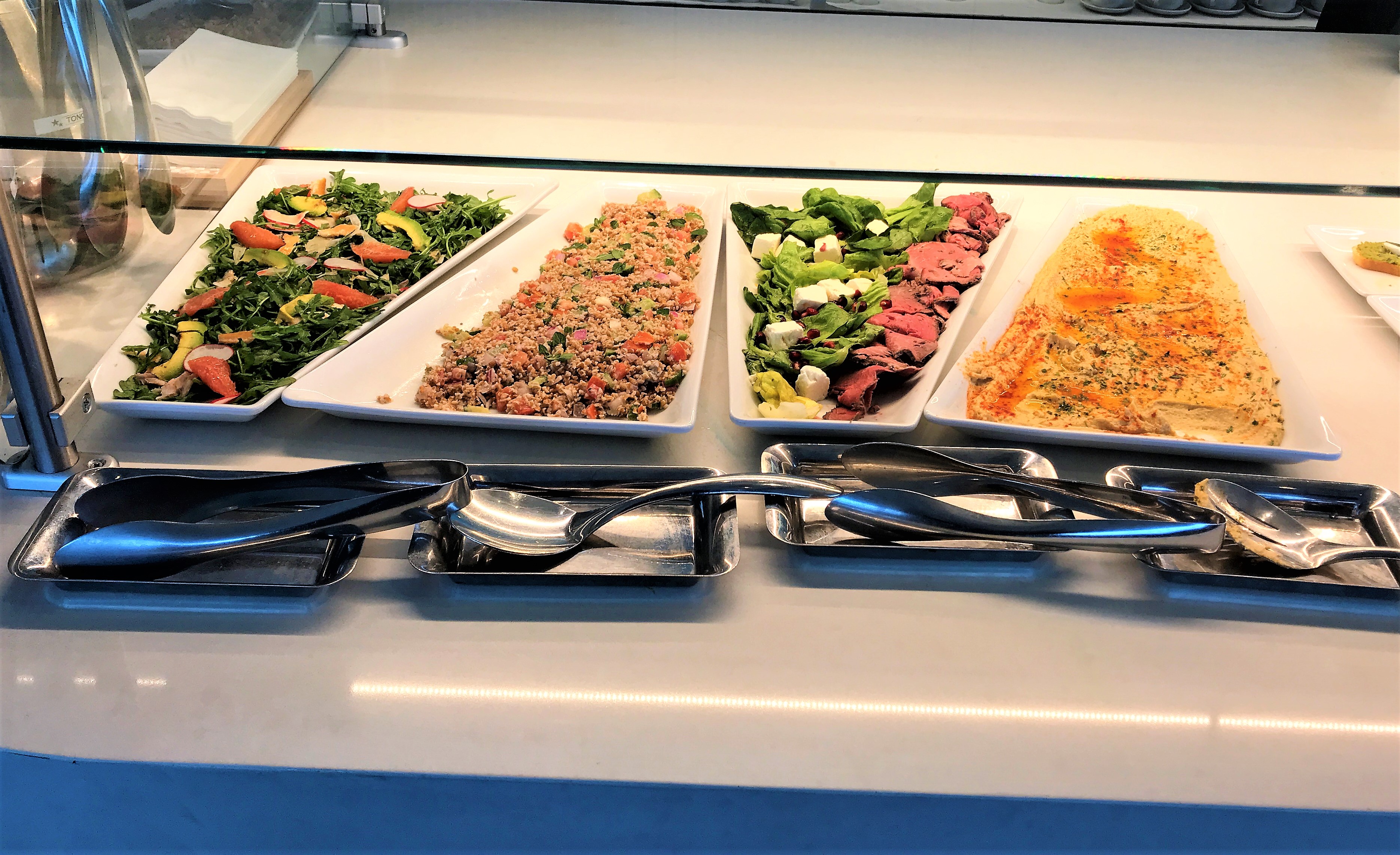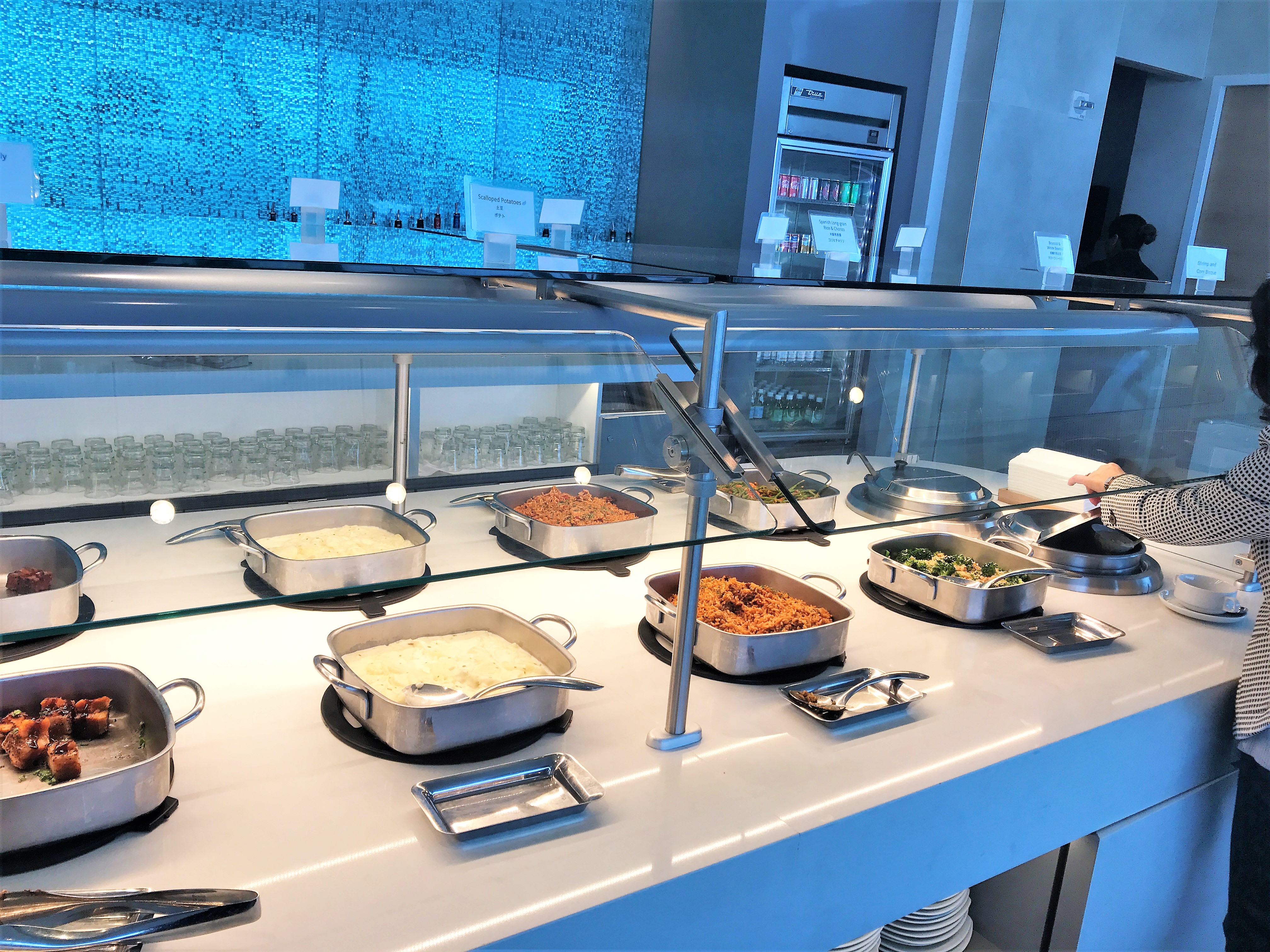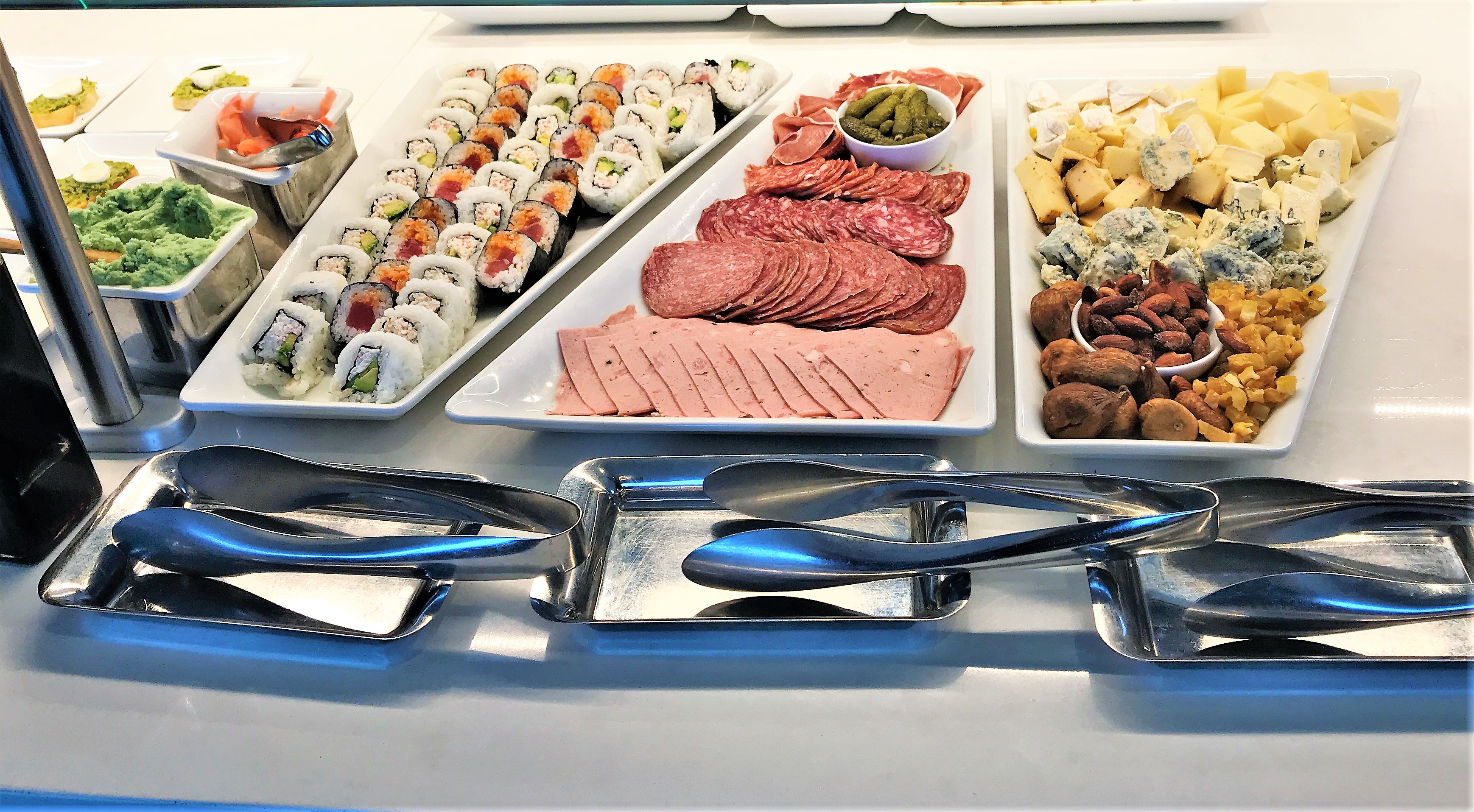 The lounge has help yourself food with a wide variety and it all looked tempting. There were hot and cold options, healthy salads and dips (wouldn’t be an AA lounge without some sort of hummus!) and sushi too.