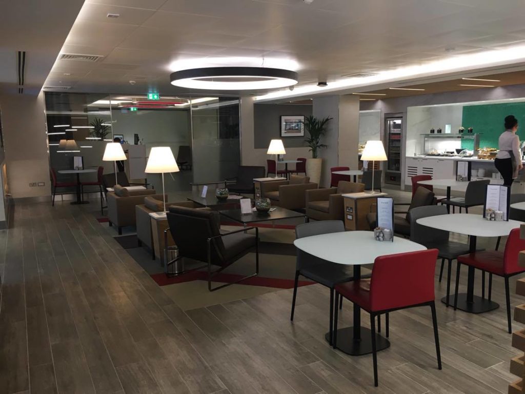 The lounge was almost empty during our visit, but there is plenty of comfortable seating with charging points and a selection of newspapers and magazines. For eating, there are café style tables and chairs.