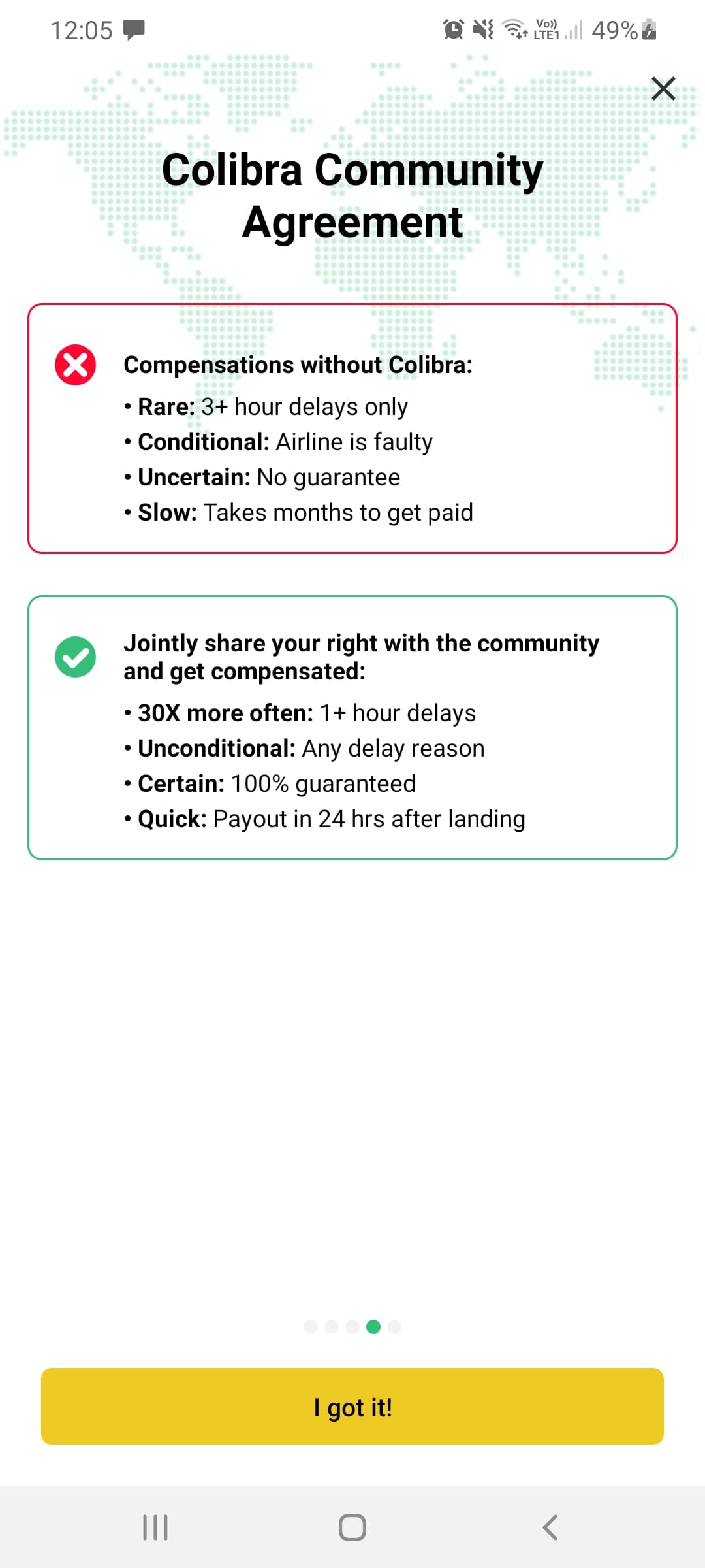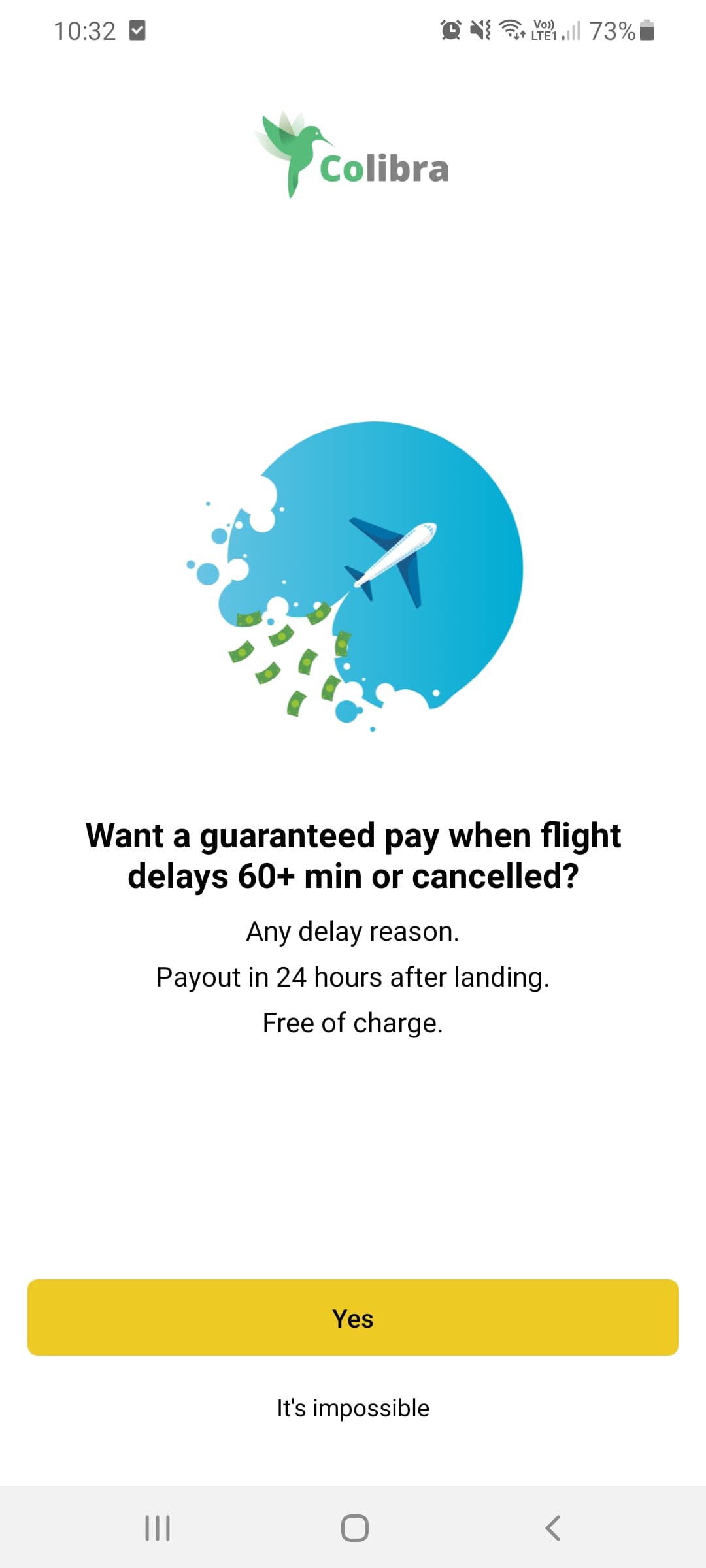 So, essentially, it’s like a betting app but for your own flight delays. Colibra allows users with shorter delays to get a piece of the pie, but the downside is that if you choose to use the app, you waive your right to the larger payout you may be entitled to if your flight ends up being delayed by 3 hours or more. Obviously this is something of a gamble, so you need to make sure you fully understand what you are signing up for.