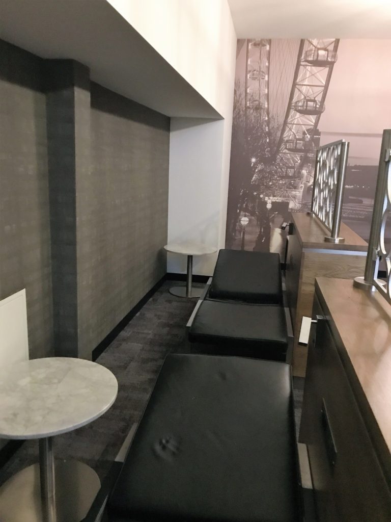 The lounge had floor to ceiling windows overlooking the apron along one side. There was plenty of seating, although it was fairly busy. If you wanted to work there were convenient desks with power points. There was a buffet and bar area with separate tables for dining.