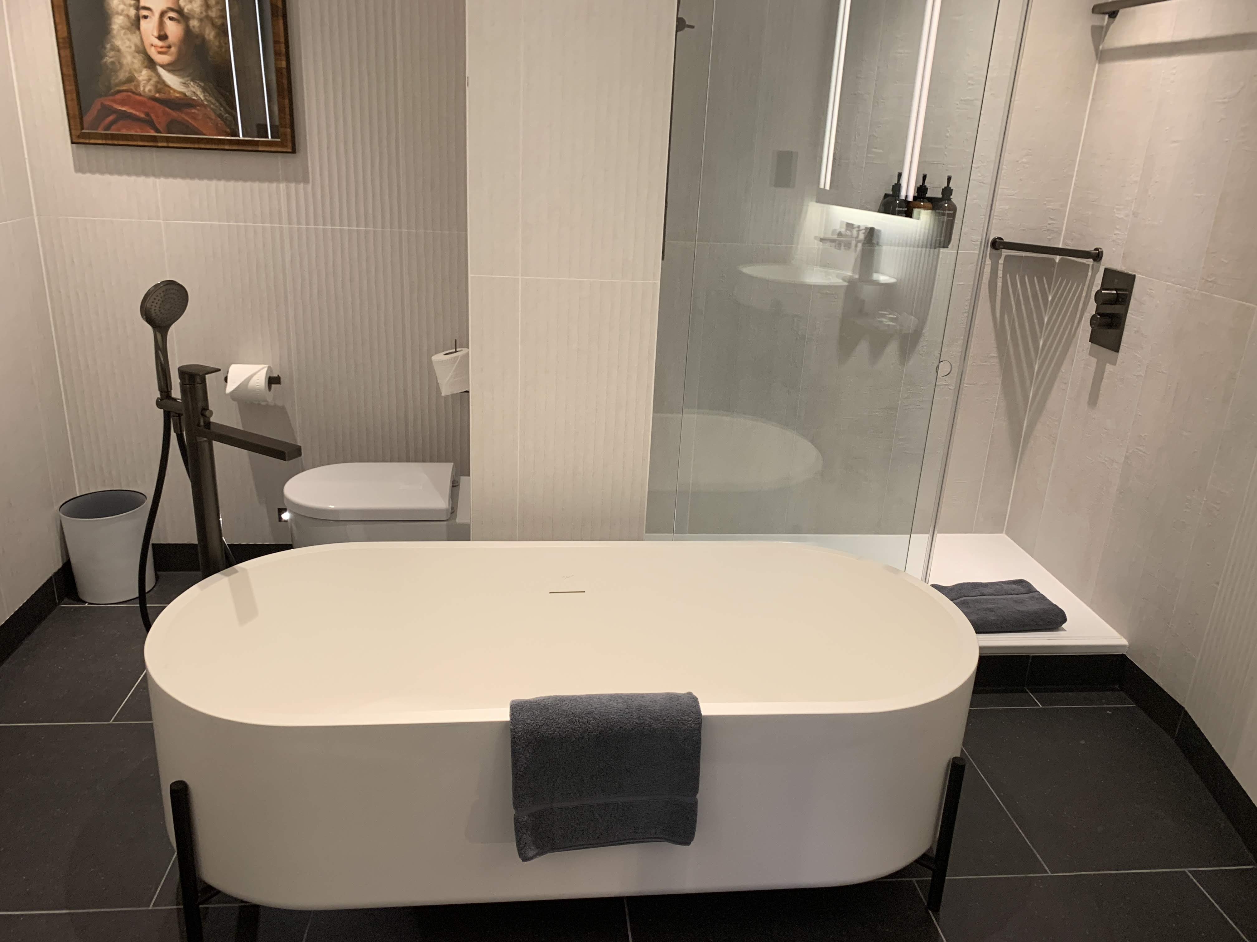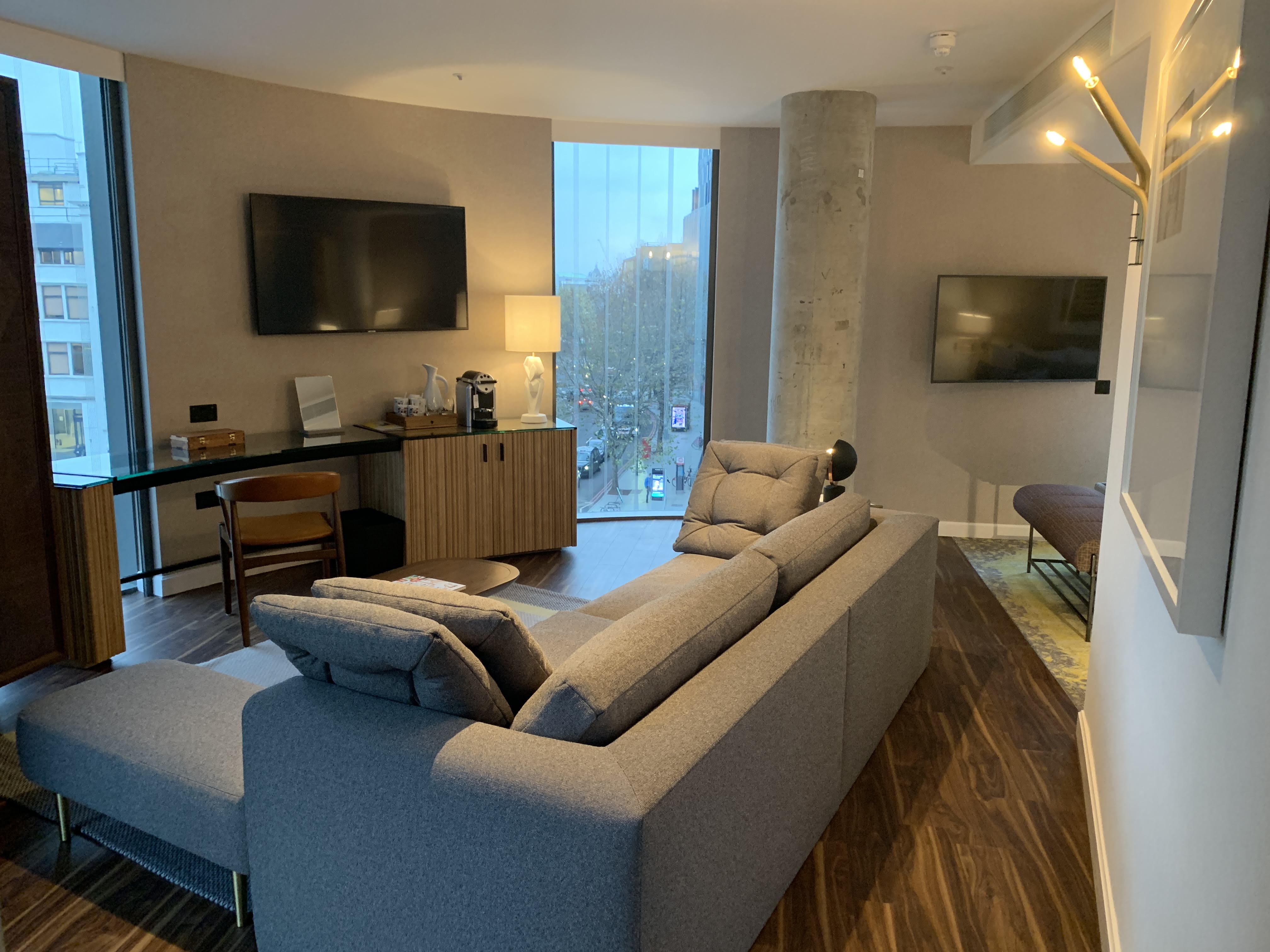 The room was definitely modern in design but I thought it still felt reasonably luxurious despite the slightly quirkier design touches. There was a Nespresso type coffee machine plus a premium selection of teas and coffees. A large desk was situated along the window which made a nice light place to work. The room was quite hi-tec with an iPad by the bed to control things from and it automatically dimmed unlike some hotels where they create a light nuisance. There were plenty of charging points by the bed too.