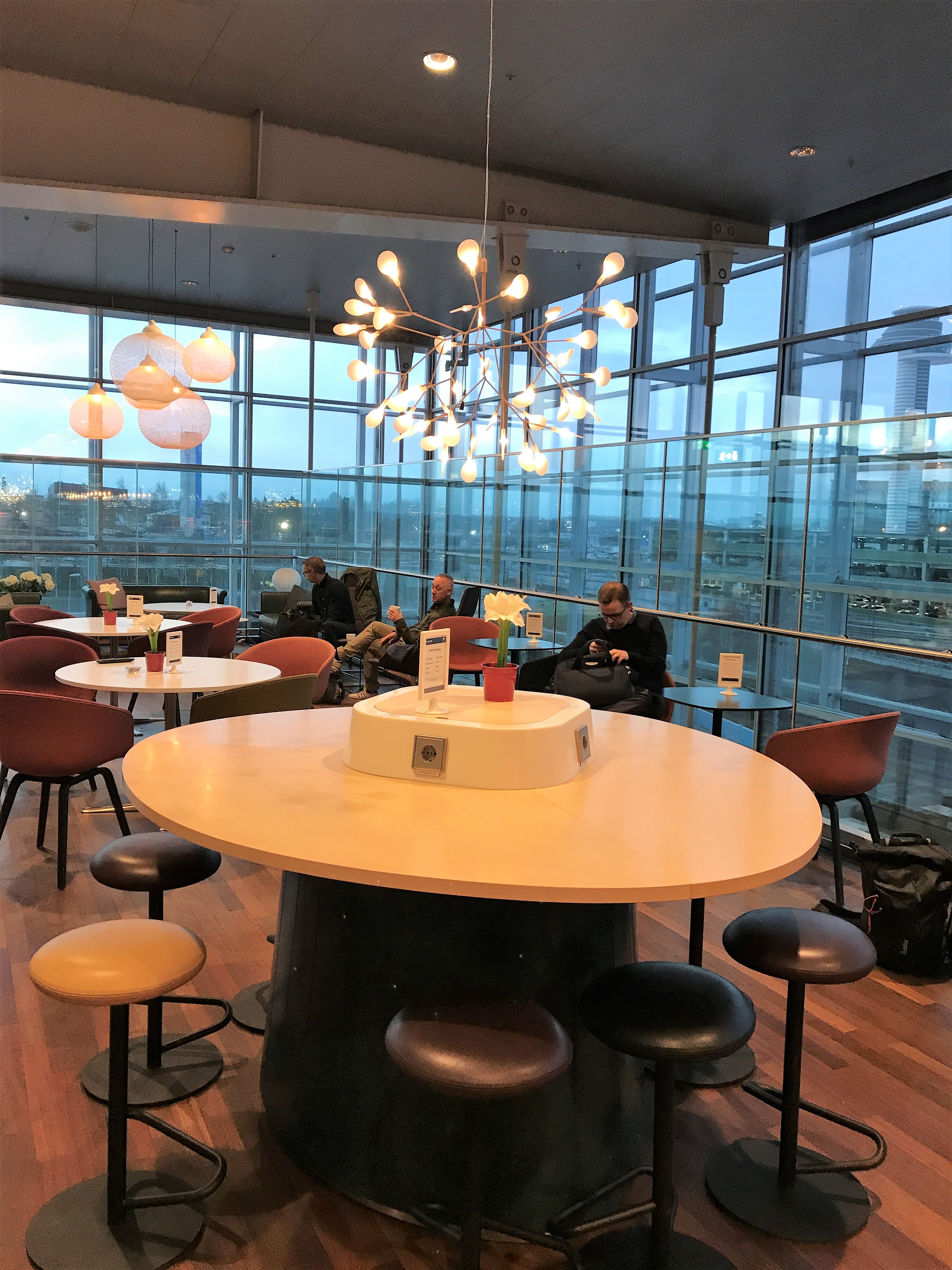 The lounge is located in Terminal 2 near Gates 61-72. This lounge has a typical Scandinavian feel to it complete with antler chandeliers! There are a few sofas at the far end if you want somewhere to snooze after a long flight. Like most of the lounges, it is perfectly adequate but not very exciting. Drinks include wine on tap (never a good sign in my opinion) and beer. It can get quite crowded at busy times in the late afternoon.