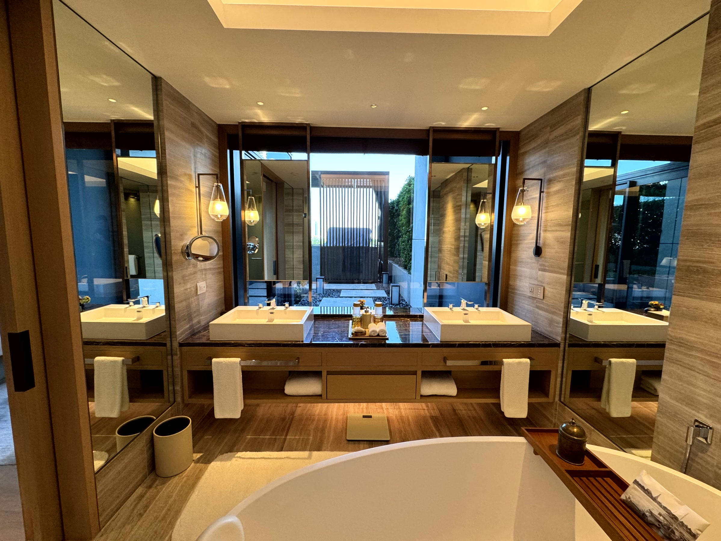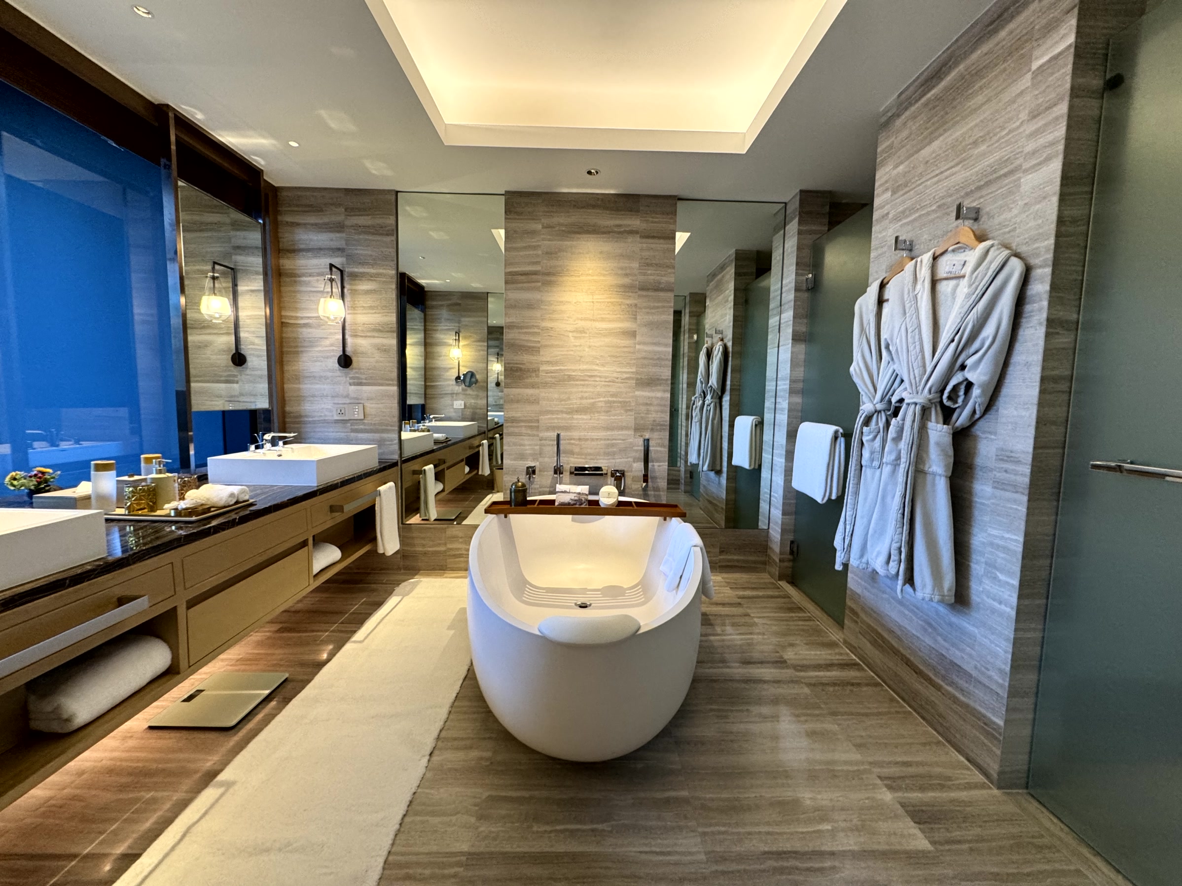 In the final part of the room’s interior, the bathroom was an equally impressive affair with dual sinks, a centrepiece bath with enough room for me at 188cm and excellent rainfall shower. Expansive windows make the light space feel even more airy and a delight to relax in.