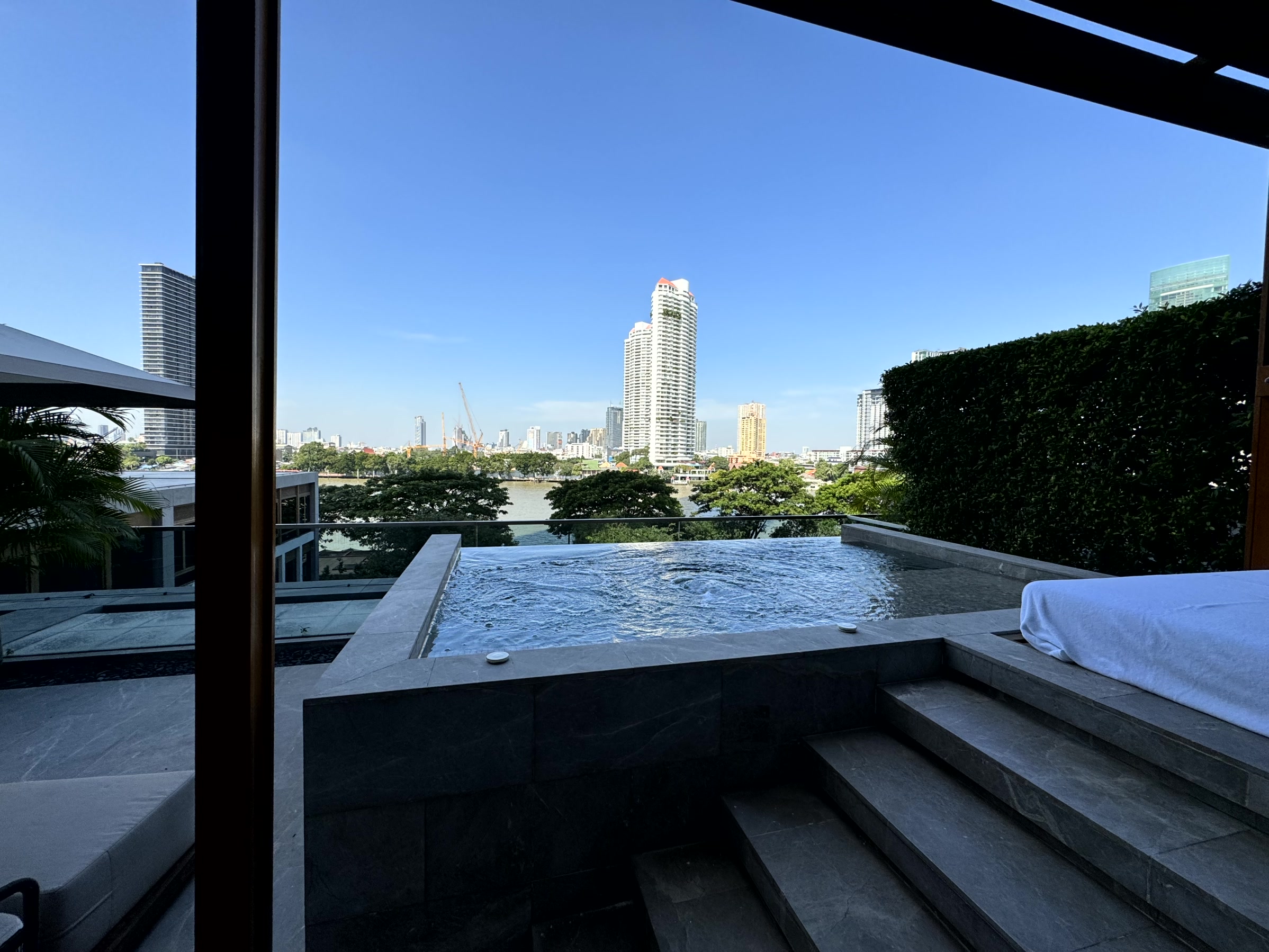 Architecturally from the outside it looks terrible, like shipping containers piled on top of one another! But inside it is as luxurious as the review suggests. I even got a bottle of champagne in my room on arrival. The riverside restaurant is very nice but suffers from mosquitoes in the evening. They put repellent things under the table and I was not bitten. They also have a Michelin starred restaurant but it’s not open every evening so if you want to eat there make sure you’re better organised than I am!