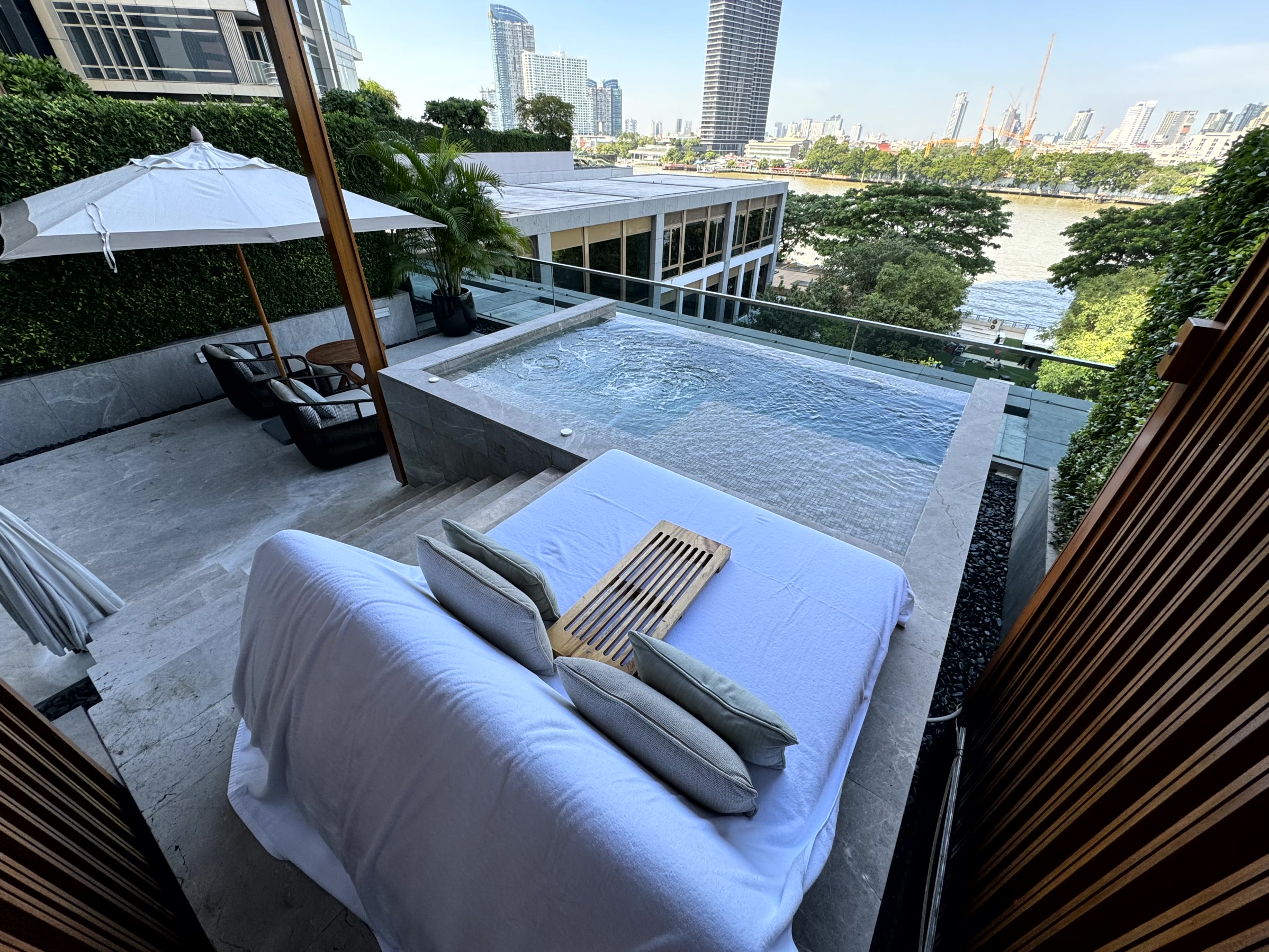 I stayed in a standard room in the main block and the suite reviewed looks very similar, except bigger. The balcony of my room was small but with a sun bed so you could relax taking in the river activity. No pool though.