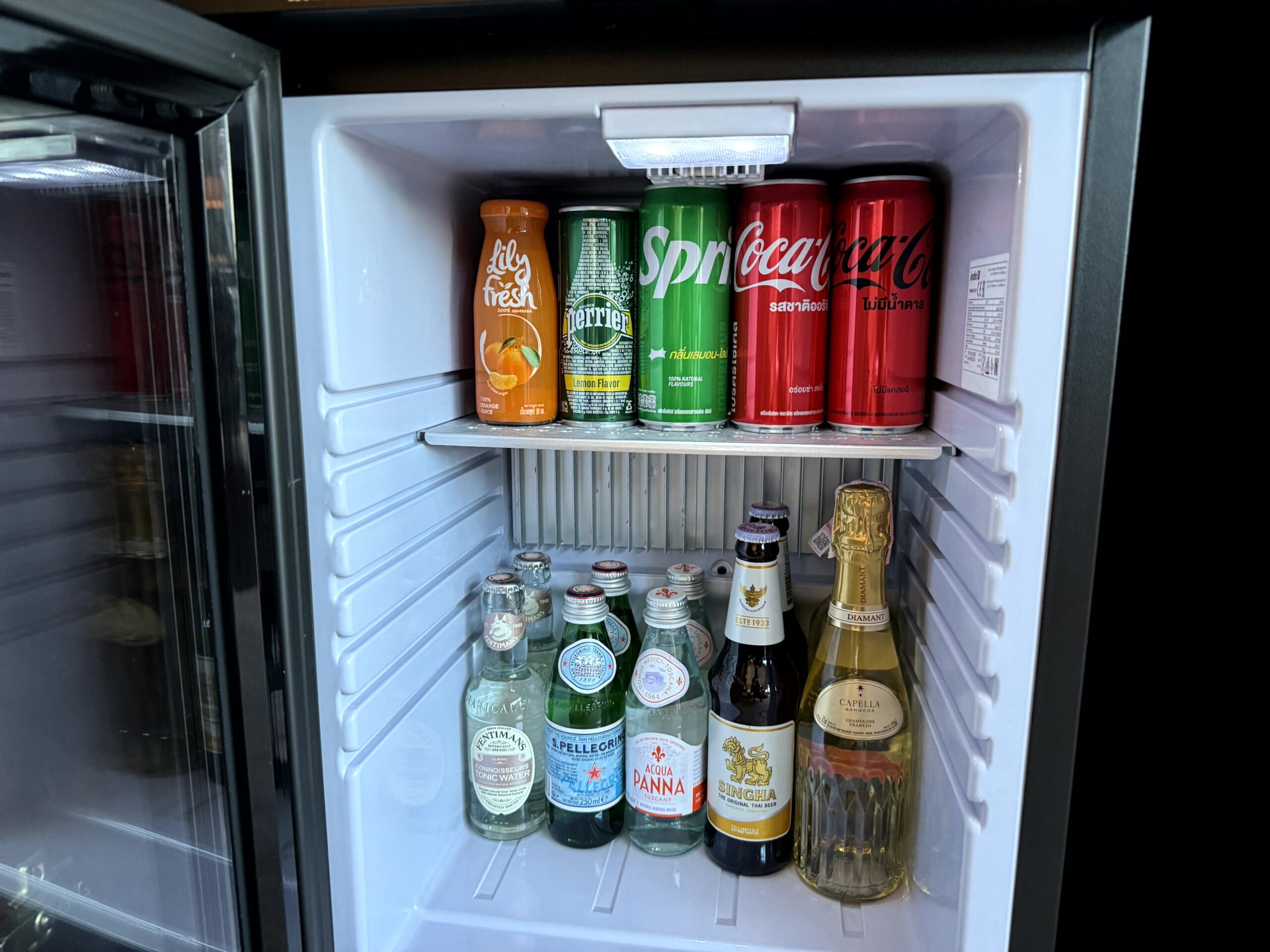Opposite is a large television with the obligatory hotel promo video playing located in a suitable but not perfect alignment to the sofa. Around here, you’ll also find the in-room minibar along with Nespresso coffee and tea. Non-alcoholic beverages are free of charge.