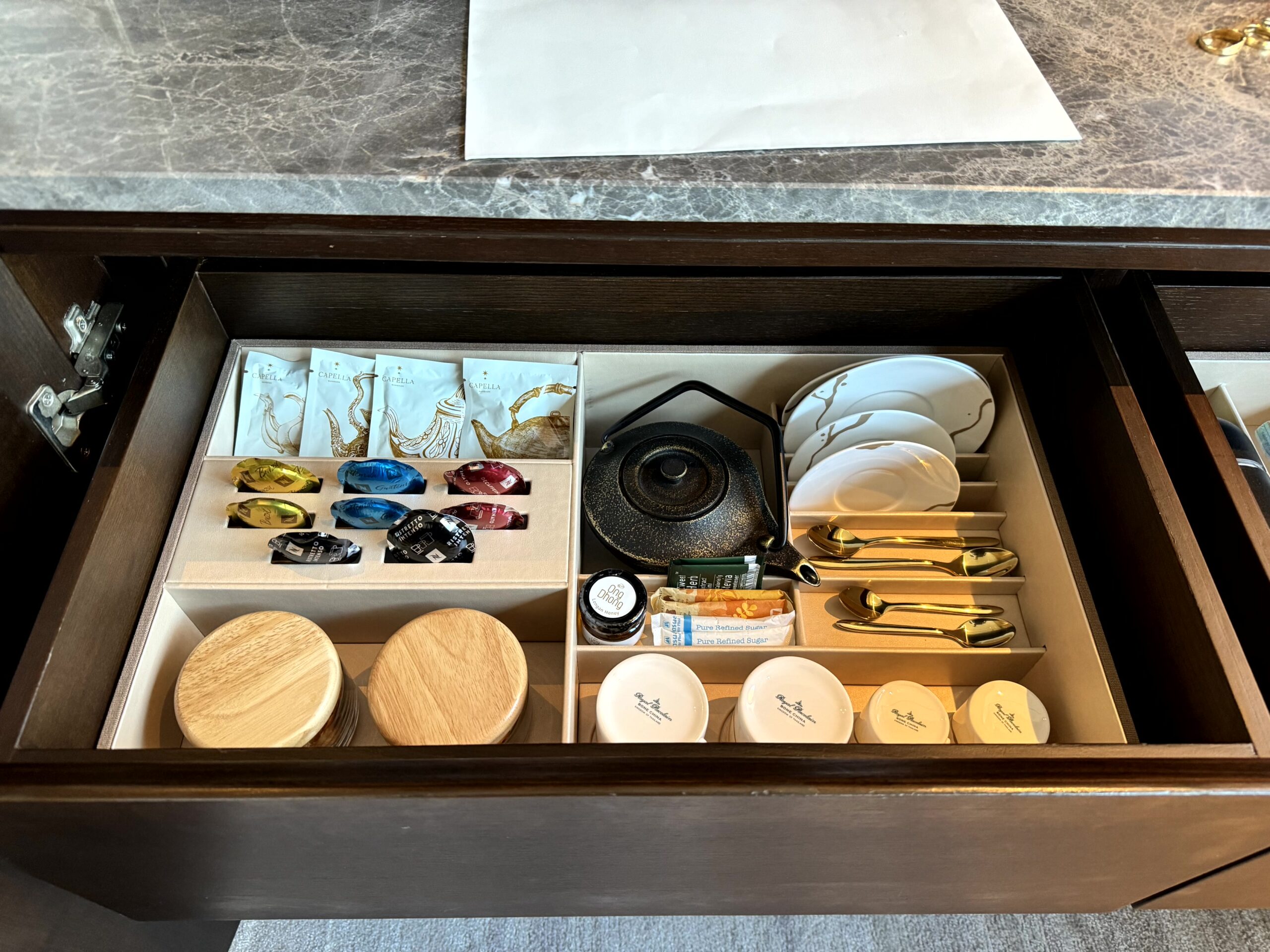 With a smart design, Capella has managed to eek a lot of functionality out of the combined lounge and bedroom. At it’s centre and looking towards the river is the large king-sized bed with plump duvet and cushions, with the obligatory menu of options. The latter could be ordered on the in-room service tablet – as well as on the hotel phone if preferred. Other services can also be requested through the device including in-room dining.
