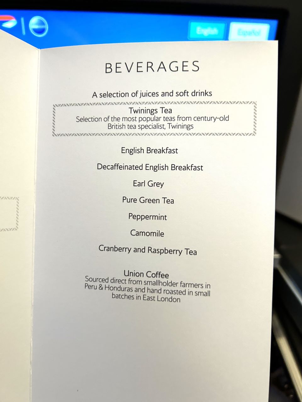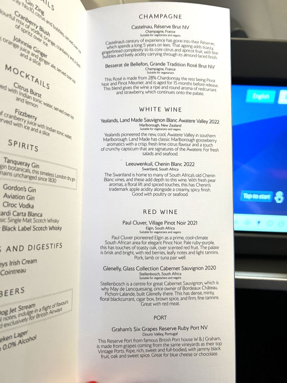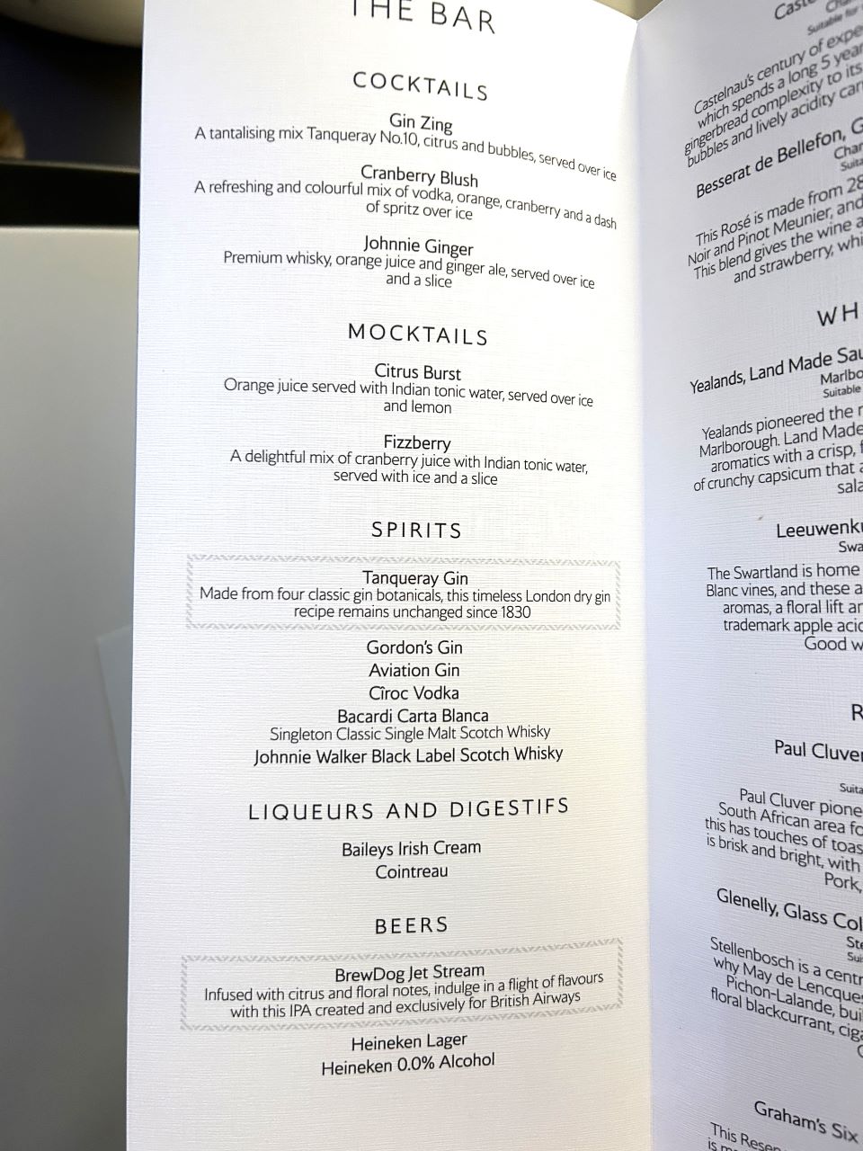 It is worth noting there is still no sign of Cognac (allegedly a supply chain issue – for this long?) on the BA Club menu. Yet having flown Air France and KLM in the last couple of weeks and Qatar in November, they seem to manage to get cognac just fine.