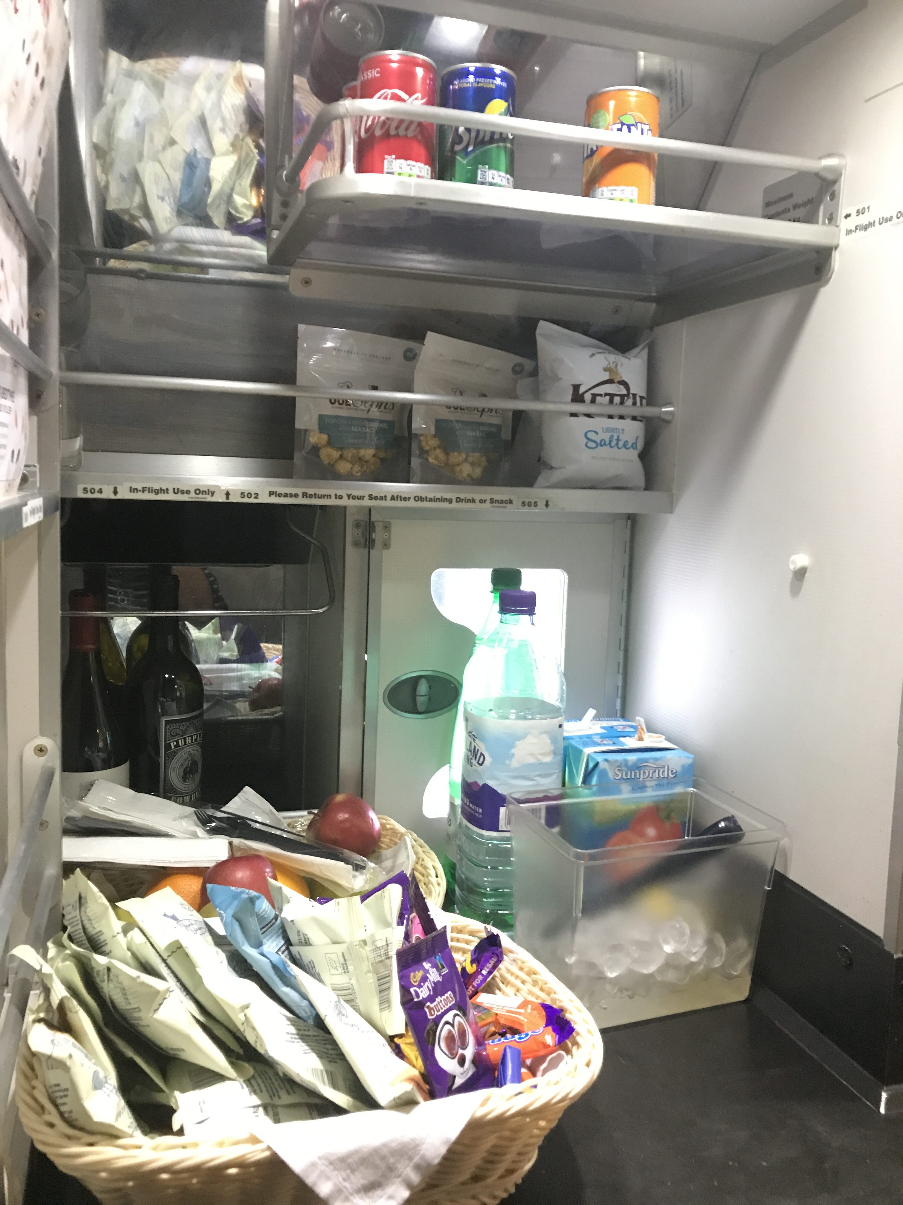 Later in the flight, I went to have a look at the Club Kitchen since I haven’t included many photos before. As a longer flight, this had a pretty good selection of food. These included in the fridge: ice cream, yoghurts, fresh fruit, pasta salad, cakes, sandwiches and a hummus snack pack. Outside the fridge were salted caramel popcorn (my favourite), crisps, chocolate, fruit, drinks and wine.