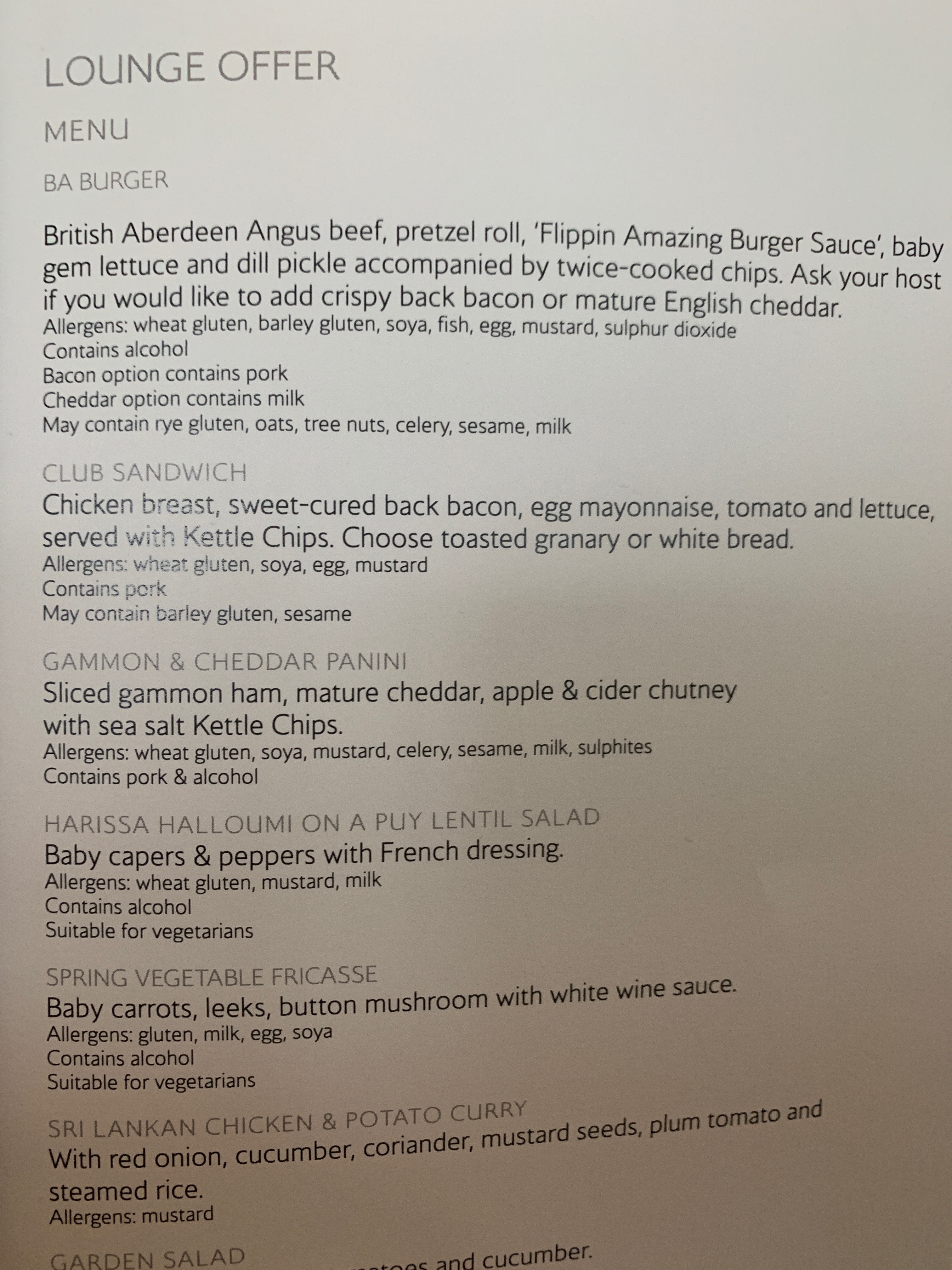 The Concorde Room is for First class passengers and GGL card holders. On the first leg to Milan, I would have been only entitled to Galleries First as I am a Gold card holder. Fortunately, Deputy Editor Paul is a GGL and Concorde Room card holder so he guested me in that morning. I had a quick bacon roll which was served with hash browns and was very average. Later on, when we were back from Milan and before the Singapore flight, we had a late lunch. Here is the menu: