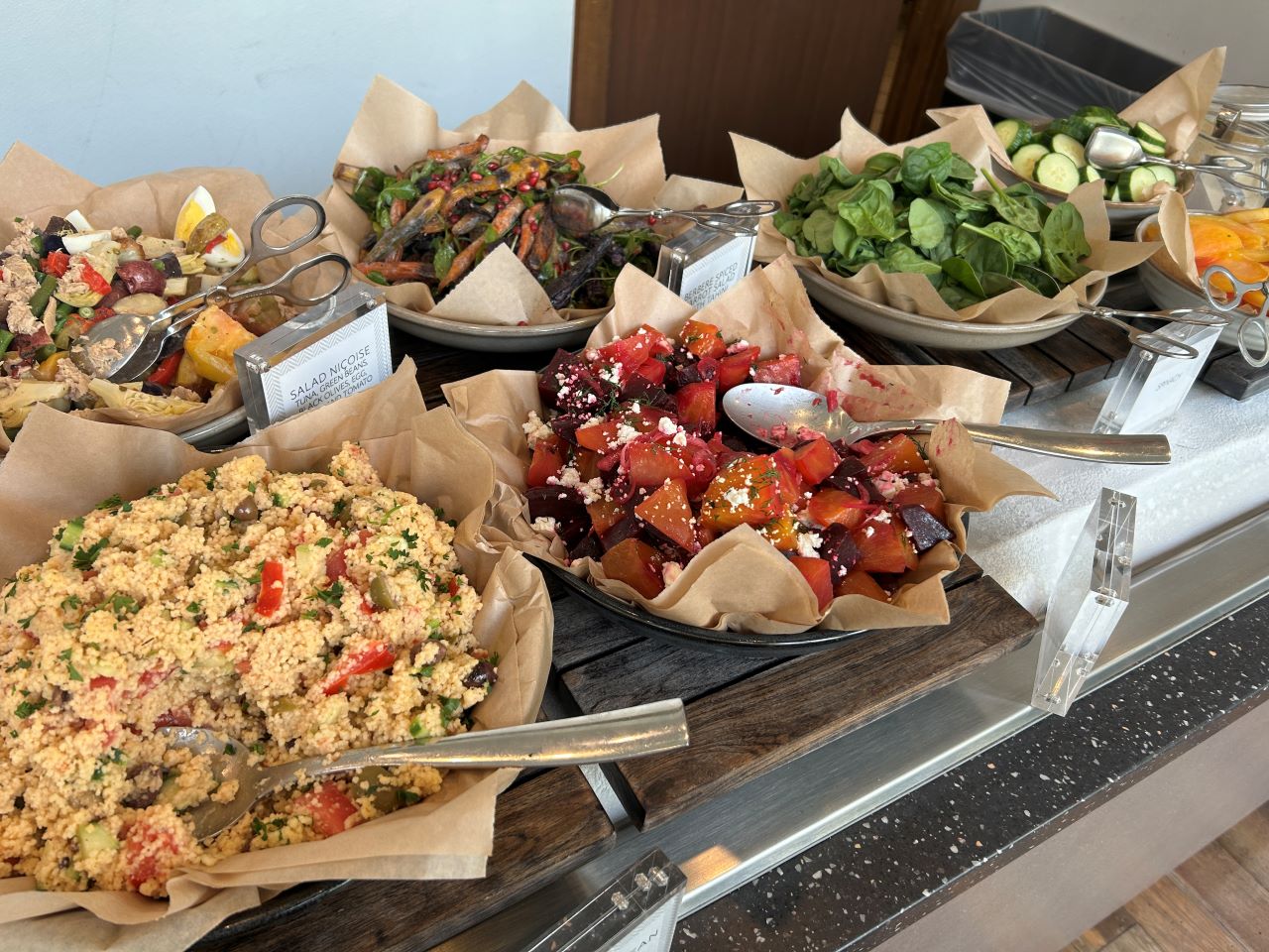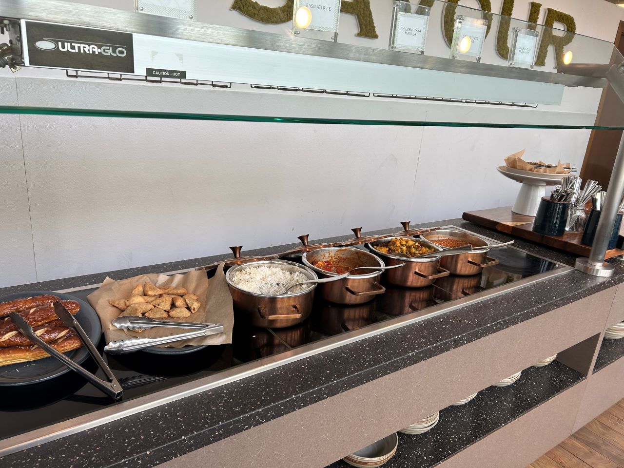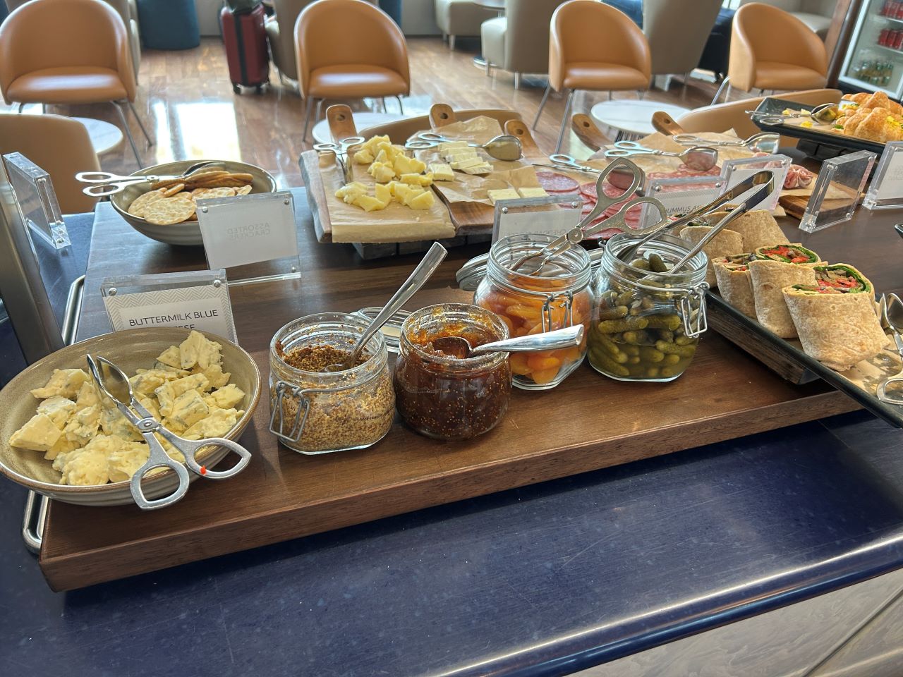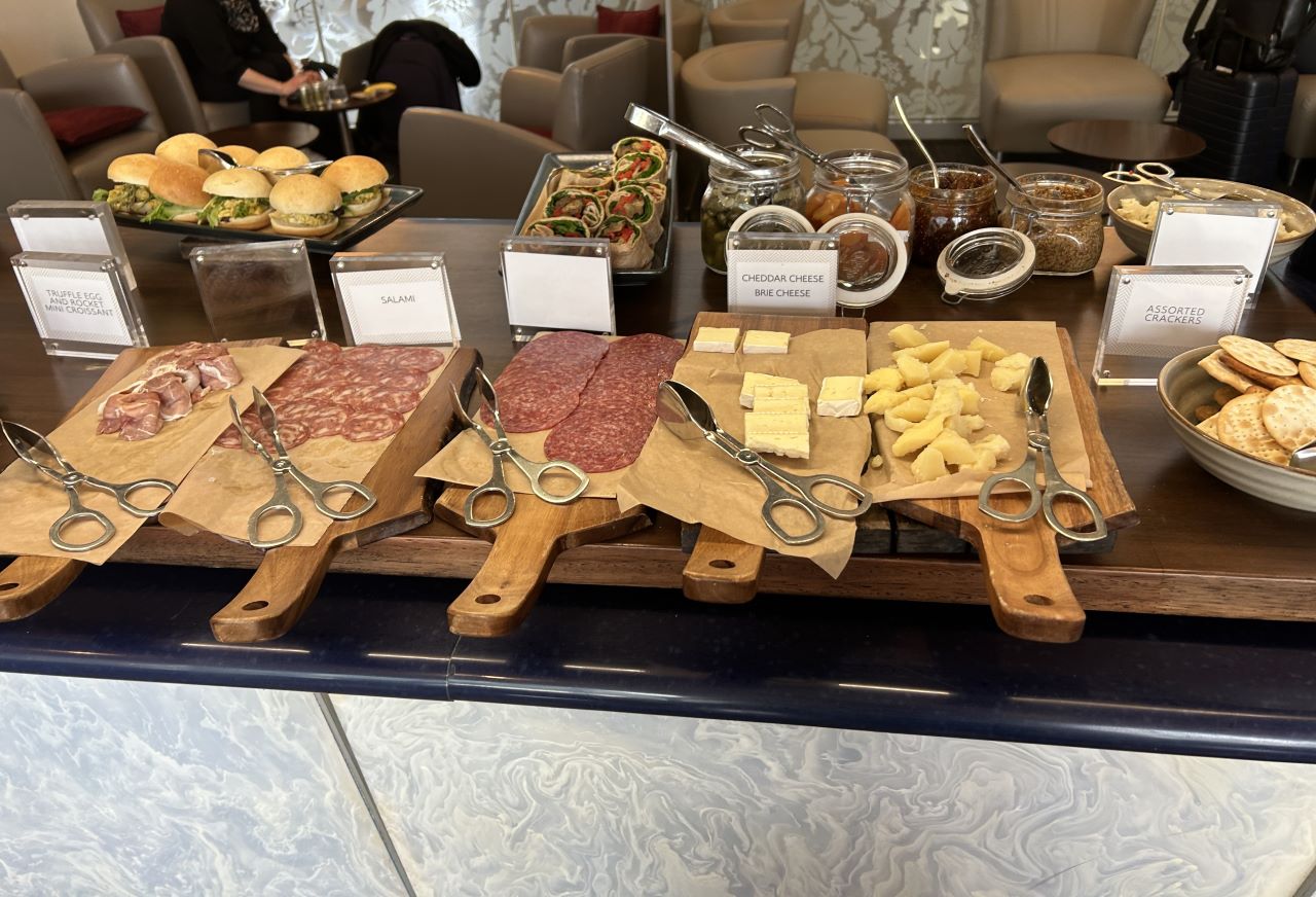 The food and drink selection was also pretty good, although they didn’t offer a pre-flight/first dining area like some places. However, if you wanted to go to sleep straight away, there was more than enough to fill you up. Everything was beautifully presented and looked appealing. There was a lovely cheese and charcuterie selection, salad bar, desserts and hot food, including dahl, chicken tikka masala, cauliflower korma, samosas and soft pretzels. There were also sandwiches, crisps and some tempting looking cakes and eclairs.