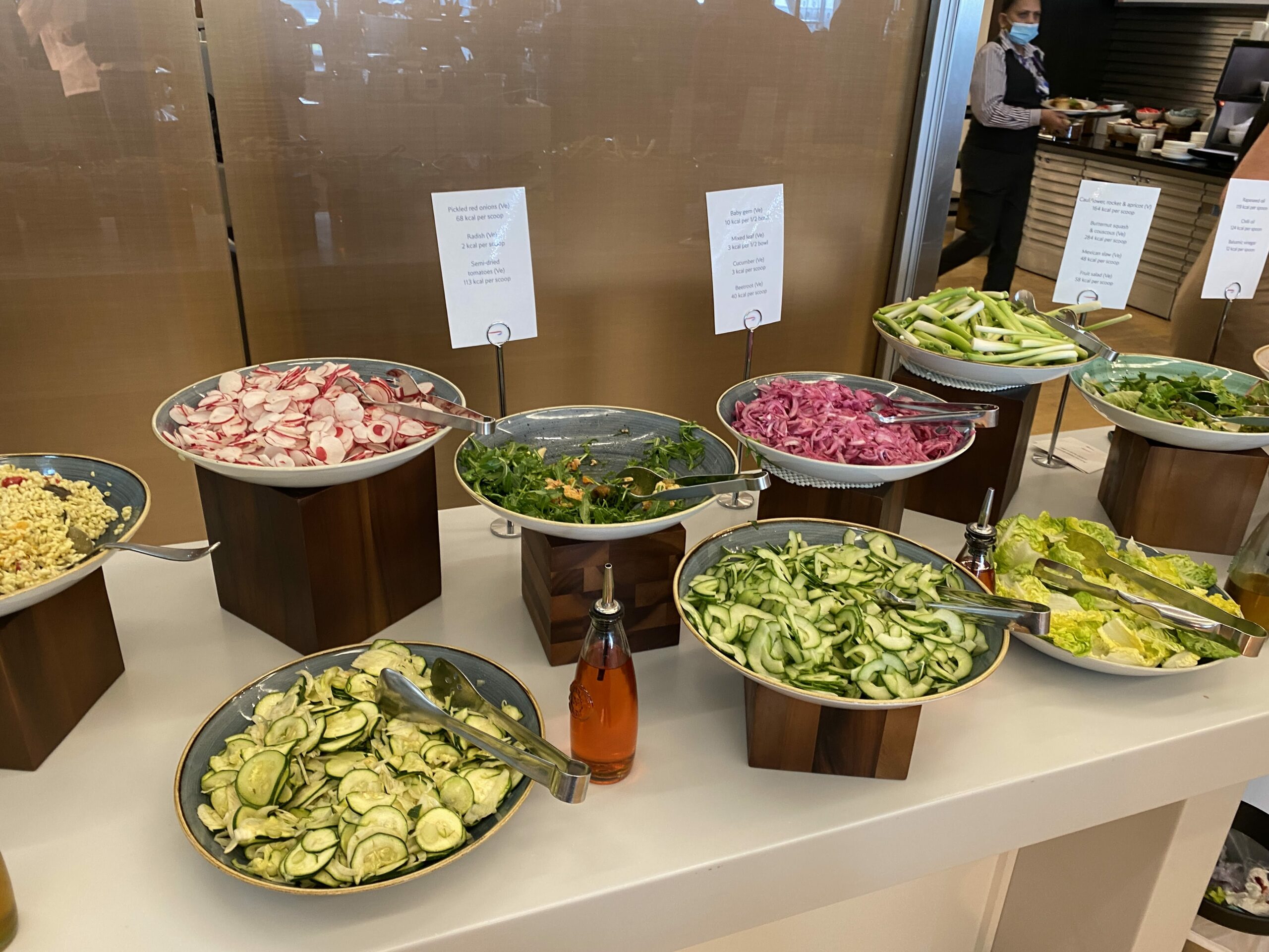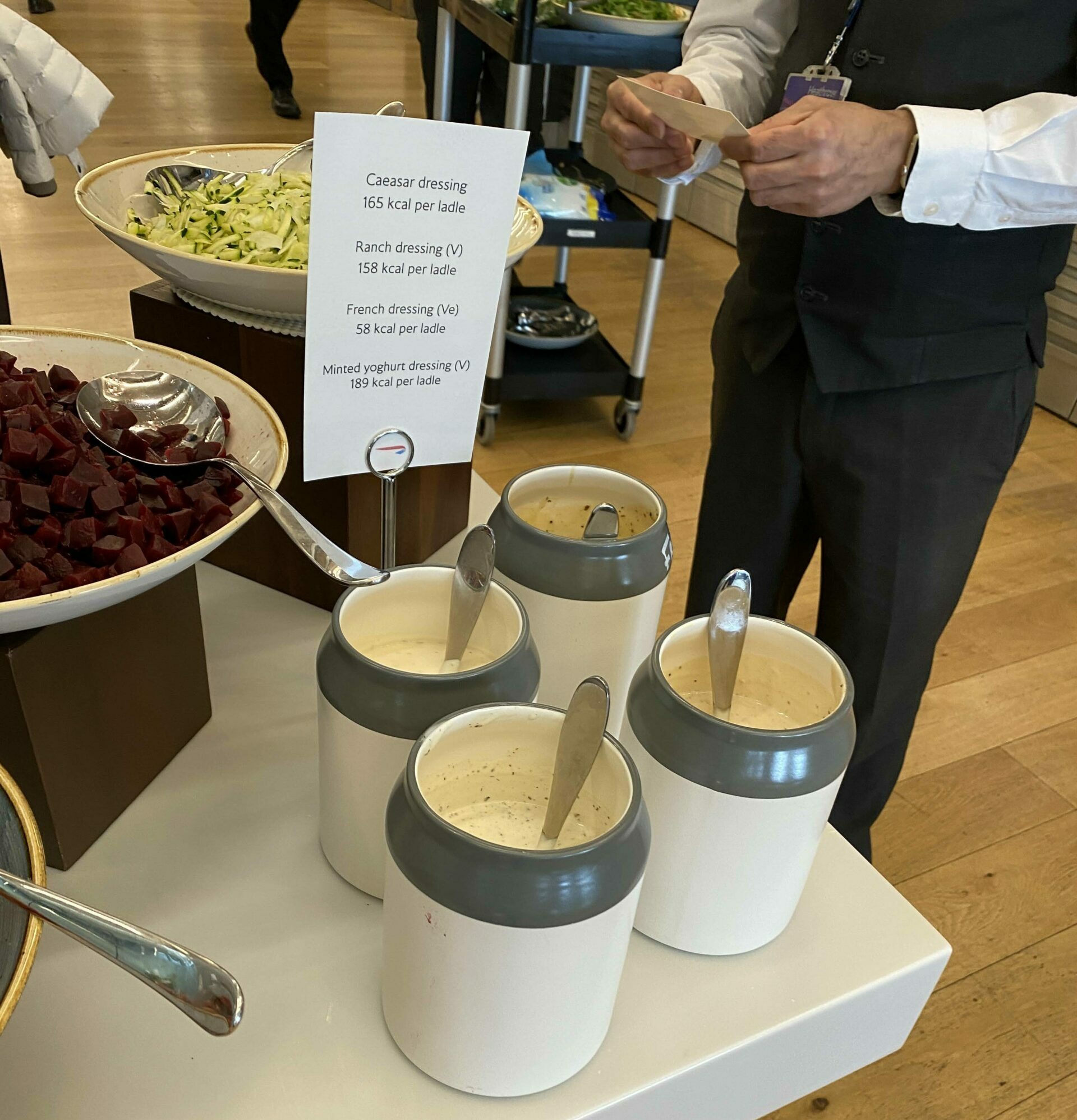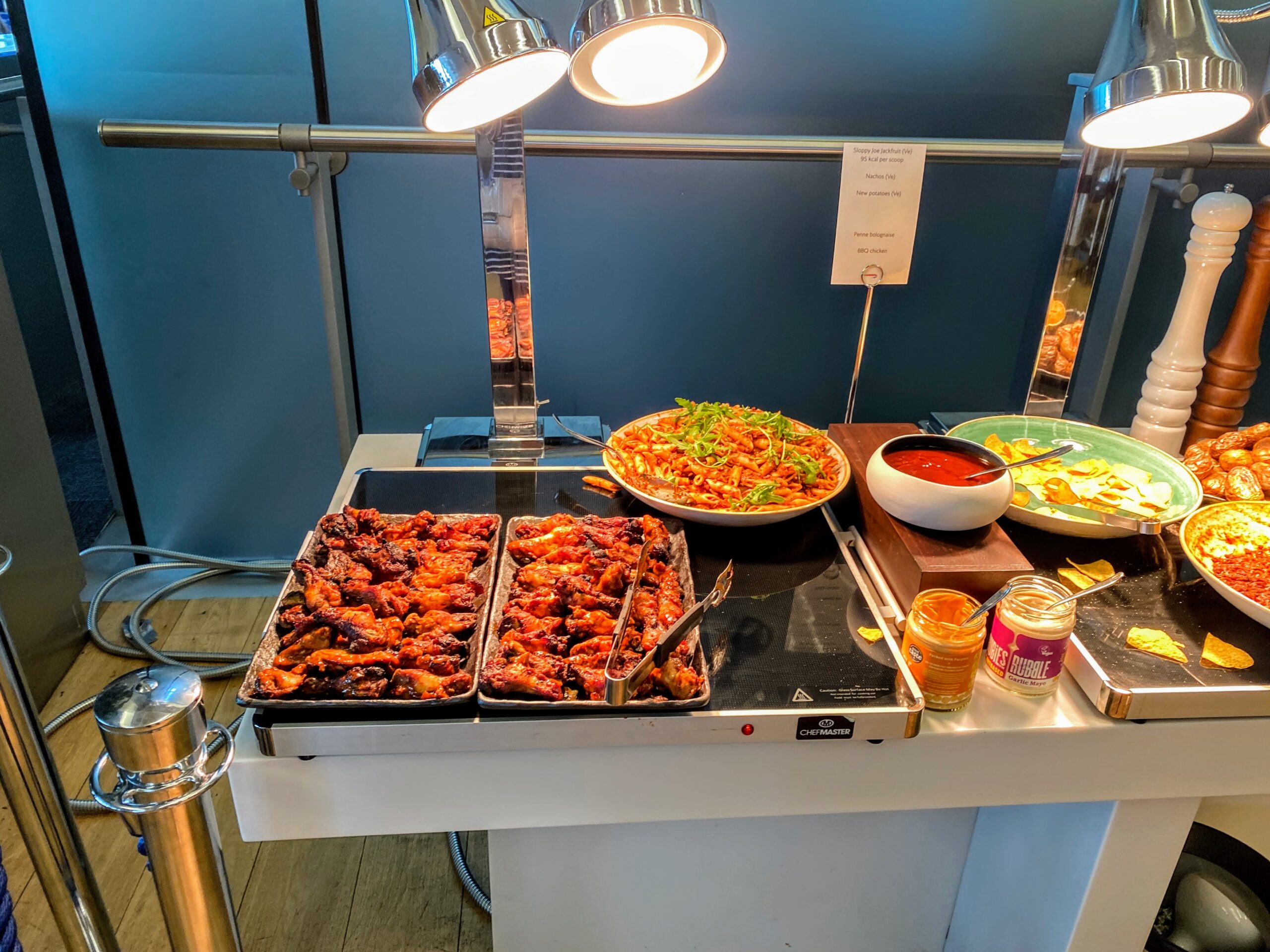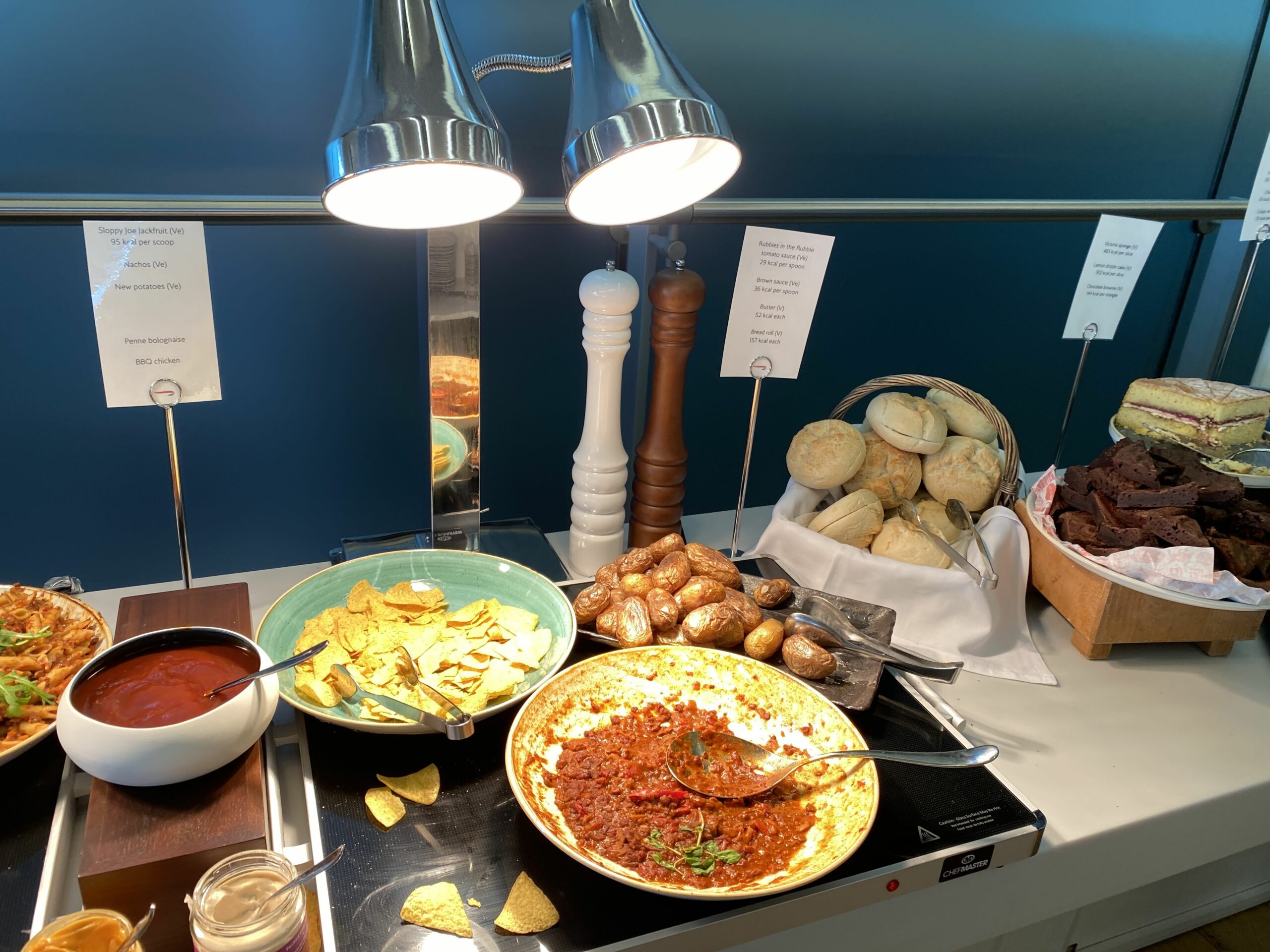 There has been a fairly big change over the last few weeks with not only drinks available to pour yourself but now a rather tempting looking buffet has appeared. This actually looks a bit better than before! It’s situated by where the sandwiches used to be next to the (empty) newspaper rack and TV screens rather than at the back where the food used to be.
