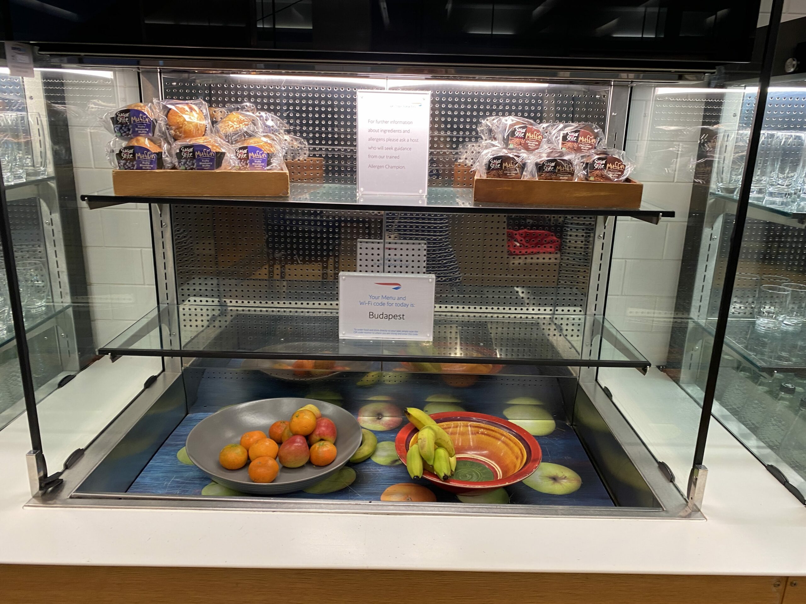Update on the breakfast. I am in the lounge earlier this morning and the online breakfast is actually very good, including the full English. The online hot beverages AM is also excellent. The hot breakfast on the new buffet is pretty bizarre, two lines of rashers of bacon with a line of sausage patties in the middle, no eggs, so it’s butties only.