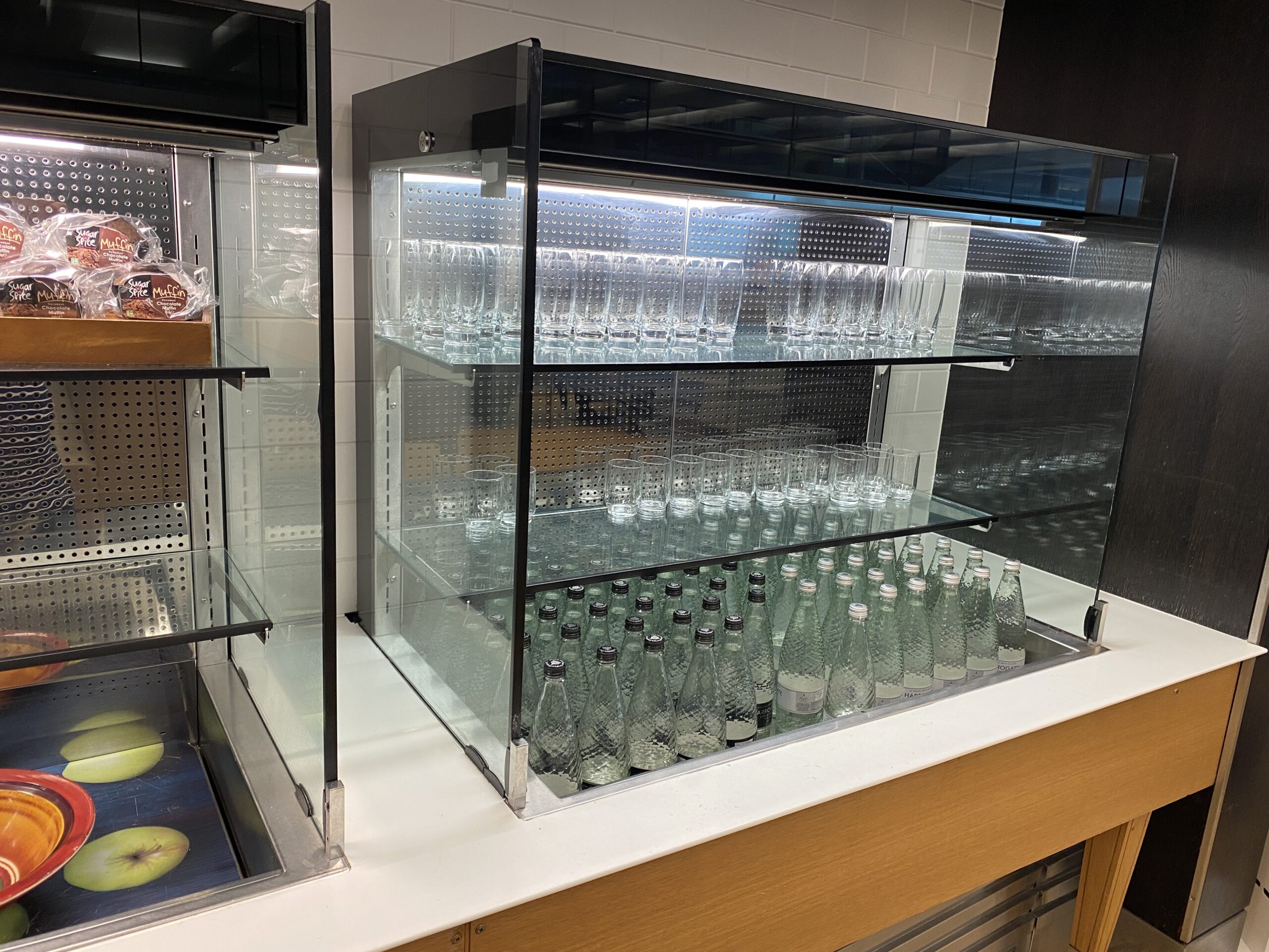 Further down there are chilled cabinets with still and sparkling water as well as fruit and muffins.