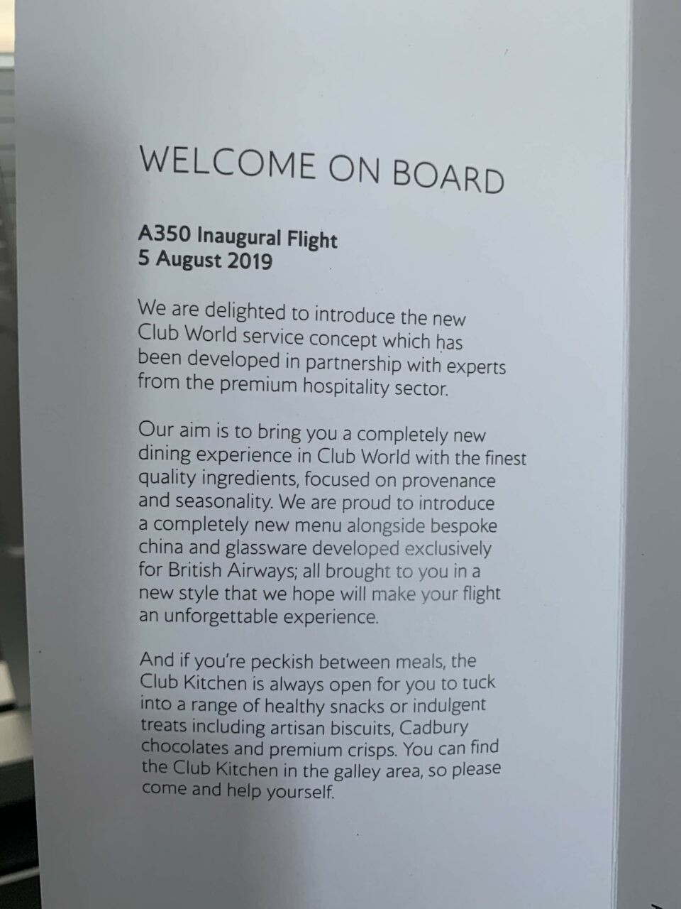 As this was the inaugural flight, the service was a bit of mash-up of Club Europe and Club World. It was mainly Club World rather than Club Europe, so this should give a fair indication of the actual service. At the seat was a certificate for being on the inaugural flight.