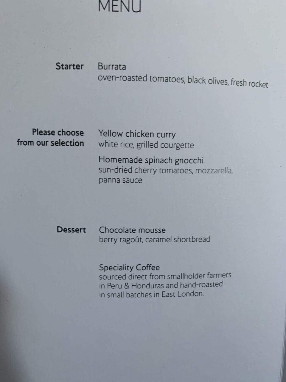We were served lunch from a special menu, which was a bit like a one tray version of a Club World service.