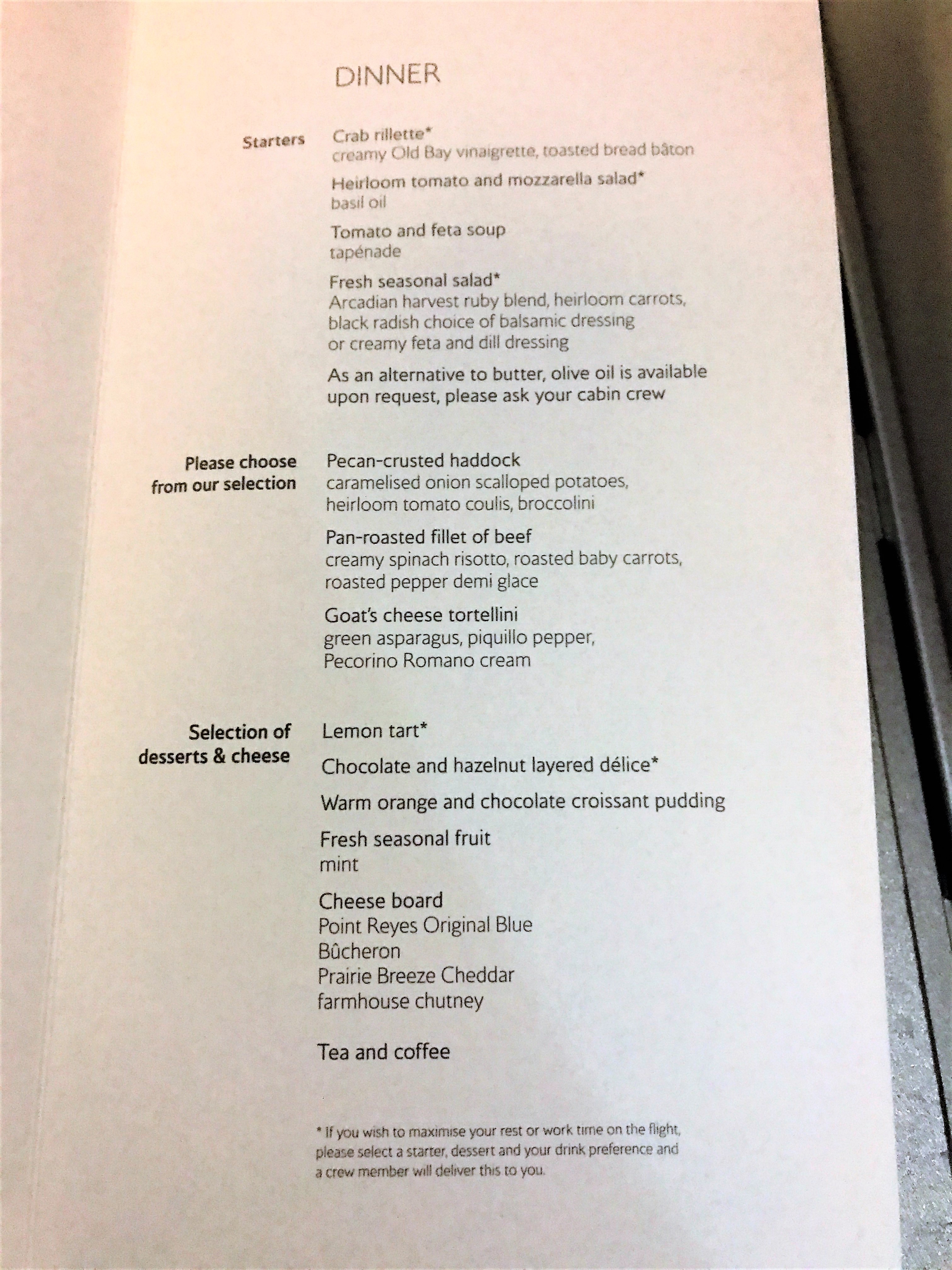 There was the option of a full second meal on this flight. I still don’t really see the need for a full meal for the second service but the menu for this one did look tempting with lots of light sounding options: