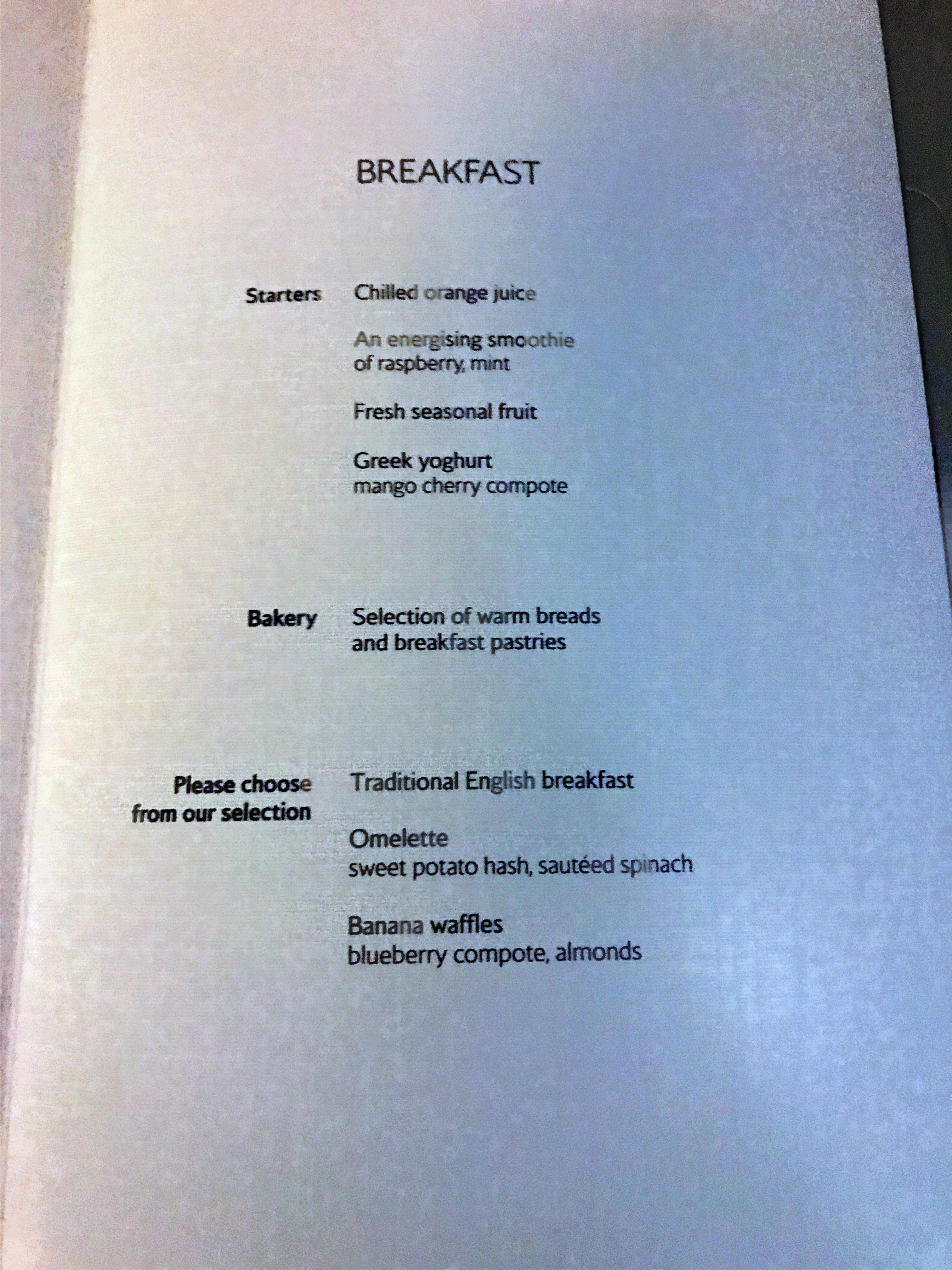 As I had had a light dinner I was ready for breakfast in the morning. I must admit I usually find BA’s breakfast a disappointment and often don’t bother since you can get more sleep and then have breakfast in the lounge (particularly recommended if you are arriving at T3 and can use the wonderful American Airlines arrival lounge.)