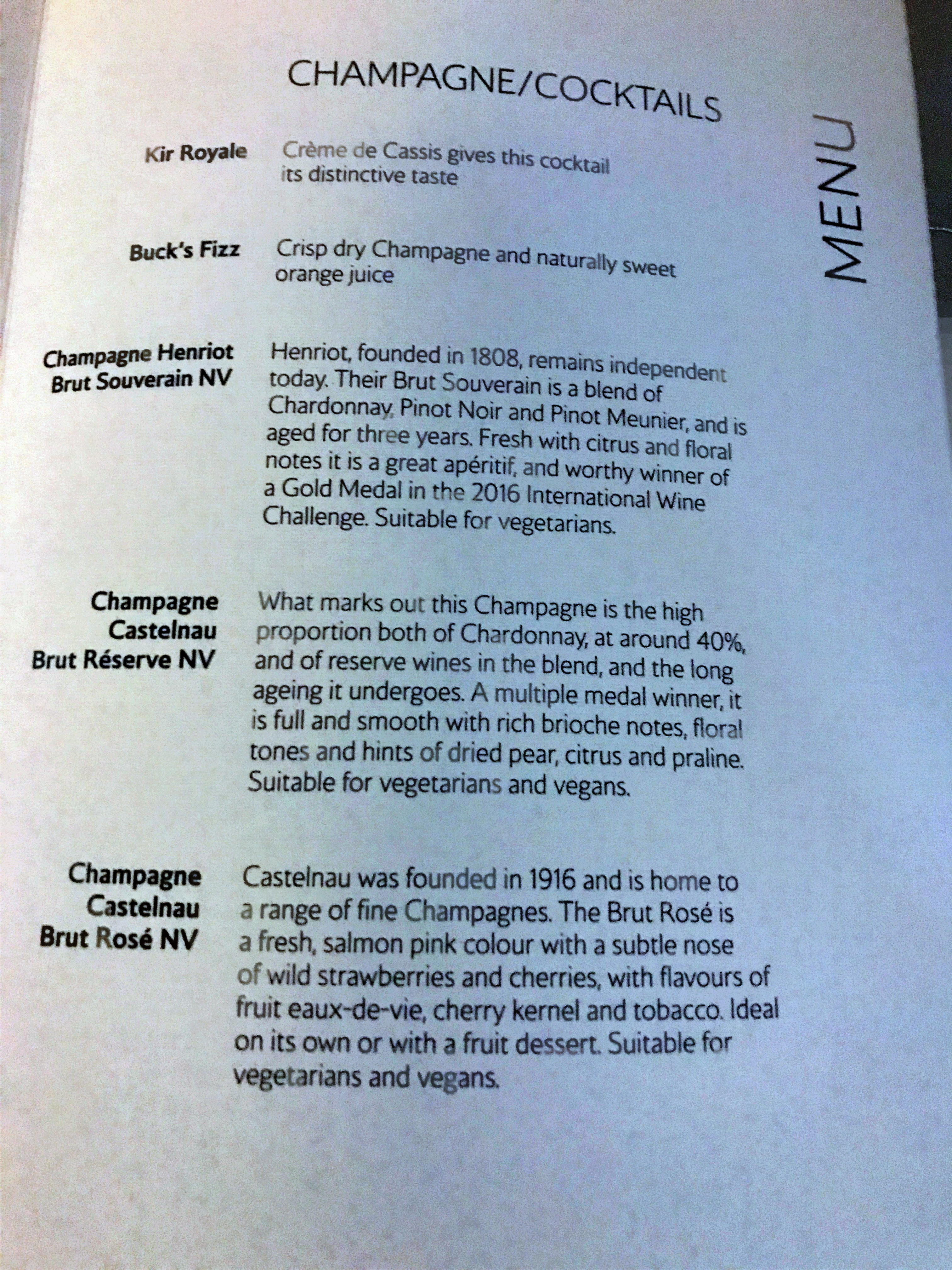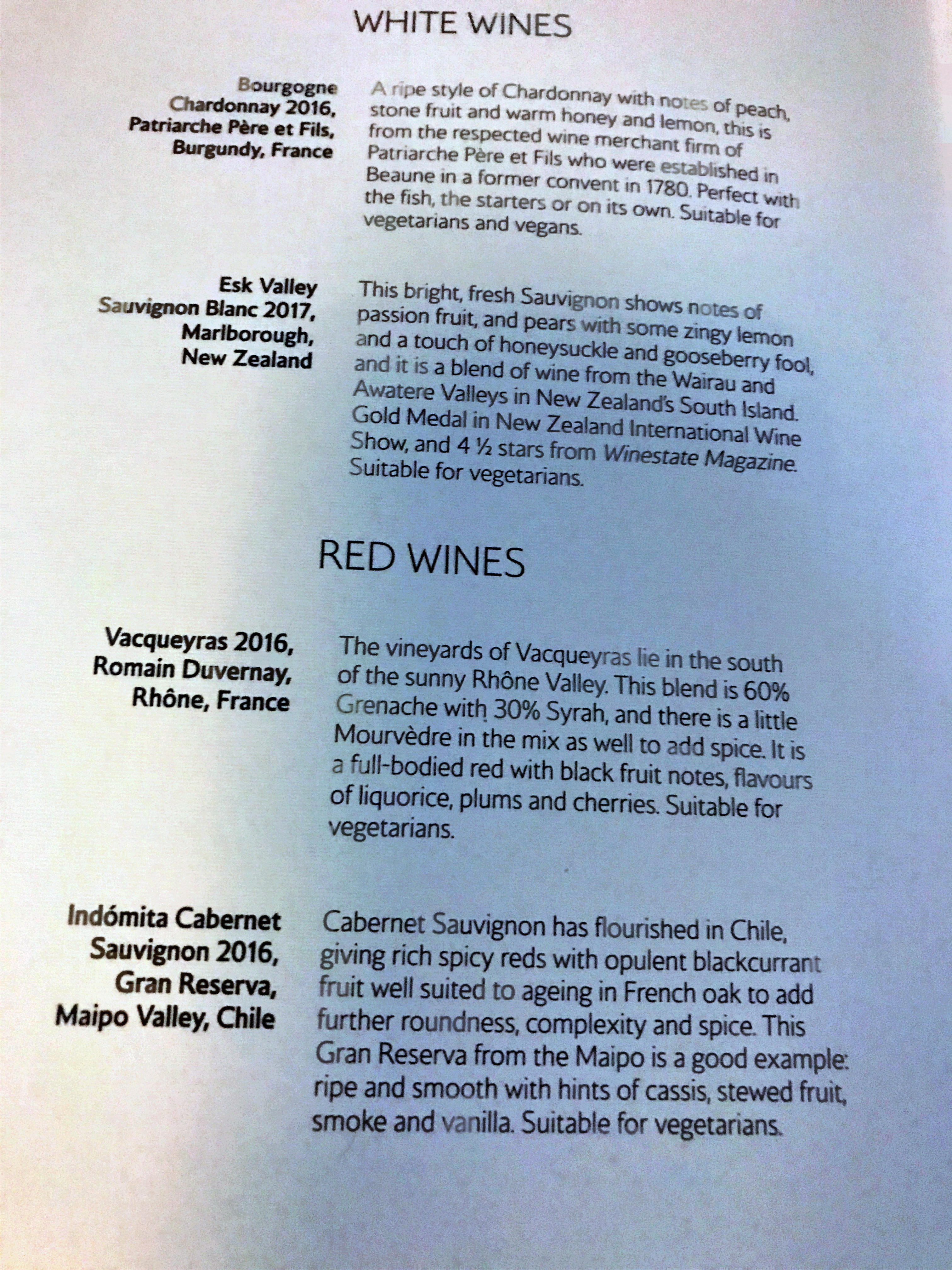 The menu had the same format as my previous flights with a larger choice of starters and desserts but only 3 main courses. This seems to be fairly consistently beef, fish and a vegetarian option which is often pasta. I have to say I would rather they reduced the number of dessert options and increased the main courses. I am not usually a huge fan of fish meals on aircraft and don’t want to eat beef every time so that only leaves the vegi option. I think 5 desserts is way too much choice!