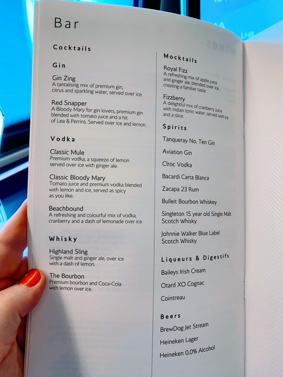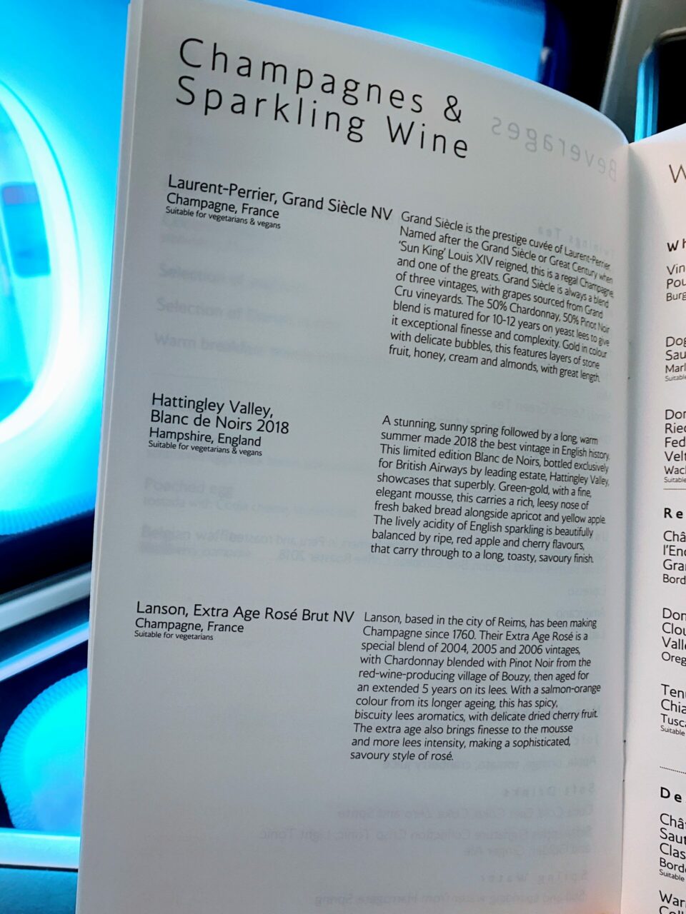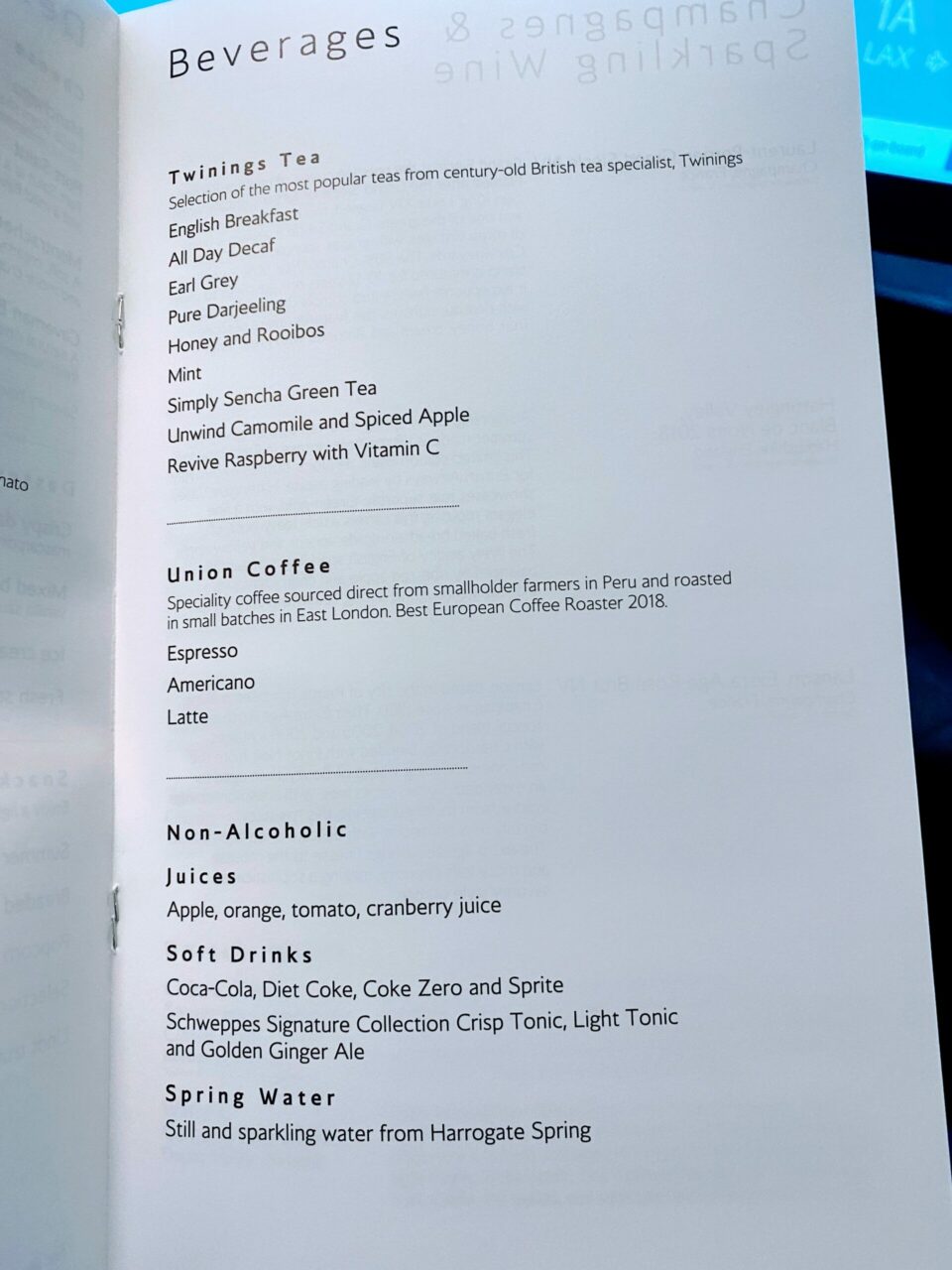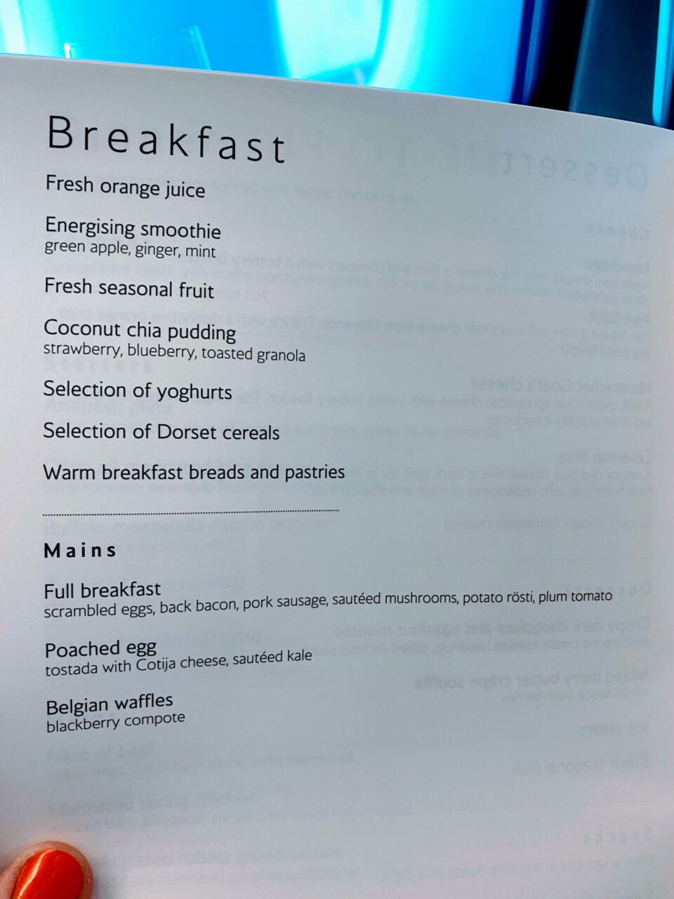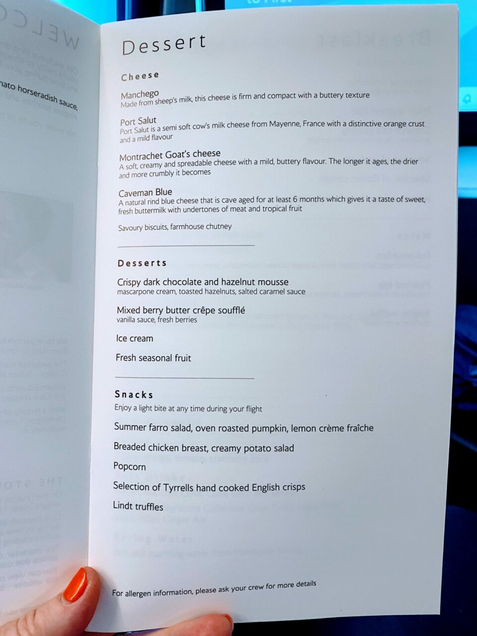 I was also given the menu with my champagne. No nuts were offered, although seeing as they are now the Club Europe ones which I don’t like, I wasn’t bothered.