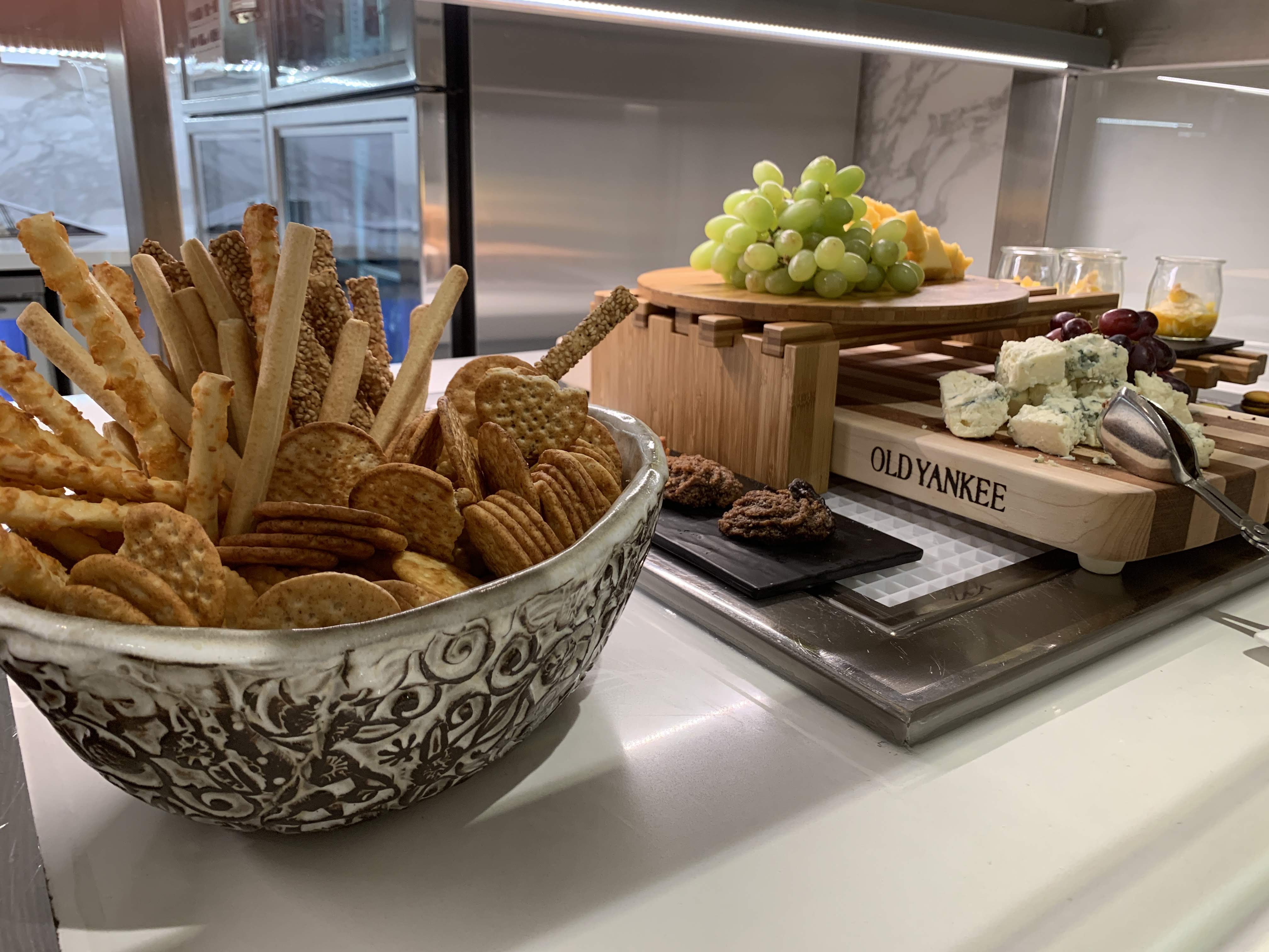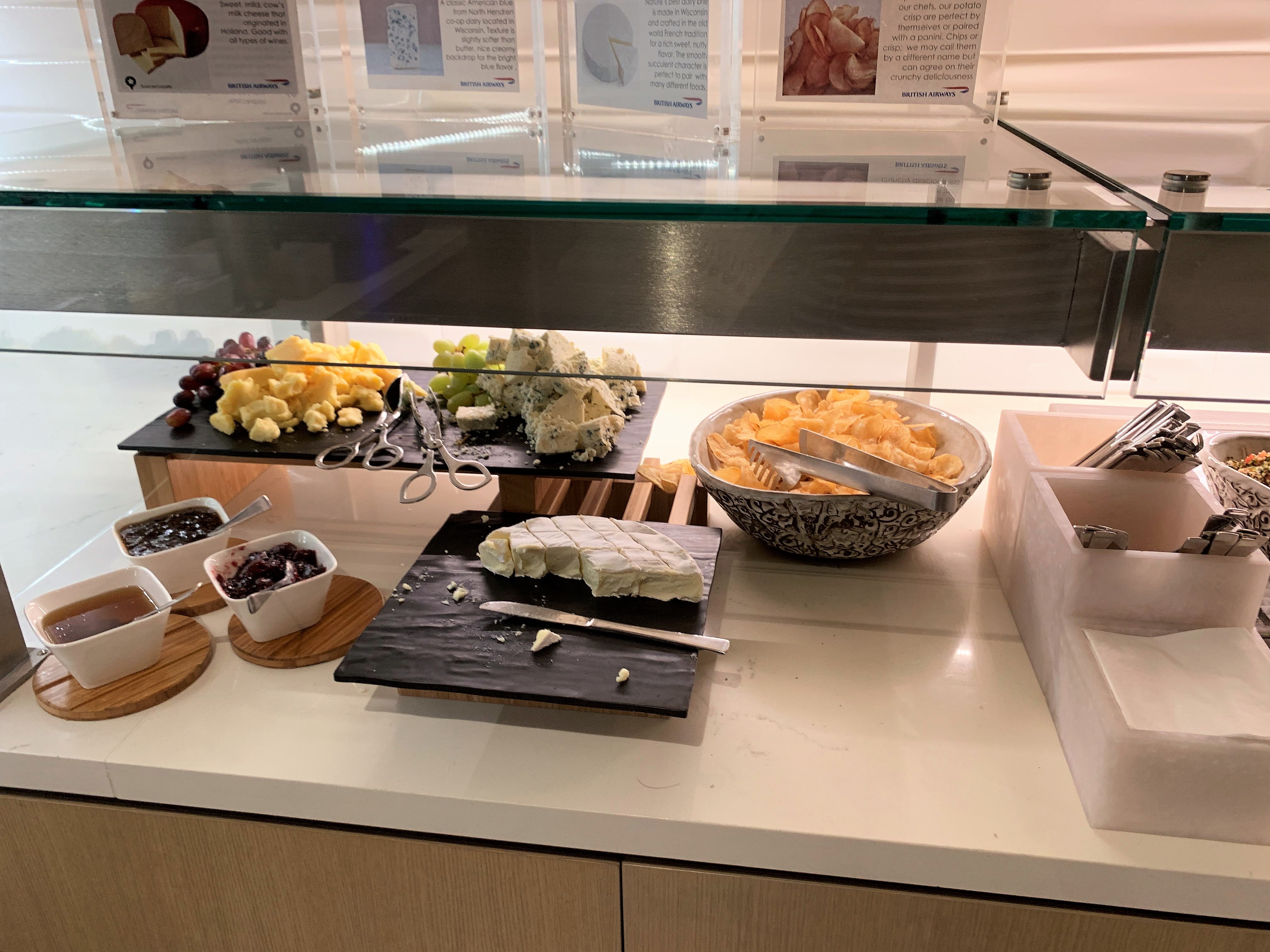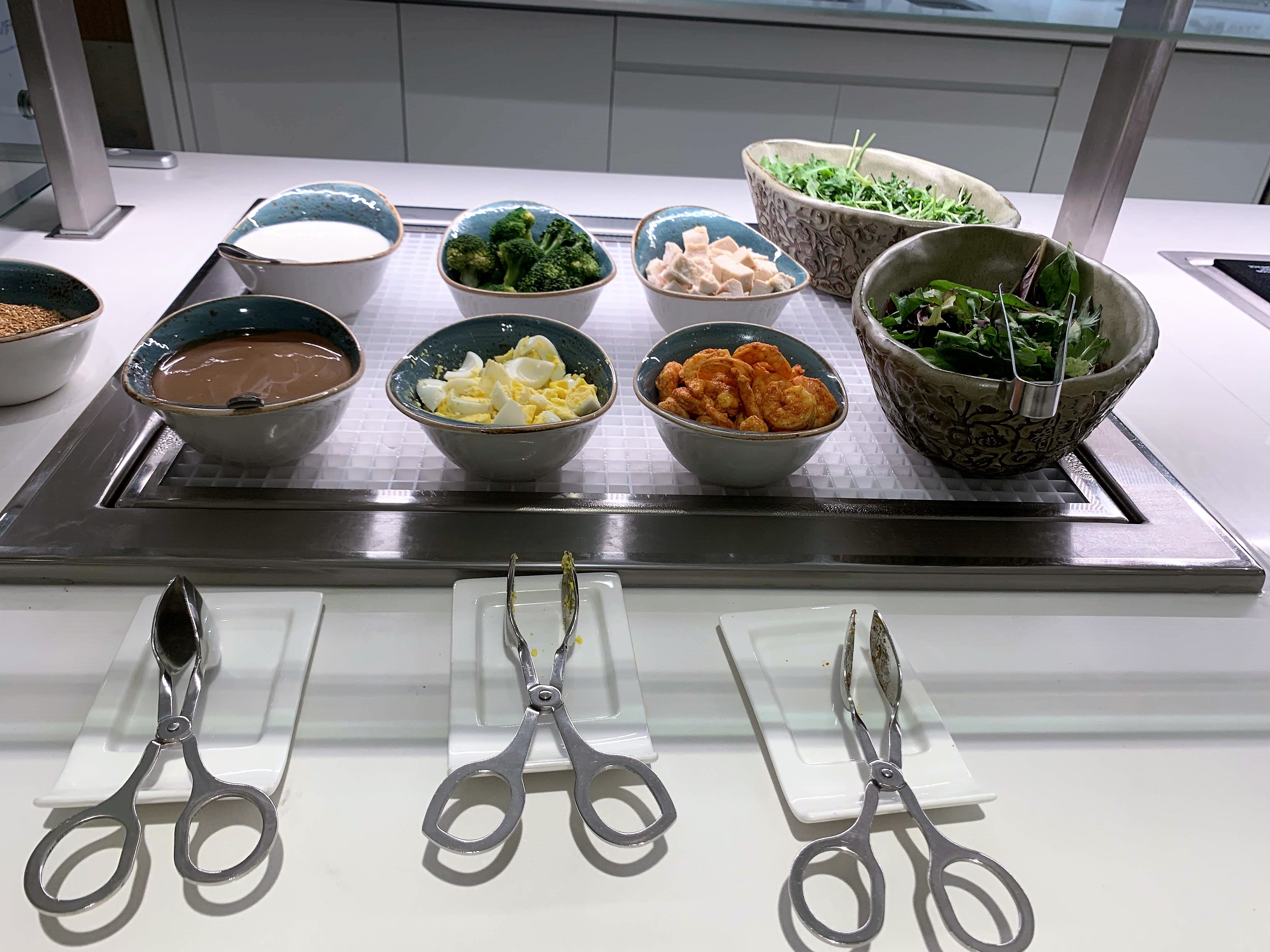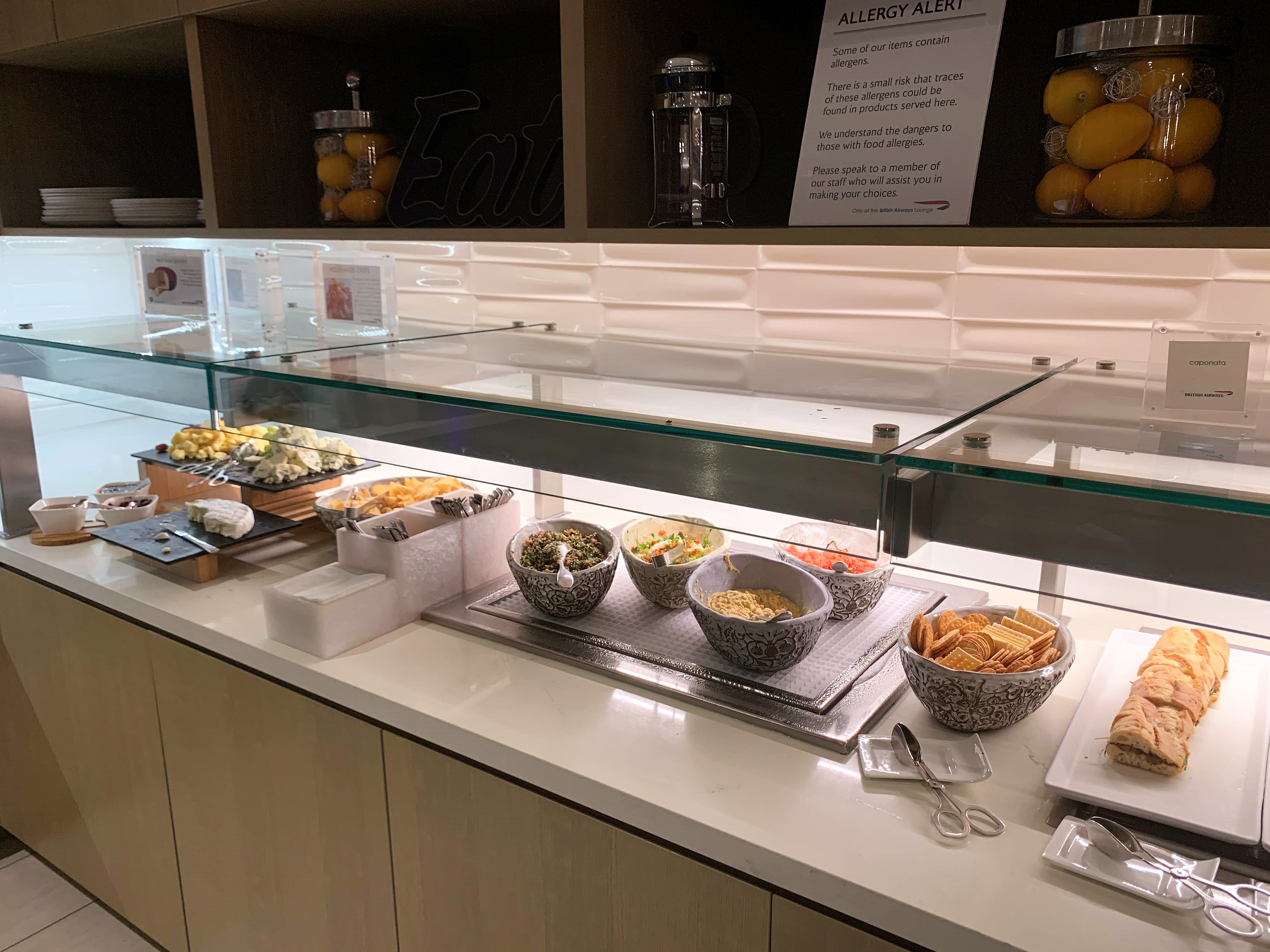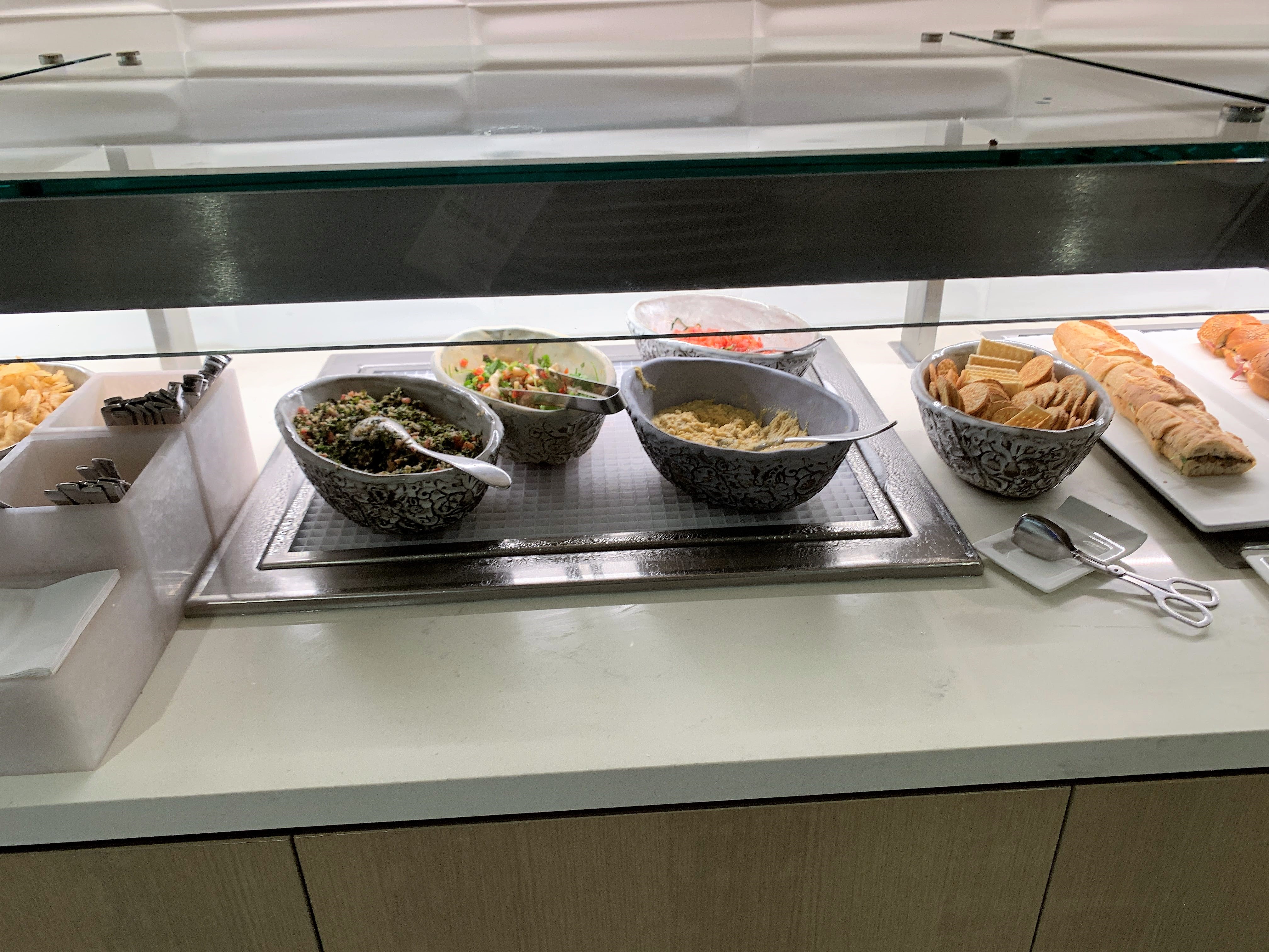 Like the Club Lounge there were snacks on offer in the lounge but more substantial and hot food in the dedicated pre-flight ‘Boutique’ dining area. In the lounge were salads, dips, sandwiches and cheese. There were also self-service coffee machines.