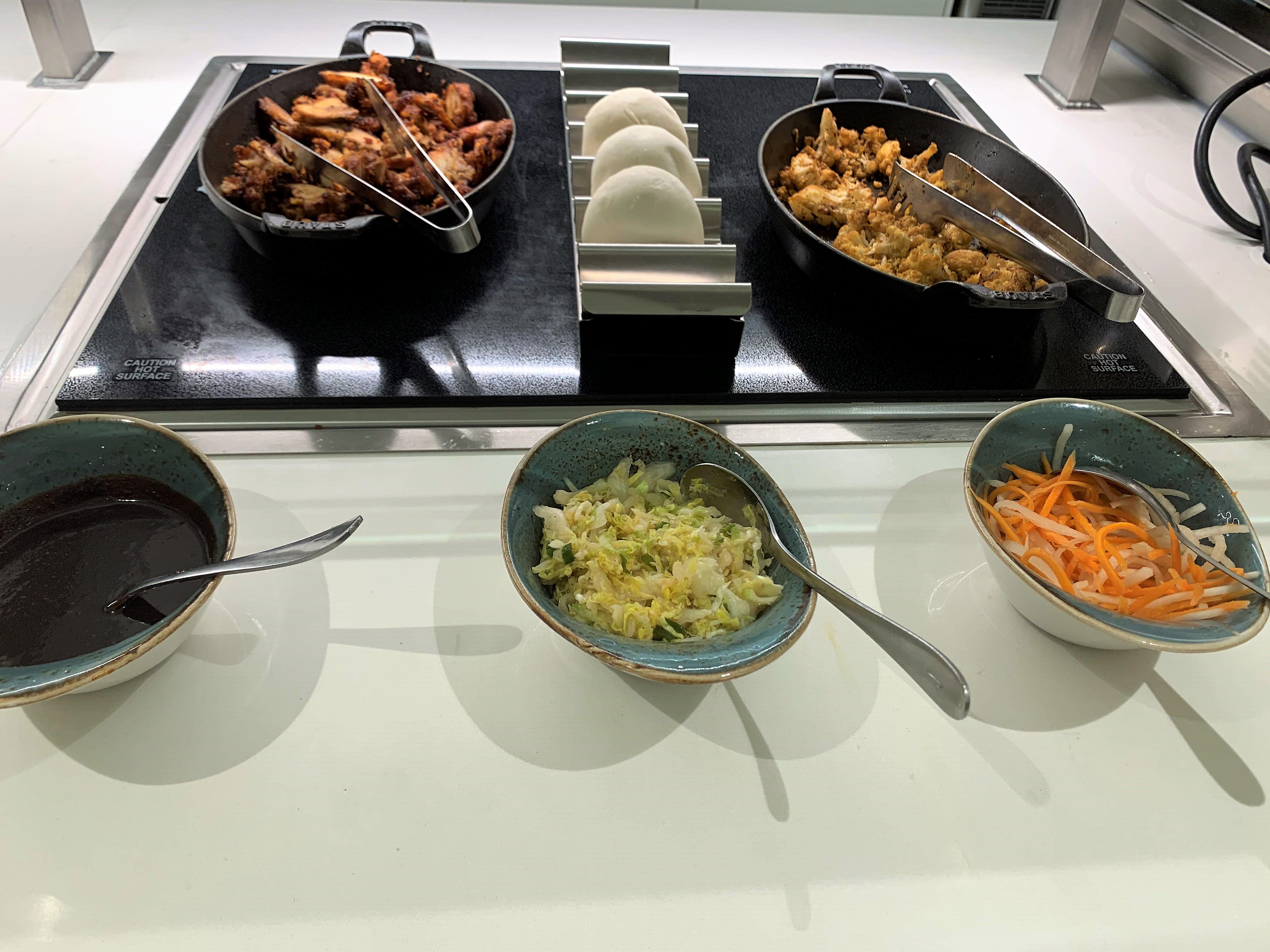 The food on offer included a buffet with salads, curry, bao buns, fish, desserts and cheese.