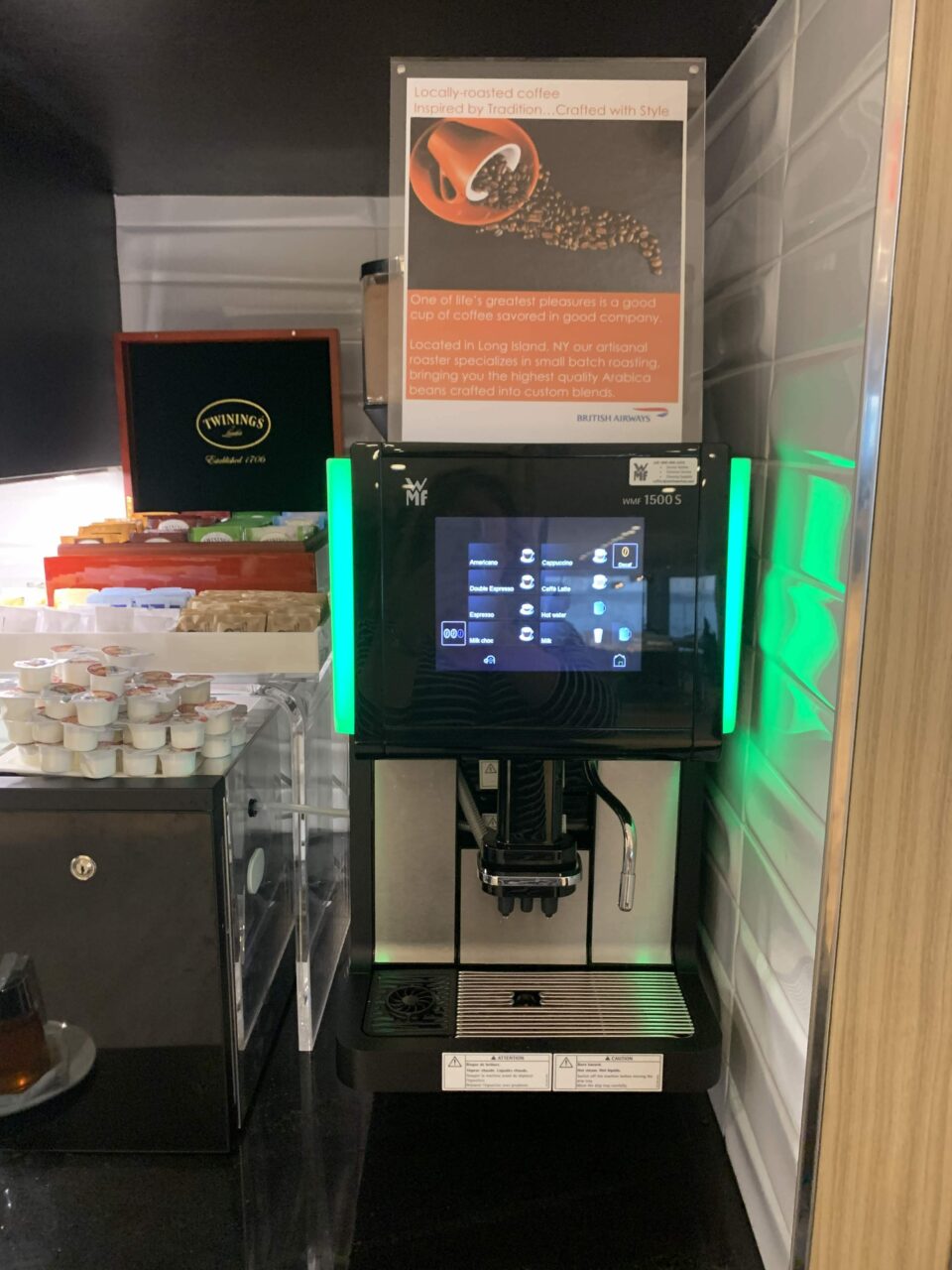 As you enter the lounge you are faced with the new Quaich bar, created in partnership with the Quaich bar at the Craigellachie Hotel in Speyside, Scotland. I liked the bar which was staffed by a very amiable bartender. As it felt like you are sitting at a ‘real’ bar it led to quite a convivial atmosphere with people chatting to the bartender. It reminded me of BA’s Rome lounge in decor which is not surprising as that was meant to be the blueprint for future lounges. The style is clean and modern.