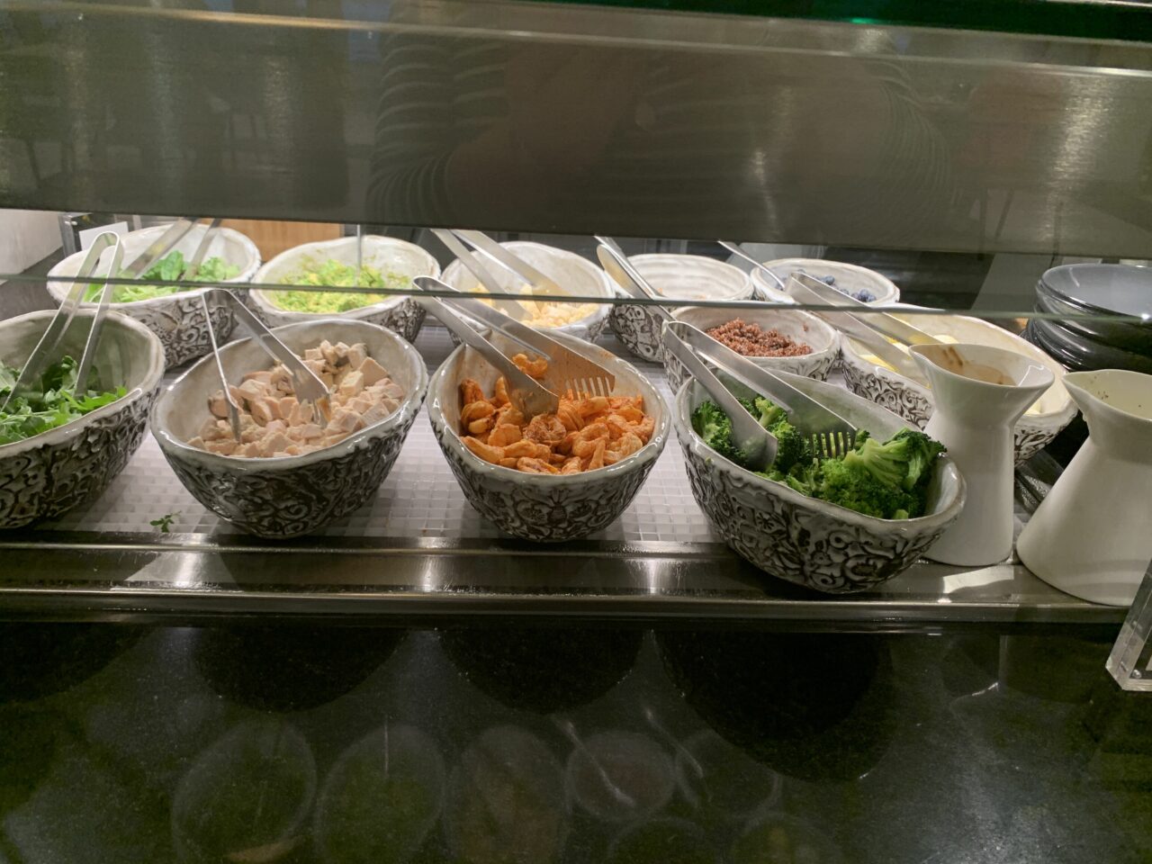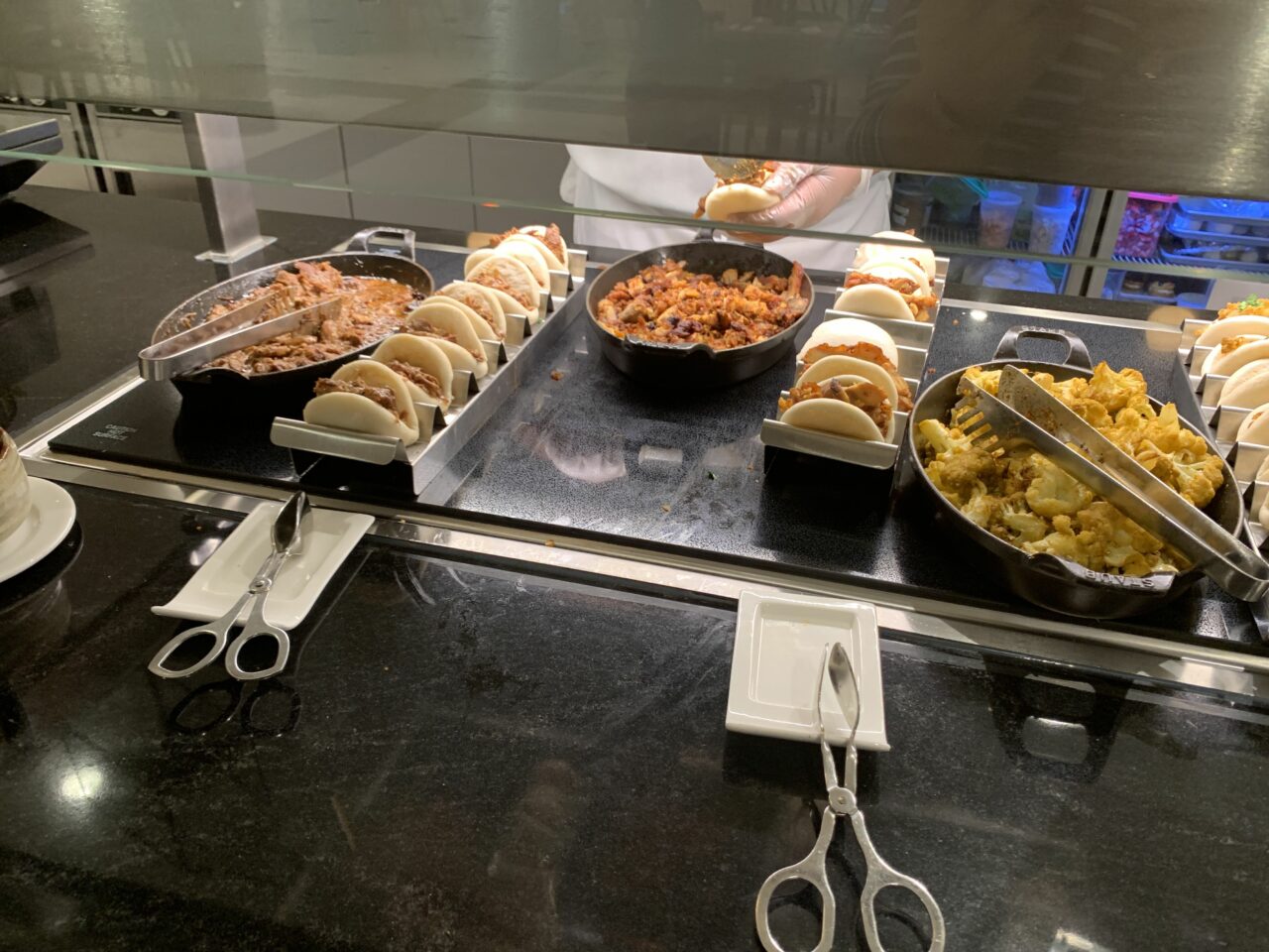 I tried quite a few items from the buffet. The bao buns were great, especially with the spicy sauce. There was quite a lot of spicy food with chicken curry, bao buns with chicken or pork, tandoori cauliflower, fish, a salad bar, soup, cheese and desserts. I have heard reports from two friends that the Impossible burger is very good too with the muffin working really well instead of the bun. Here is what it looks like: