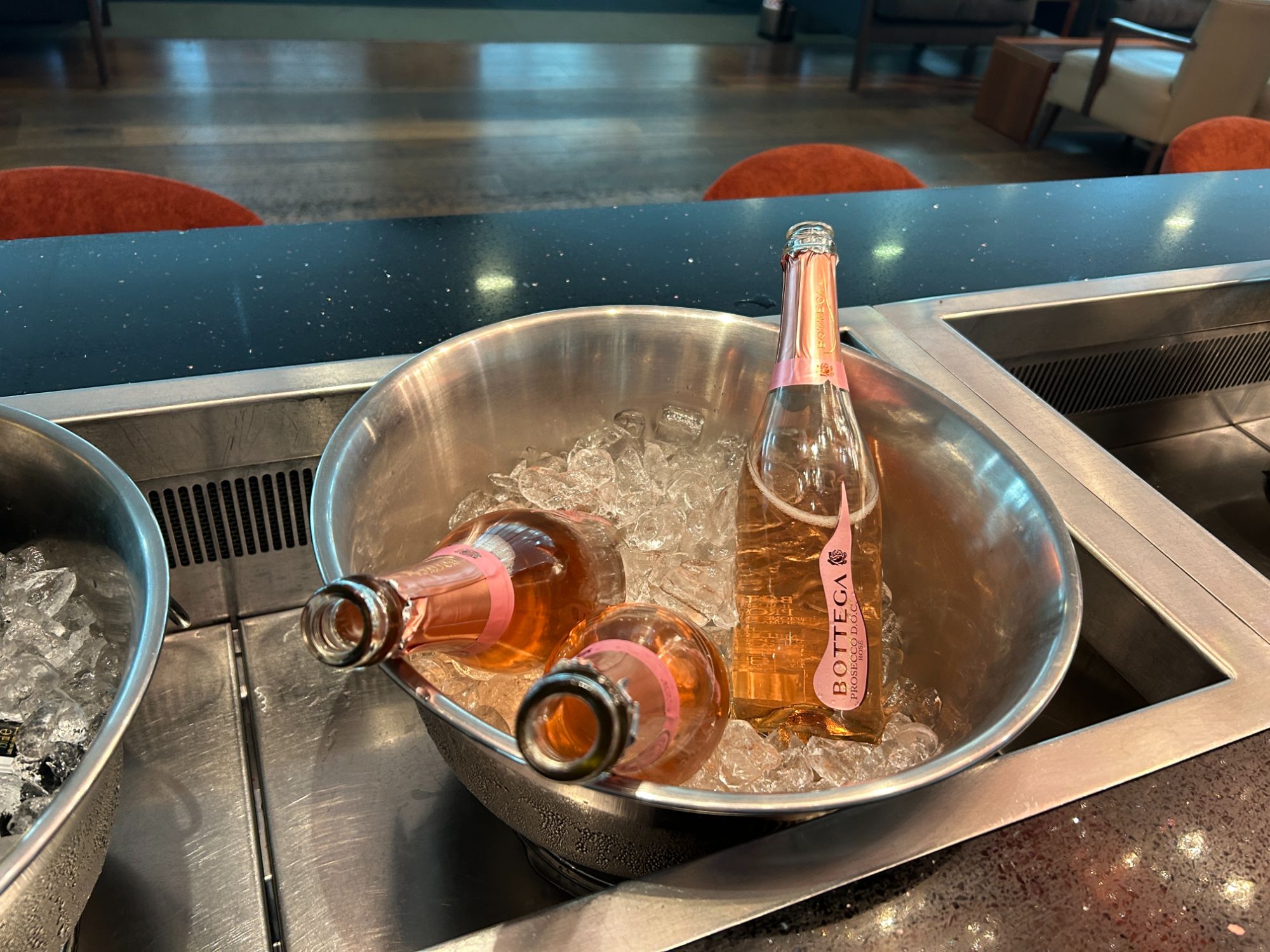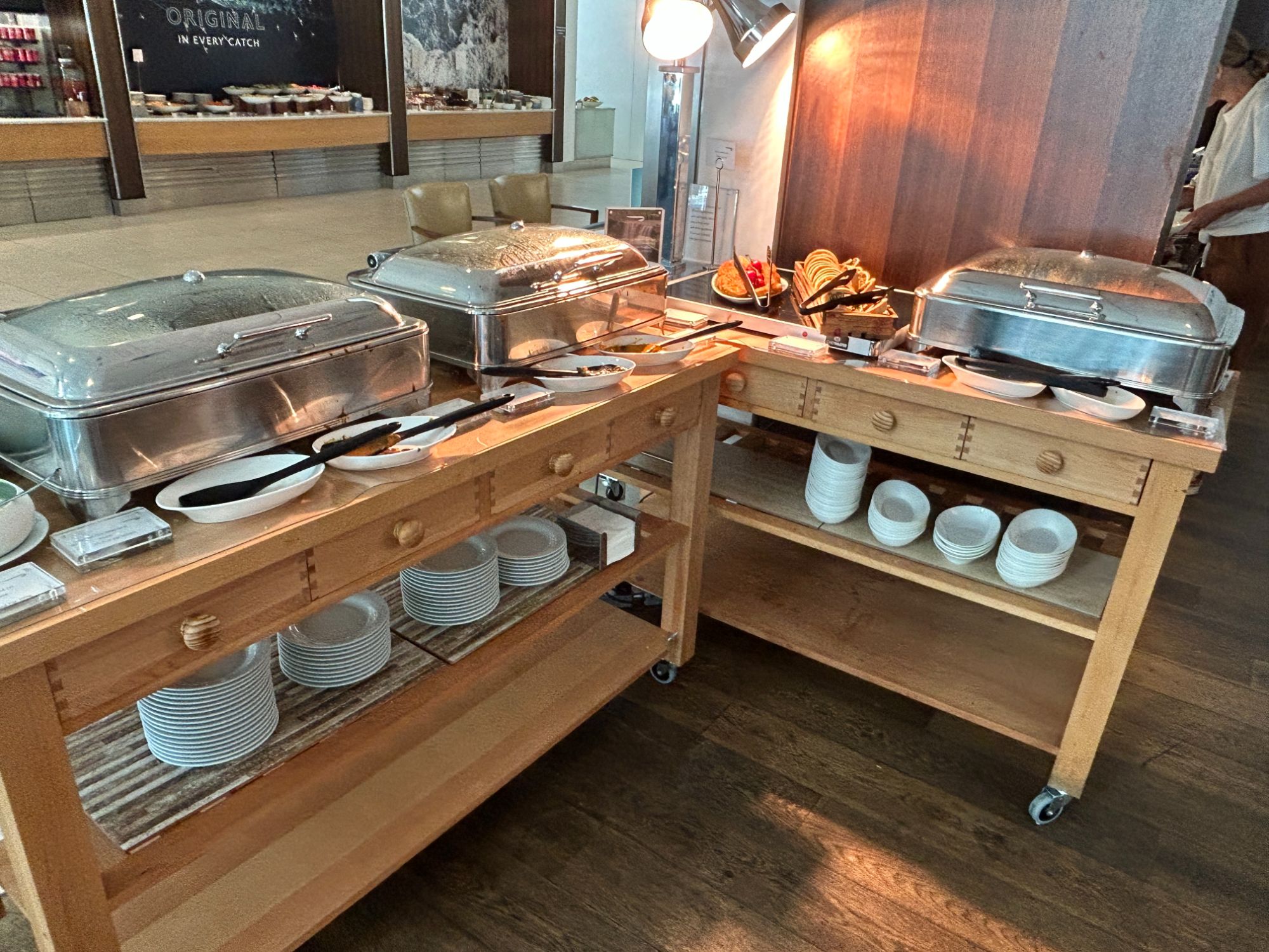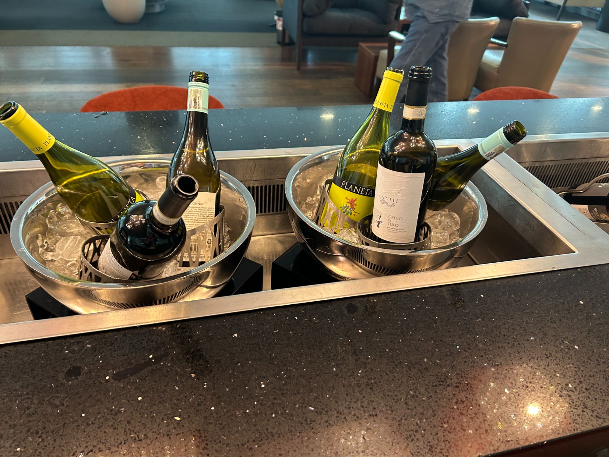 The lounge definitely looks fresher with its new furniture, but I am not totally sure about some of the design choices. As you enter, you can go left or right. If you go right from the lift, that takes you to the business area, Whispering Angel bar and the toilets. If you go left, you enter into the main part of the lounge by the food. Either way, you still end up in the main part of the lounge.