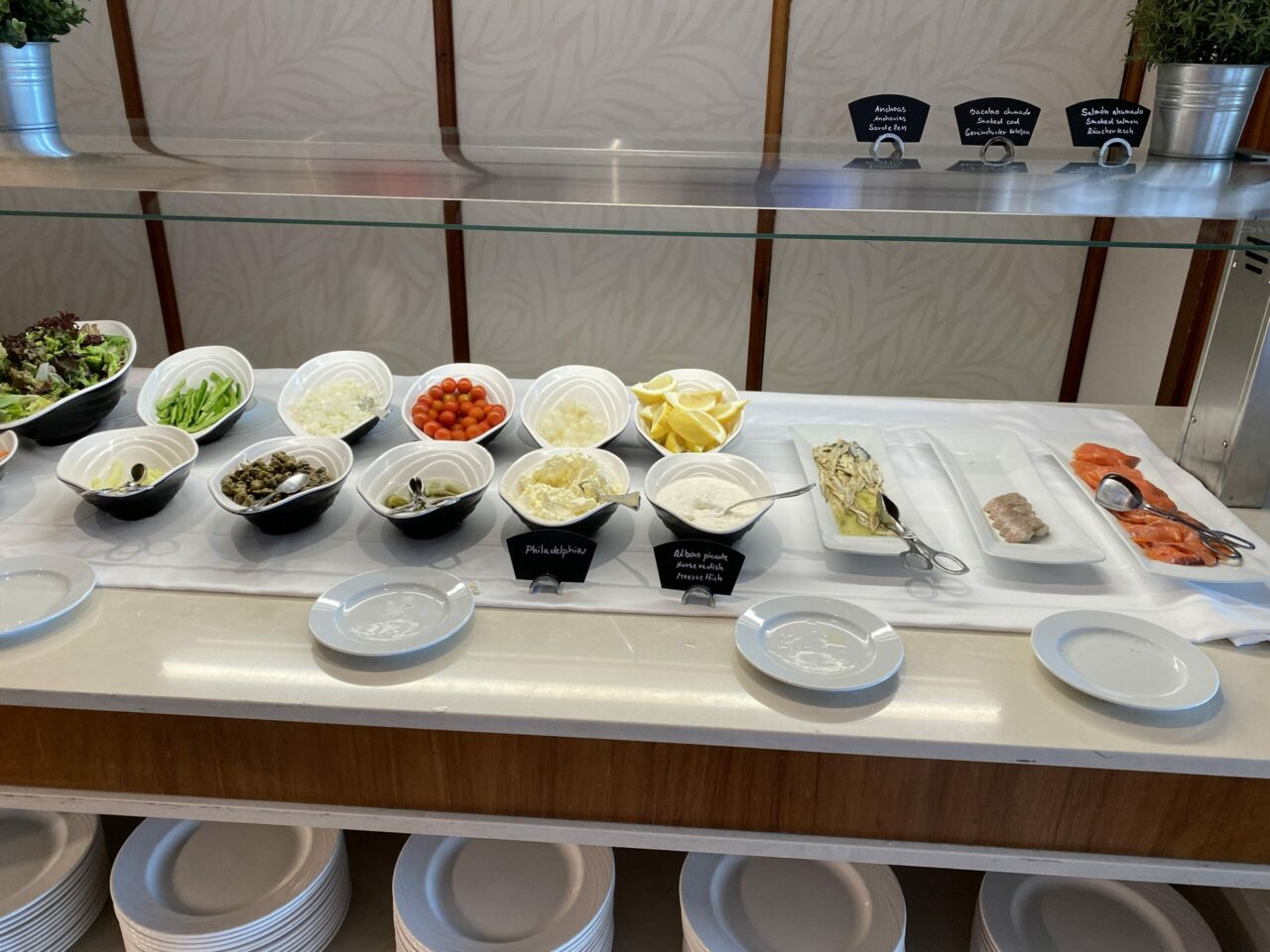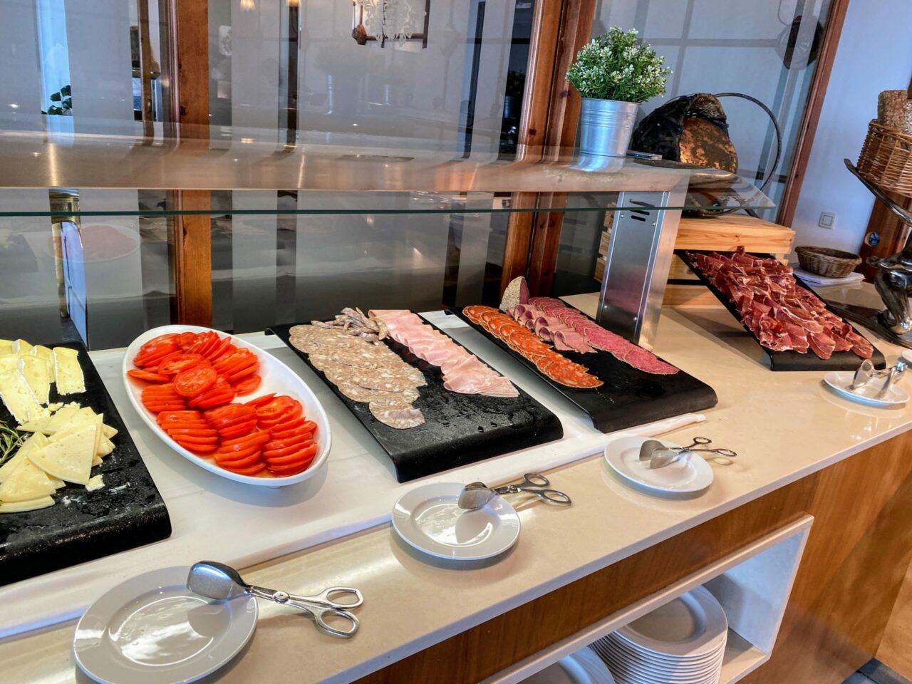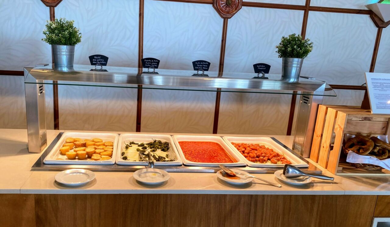 There was an extensive buffet with a Mallorcan specialty area such as tomato bread, sobrasada, and local cheese as well as the usual fare of fruit, pastries, bread, salad, smoked salmon, and yoghurts. The hot selection was equally comprehensive with a special every day such as cooked salmon or ham, different types of potato and croquettes, Padron peppers, and the usual eggs, sausages, and bacon. Dishes changed every day so there was no issue with getting bored. You could get omelets cooked to order and there was also a choice of several a la carte dishes.