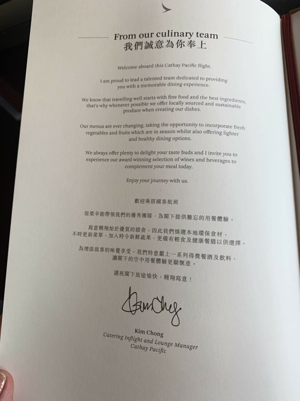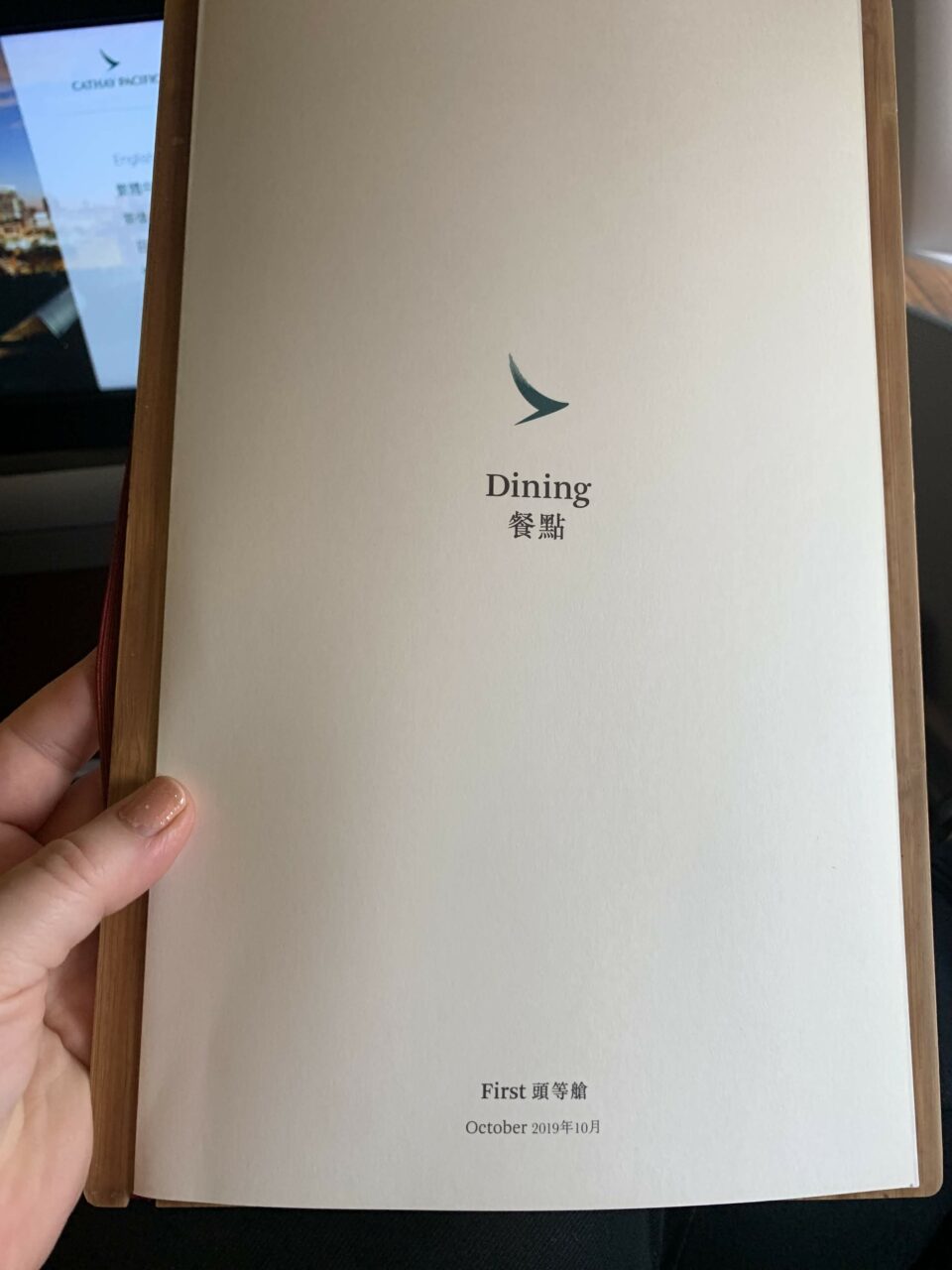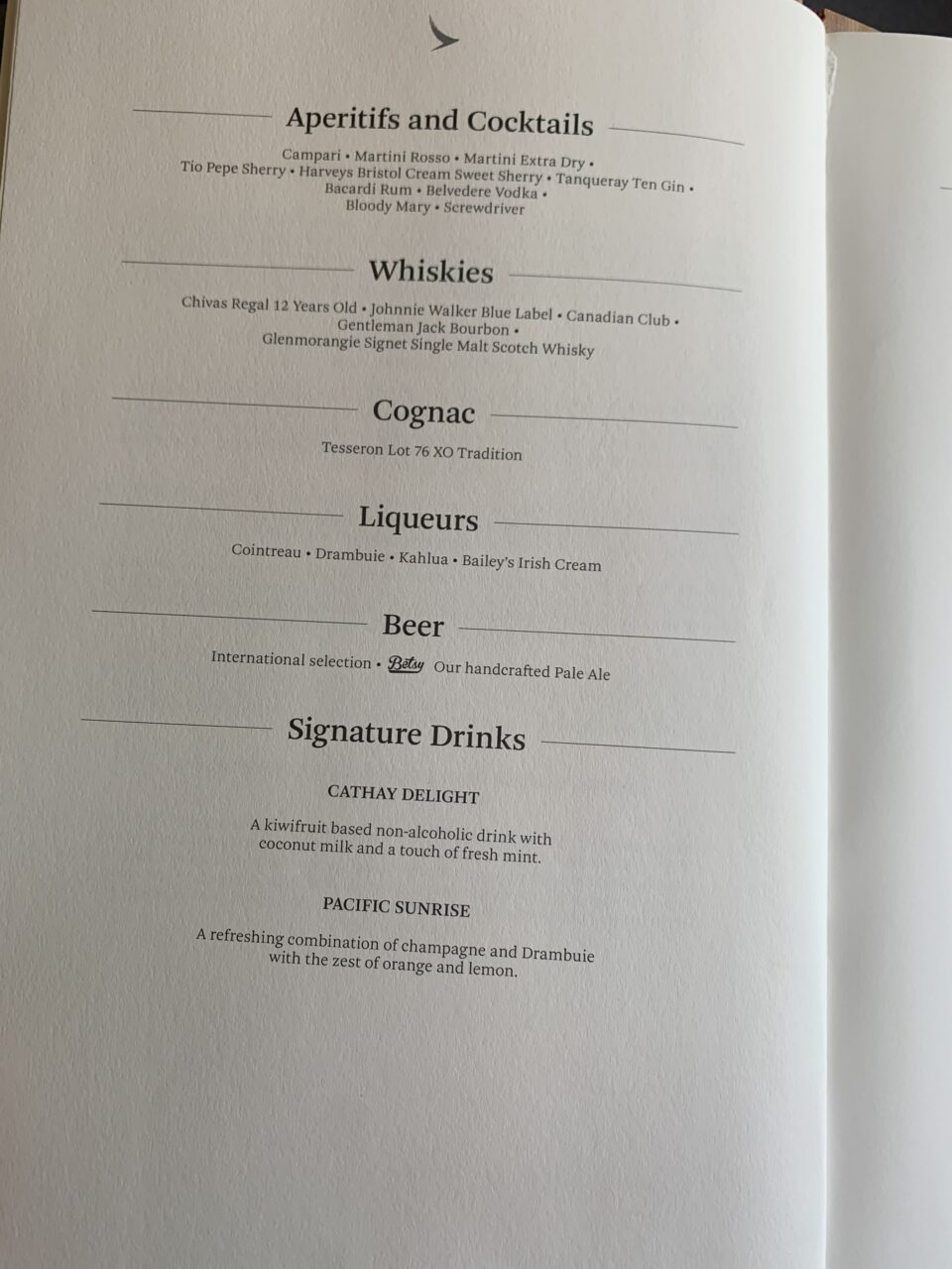 As always with Cathay, boarding was orderly and organised into groups starting with First and Emerald oneworld. Once at the door, I was shown to my seat and greeted by the crew. A welcome drink was offered and I gladly accepted a glass of the Deutz Amore de Deutz. The champagne was poured at the seat and served with nuts which were a nice touch. I really enjoyed the champagne which I thought on a par with BA’s Laurent Perrier Gran Siecle although less well known. Sadly they have stopped the Krug they used to serve.