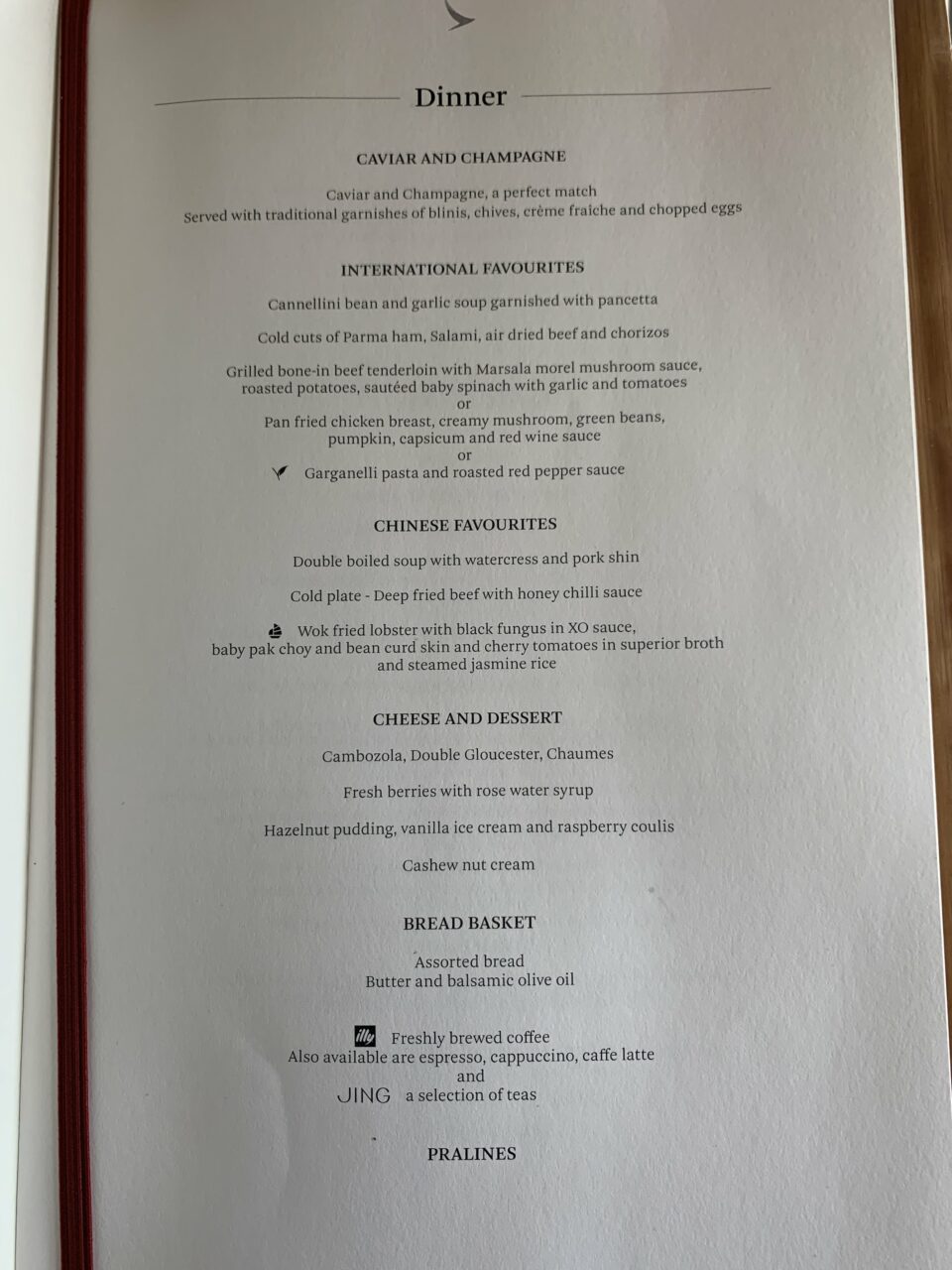 My order for food was taken before take-off. You can eat at any time, so I opted to eat after about a few hours. For dinner, there are two menus – Western or Chinese which are designed to be eaten as a whole menu but I chose to just have part of it since I had eaten in the lounge.