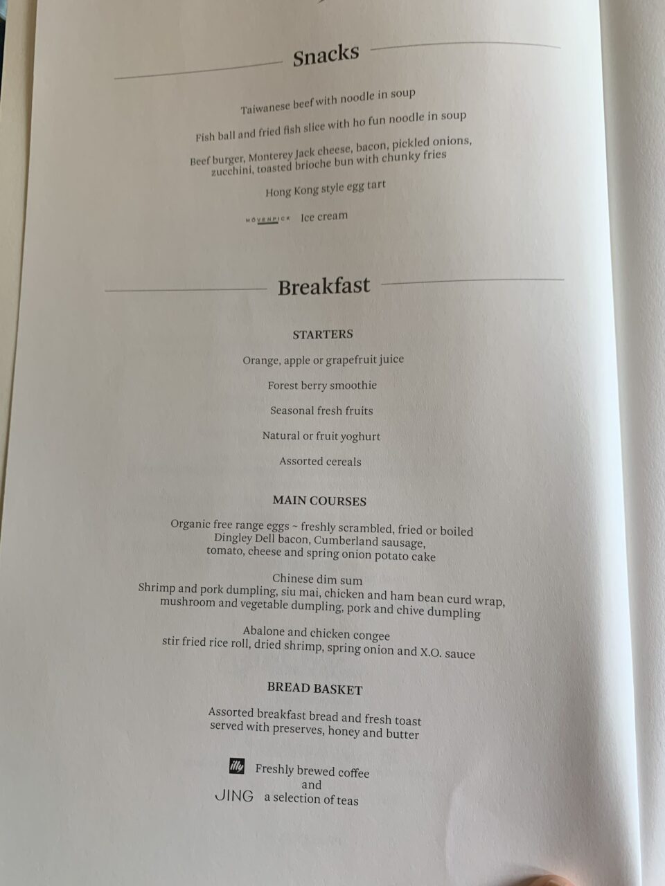 I did not need any snacks as I then had a bit of a snooze after all that! About 90 minutes before landing I decided to try the breakfast (the flight was nearly 16 hours so you need a second meal!). I thought breakfast was an odd choice given that we were landing at JFK at night. I went for the least breakfast-like option the dim sum. They were all very good even if they didn’t look that appetising though I have to say I am still not convinced by bean curd skin.
