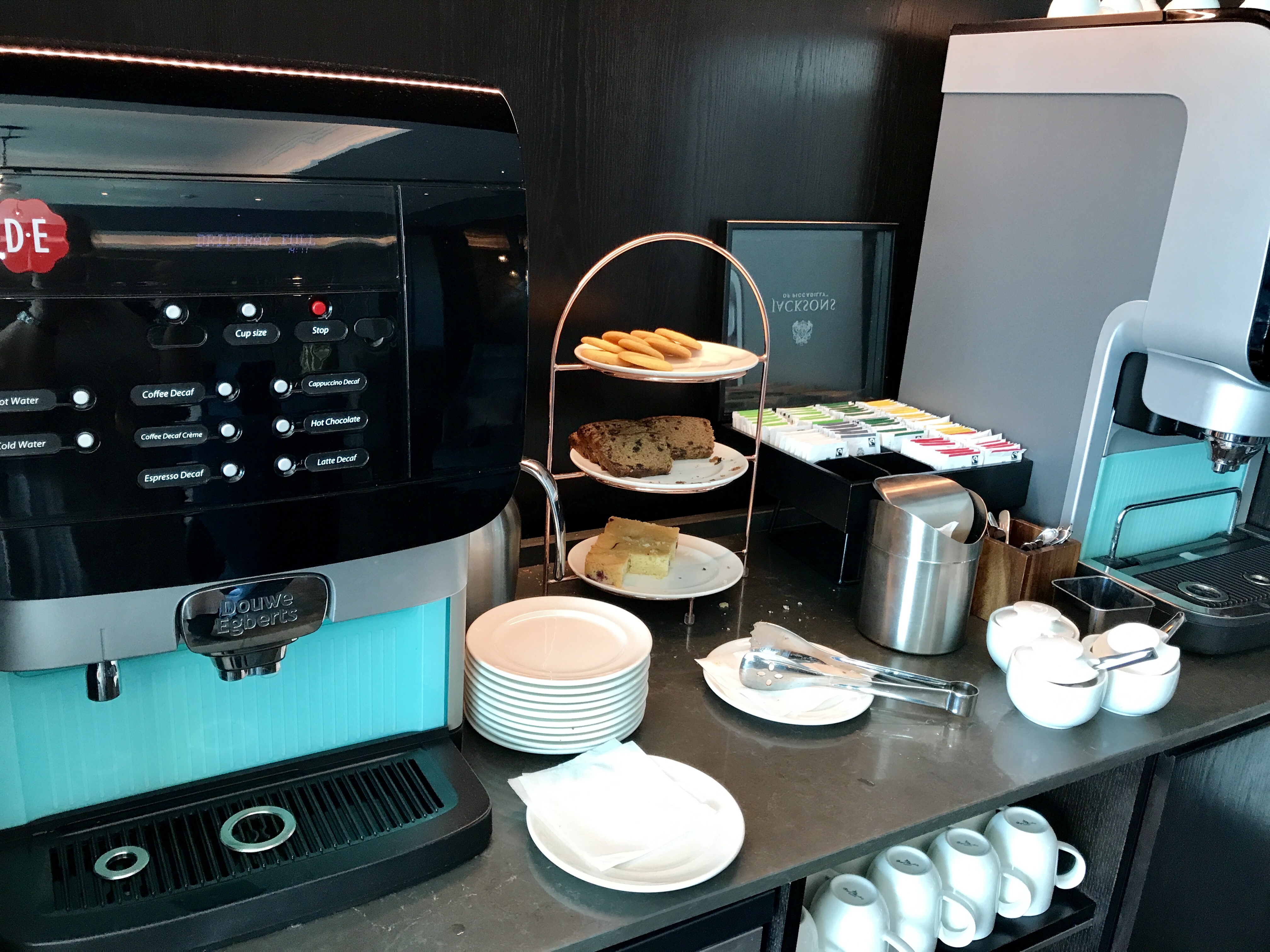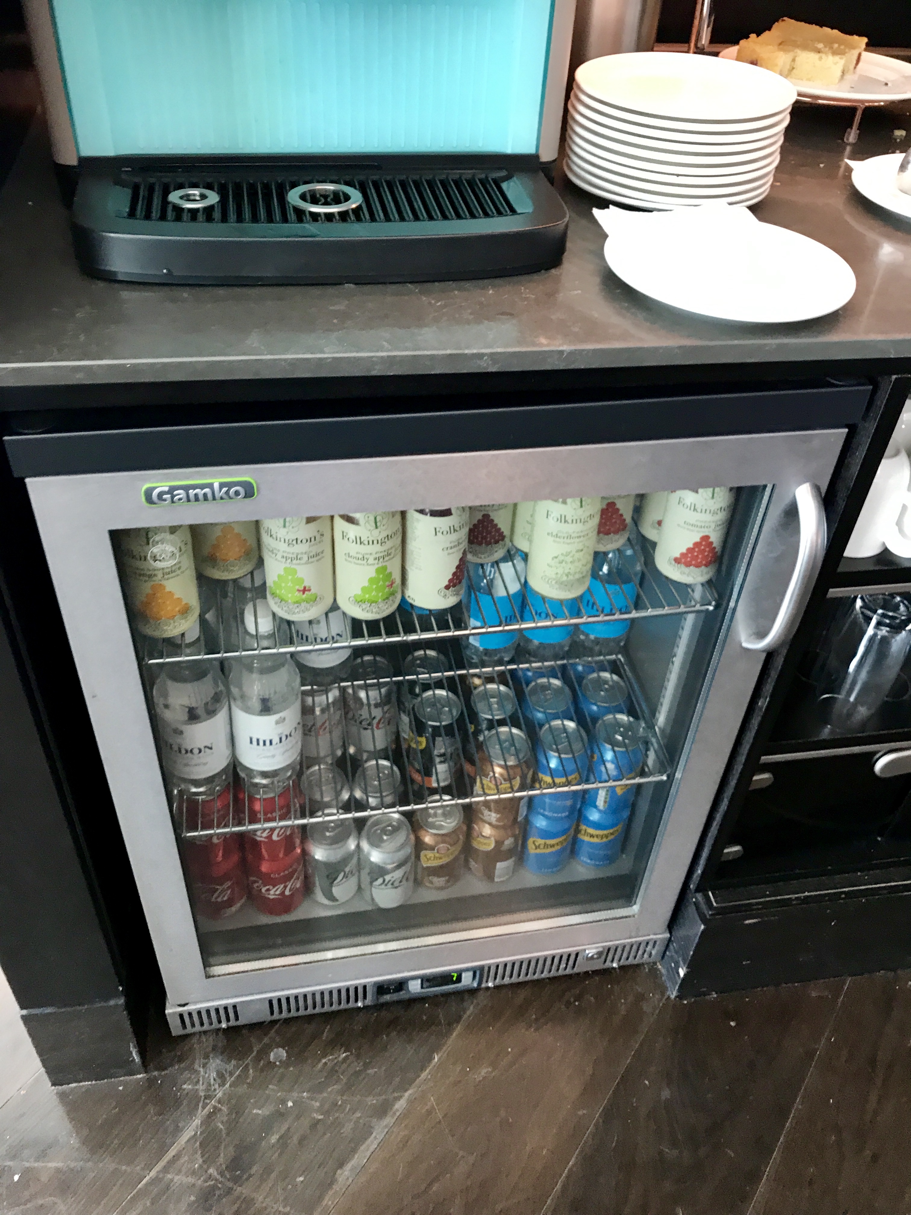 There was a small fridge of soft drinks and a coffee machine with a few biscuits and cakes you could help yourself to. Everything else was table service.