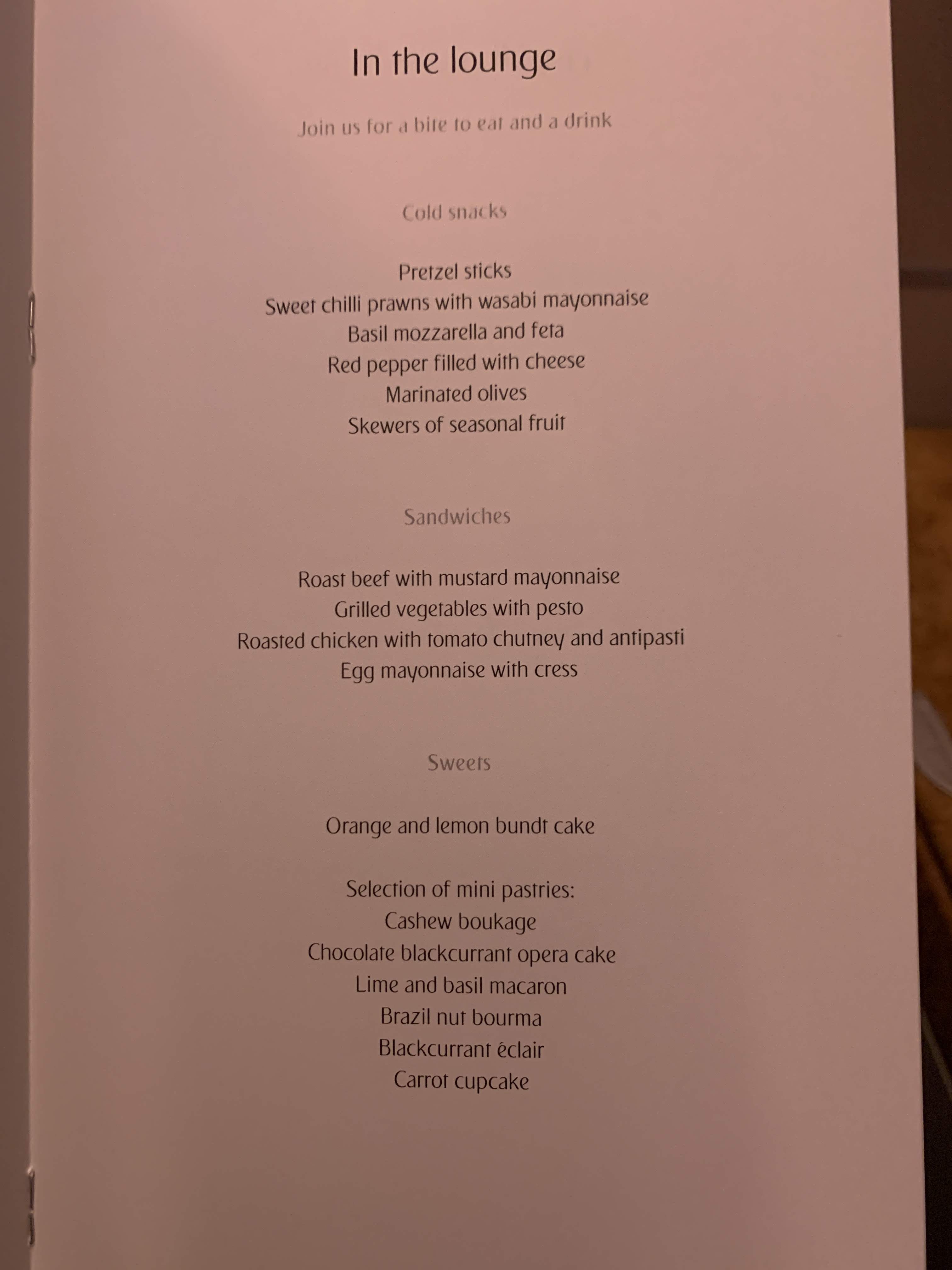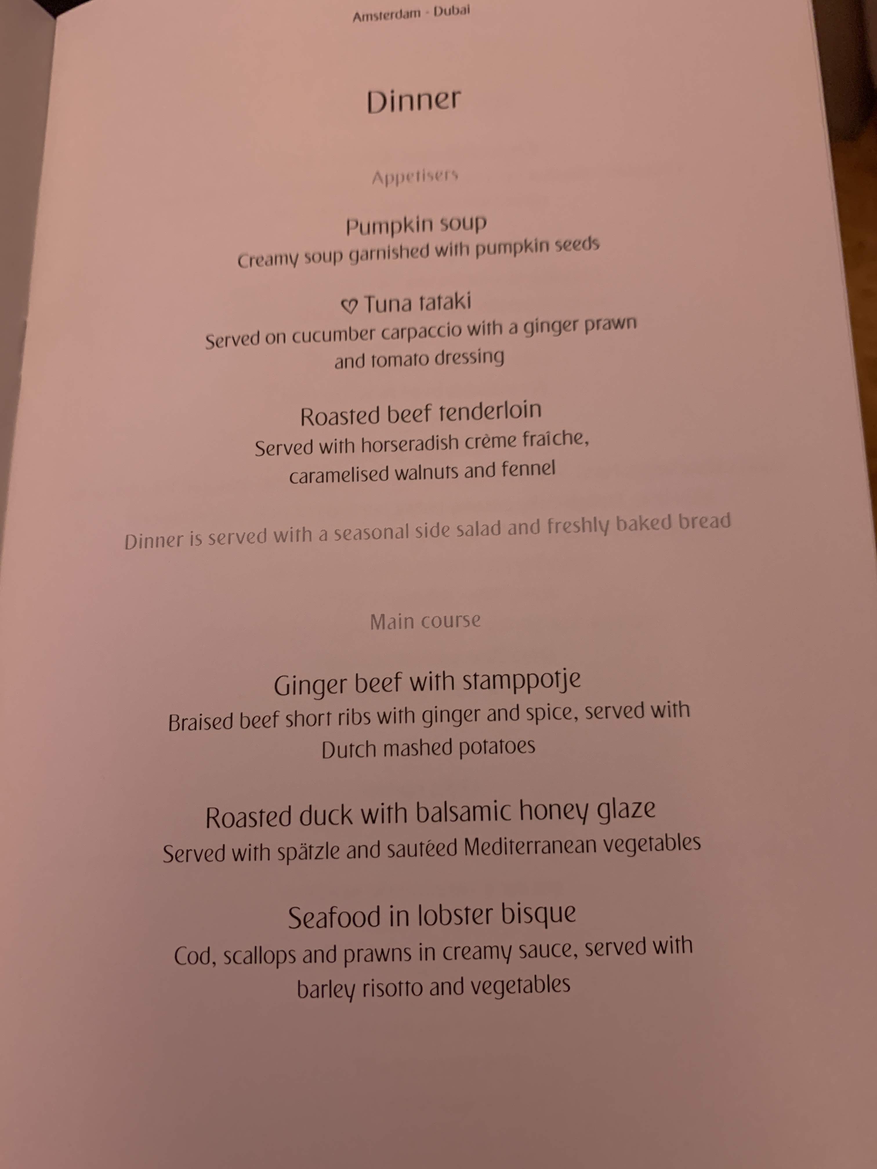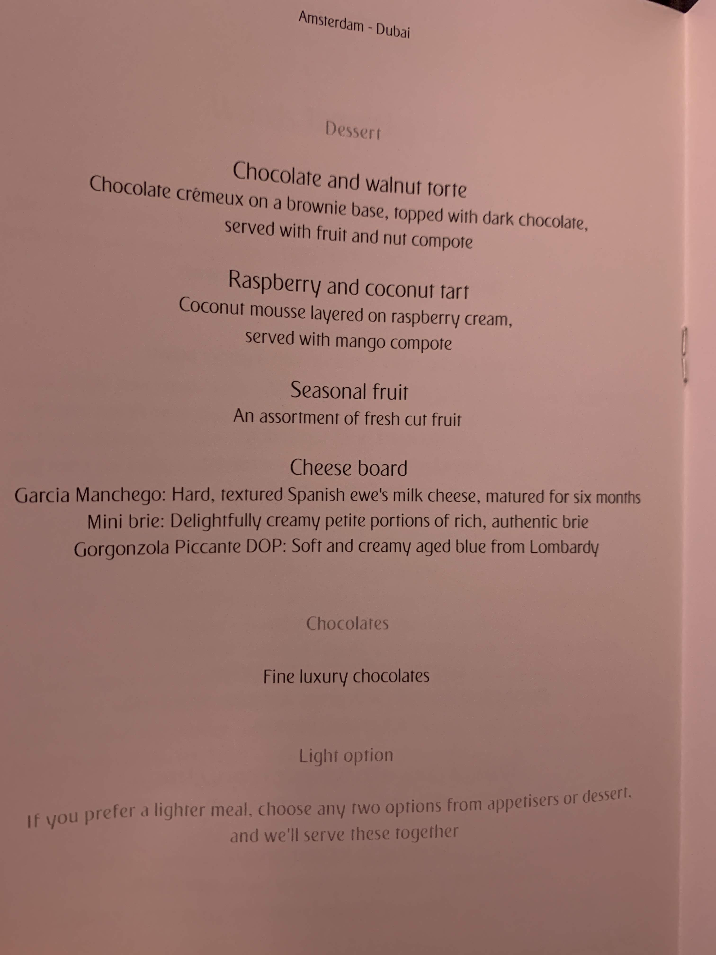 I was offered a menu and asked if I wanted a wine list. On this length of flight around 6 hours Emirates only serve one meal which some people may complain about. Personally, I never want a second meal on these length flights, but if you had wanted to go to sleep rather than have dinner and then have breakfast, this option would not work well for you. They do have snacks in the onboard bar which include sandwiches, canapes and cakes.