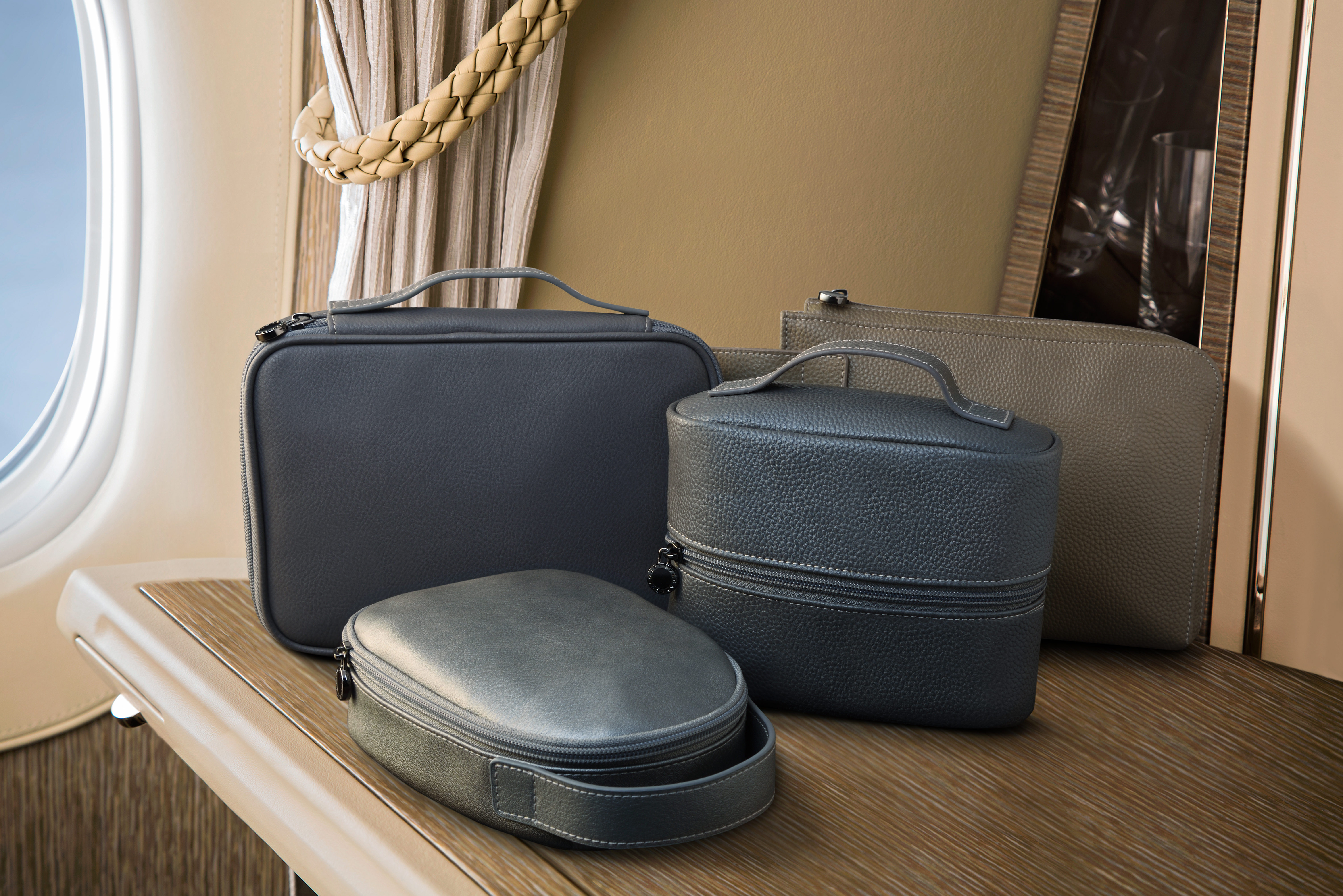 The First Class kit bags, made from faux leather, come in eight designs with a new range of colours for men and women. Eight additional designs are available in Business Class – four for men and four for women. The amenity kits are available on long-haul overnight flights and designs are changed every nine months. The bags have been designed to be used after the flight to store headphones, make-up or jewellery for example.