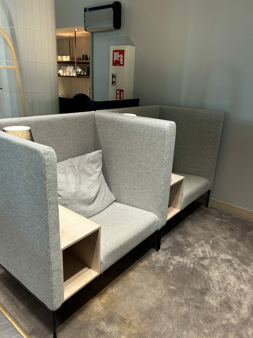 You then enter the main part of the lounge which has a row of individual booth-type seats down one side and then in front of you the dining area. These seats all had a charging point with USB and a European socket. I liked the design of the side table with a storage area underneath though I could see myself leaving something behind there!