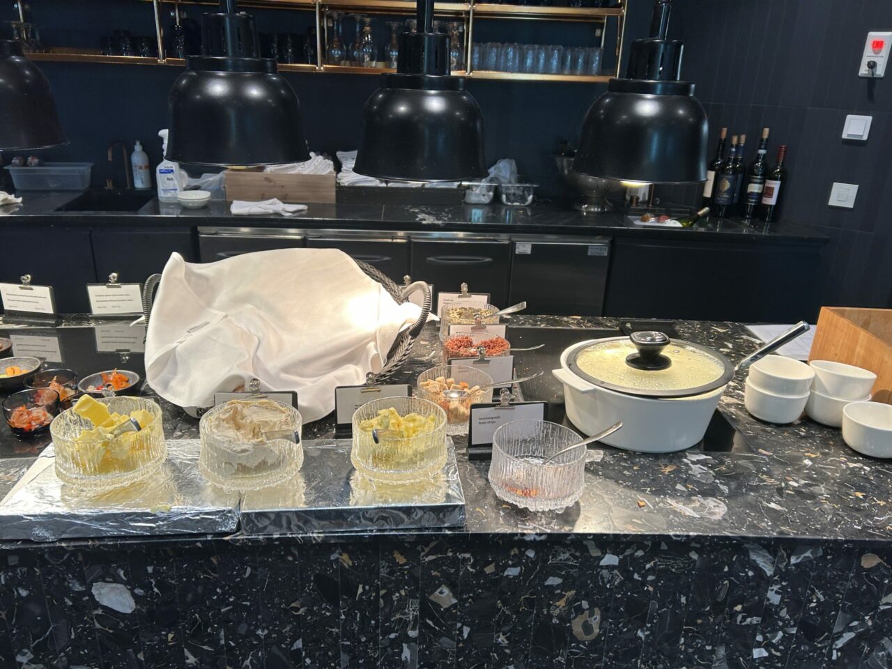 There were a few seats around the bar, but behind the bar was a quiet starting area with comfy seats where people were making phone calls since it was quite empty. The whole lounge was pretty quiet apart from the restaurant. Under each bar table, there was a double European socket. This is definitely a lounge where you will not struggle to recharge all your electronics!