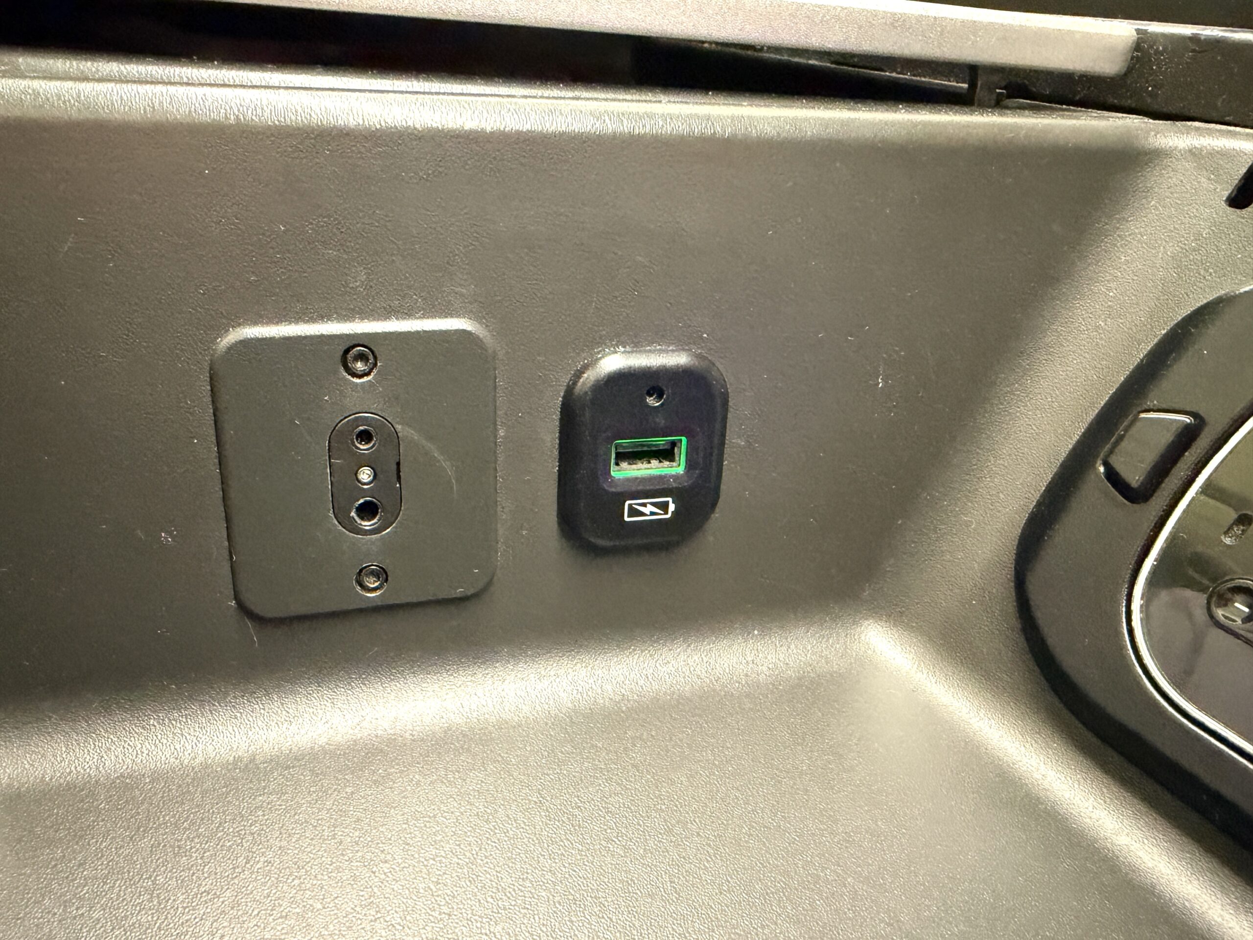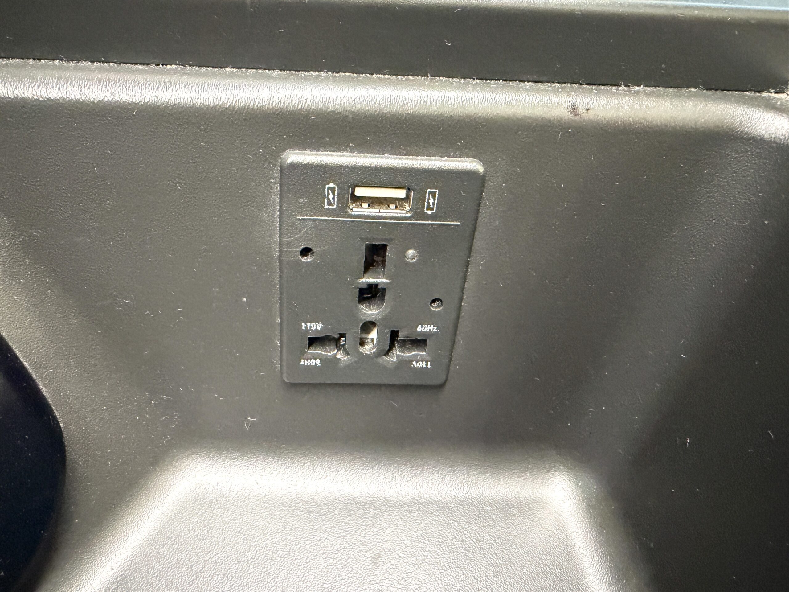 Standard charging points are here. Slight oversight from BA, but you cannot use anything larger than a single plug, so if you exclusively charge your laptop with a bulky charger, it probably won’t fit.