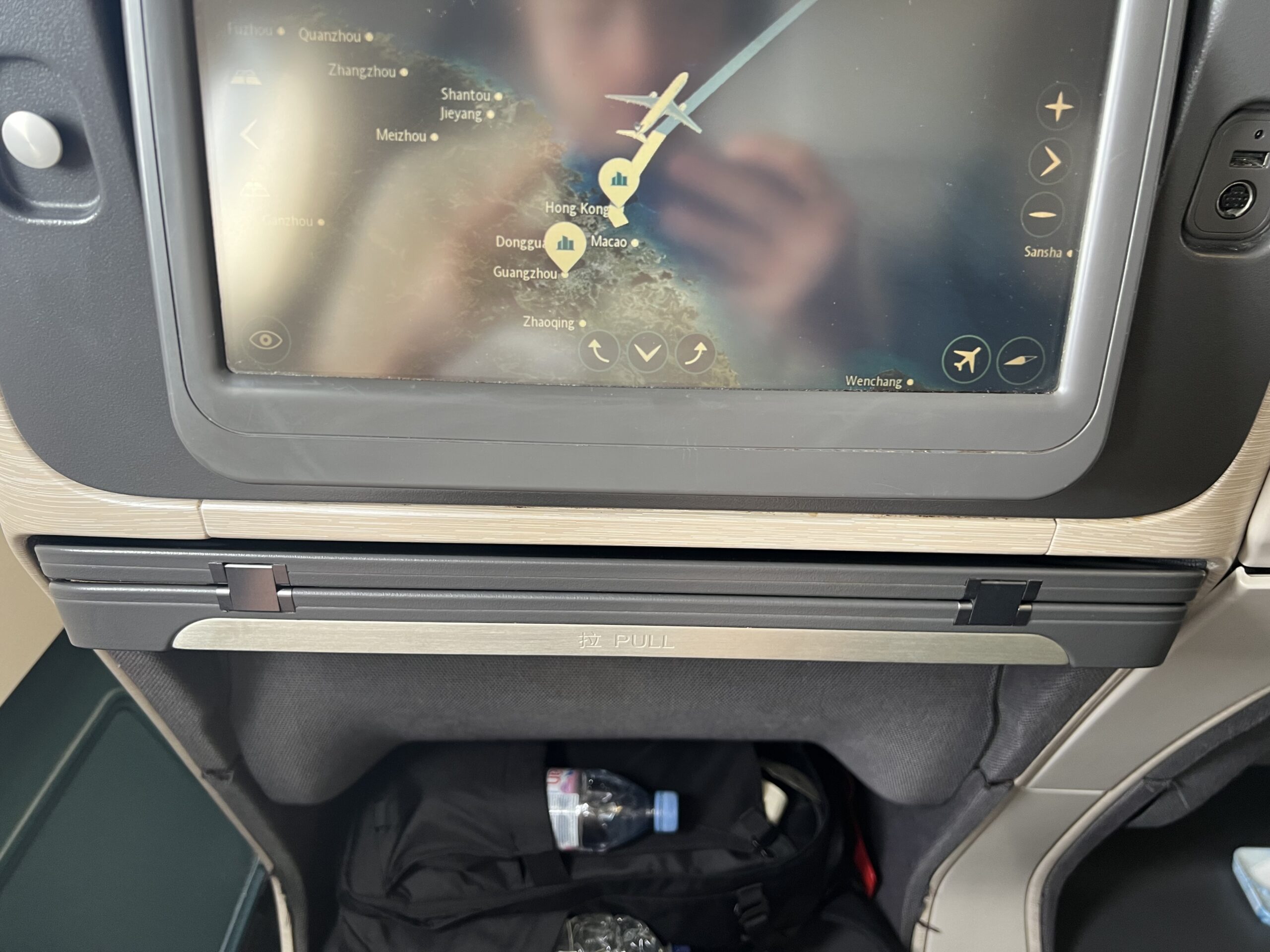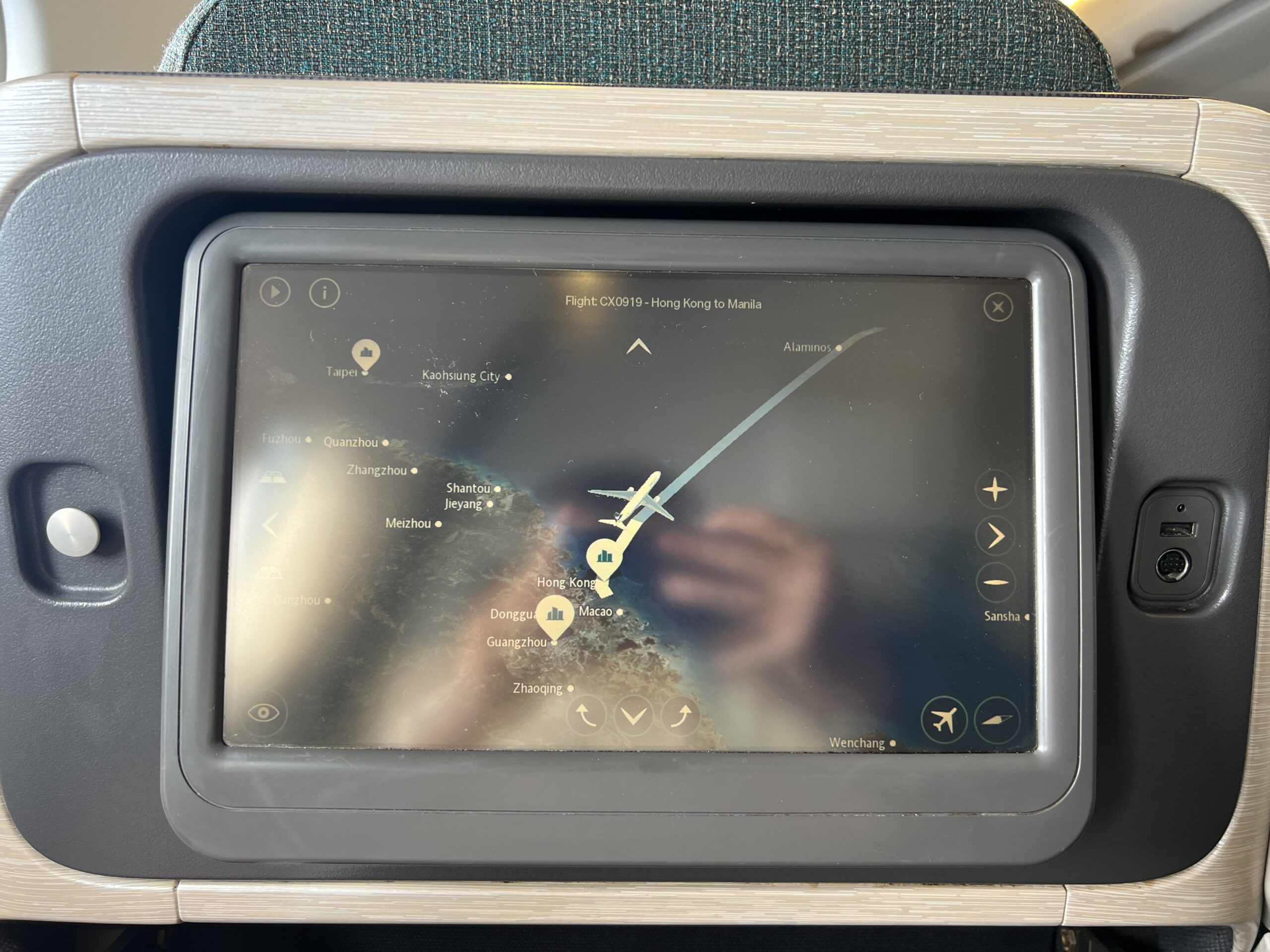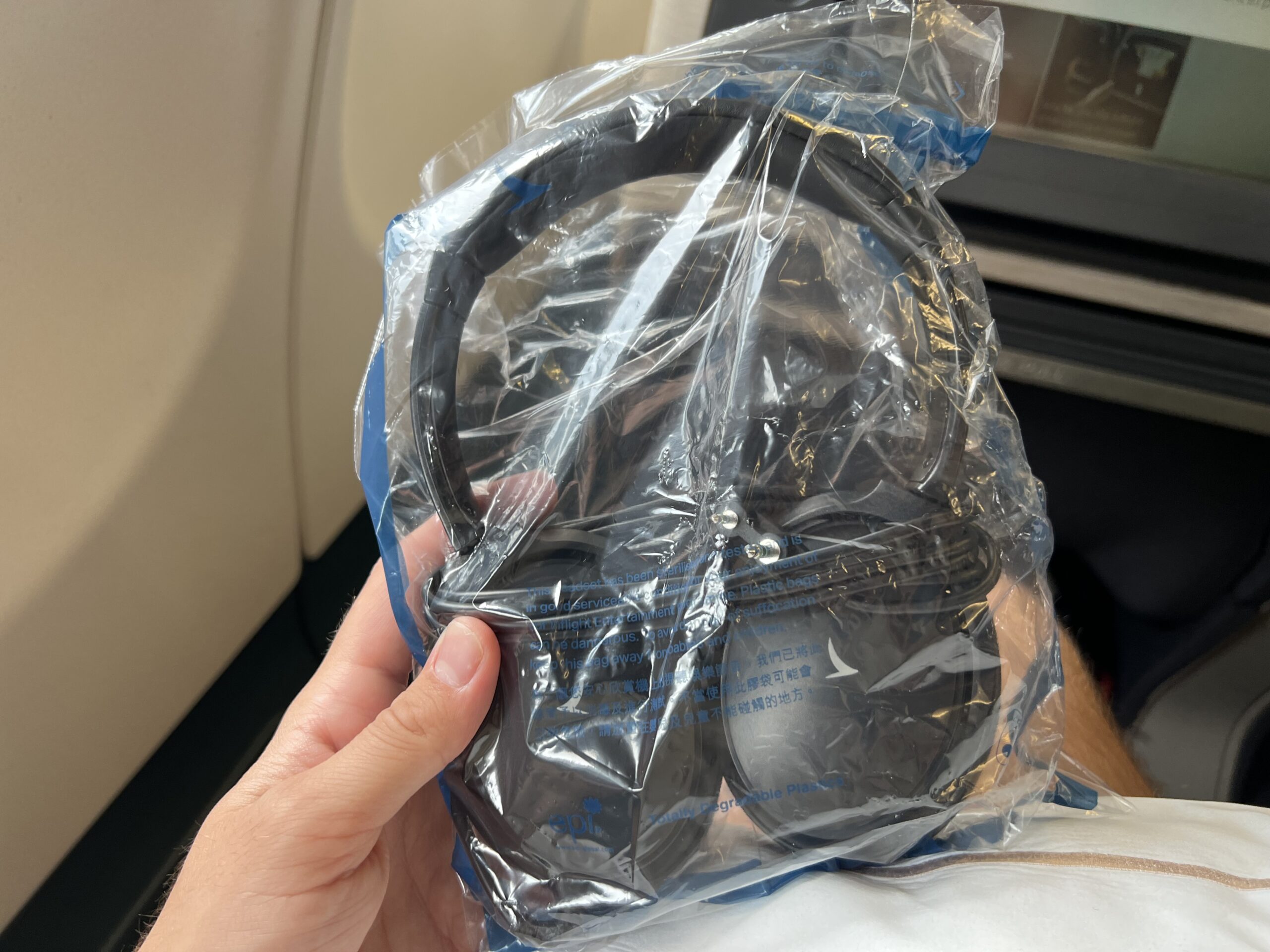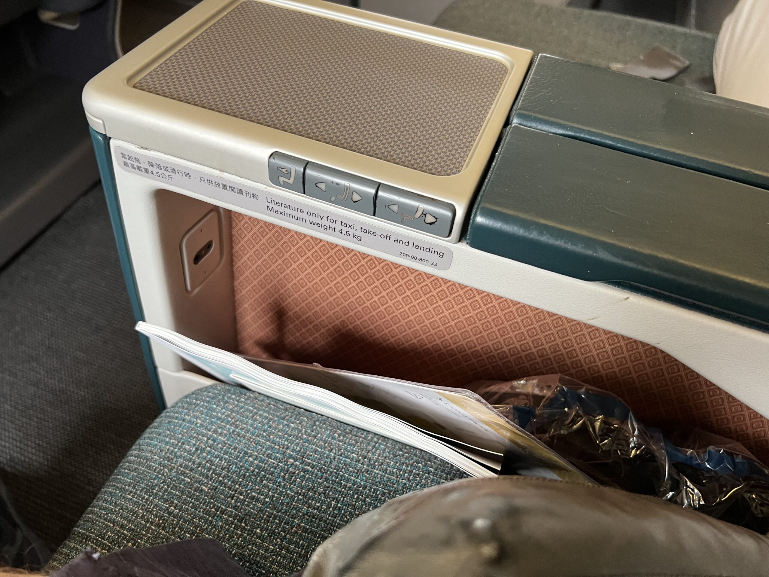 This area between the seats holds the only storage area. Large enough for small items like a wallet or mobile phone, the lack of storage space is less of a problem compared to a journey on one of Cathay’s long haul flights. Headphones are provided by the airline which are unbranded and the quality was middling – noise cancelling was passive so you’re better off using your own set if you have them.