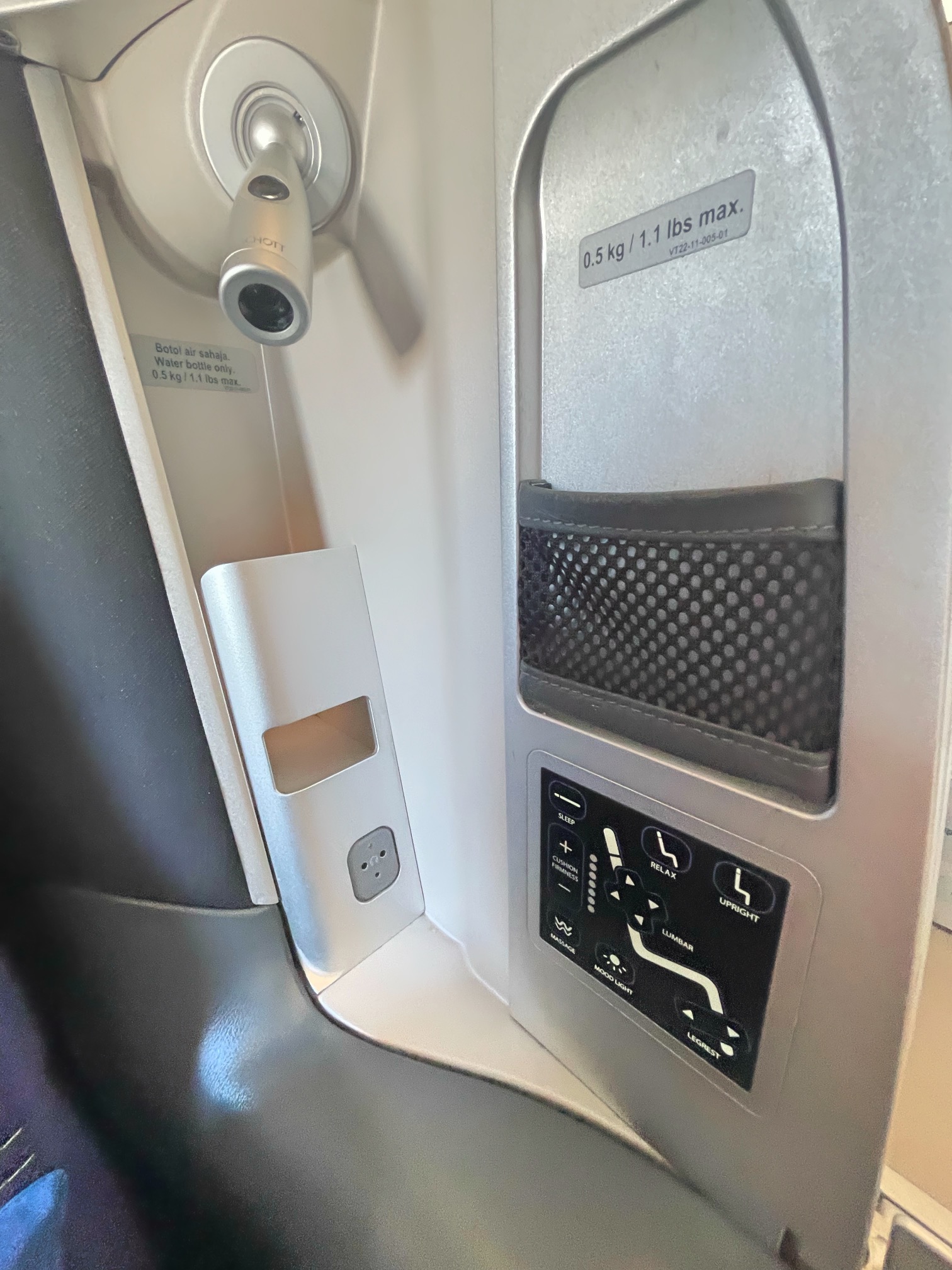 Malaysia uses the 737 as its short-haul workhorse with some significantly newer than others.  Regardless of whether you are on one of the newer or older jets you will however be greeted by a ‘proper’ regional business class with four rows of seats in a 2×2 configuration.  Similar to what you will find on domestic flights within the US the seats feature a pitch of 42” and each seat also has a leg rest.  The aircraft I was on did not have seatback screens but thinking back to previous travels on Malaysia Airlines I am certain I have been on 737s that have had.  It is possible to stream entertainment to a personal device from ‘MH Studio’ however Wi-Fi is not available.  A multi-power outlet is also provided along with a USB-A charging point and waiting at each seat was also a small pillow and blanket.
