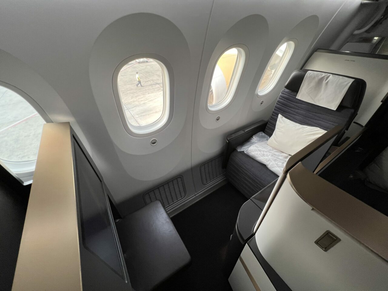 A very basic amenity kit and a bottle of water can be found at the seat upon boarding. And this is one of the downsides of this seat design. This area is the extent of the storage. While you can store a bag underneath the ottoman, there isn’t any extra dedicated closet or space to place items while at the seat – which isn’t ideal.