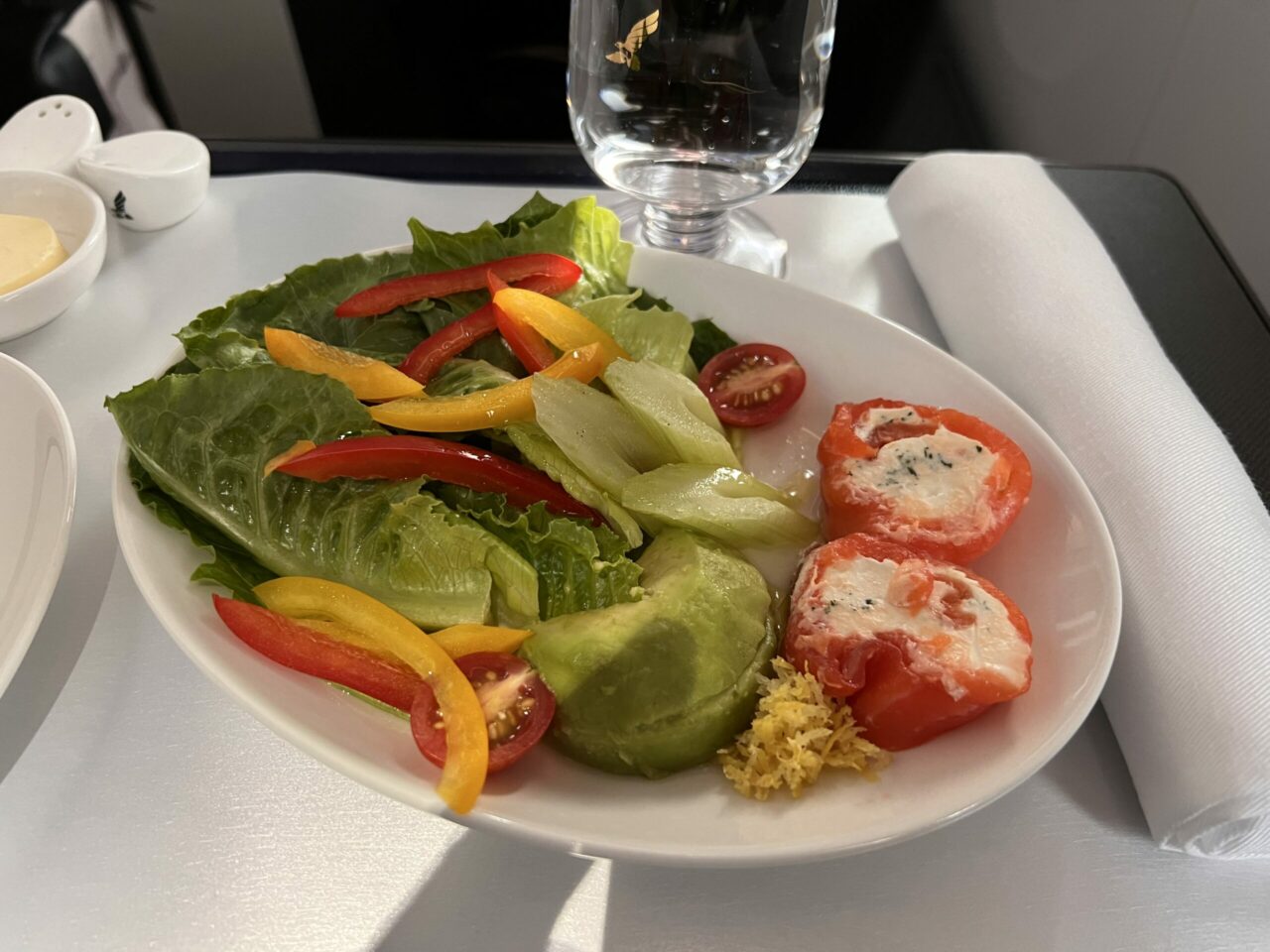 - A basic salad with small peppers stuffed with cream cheese for a starter