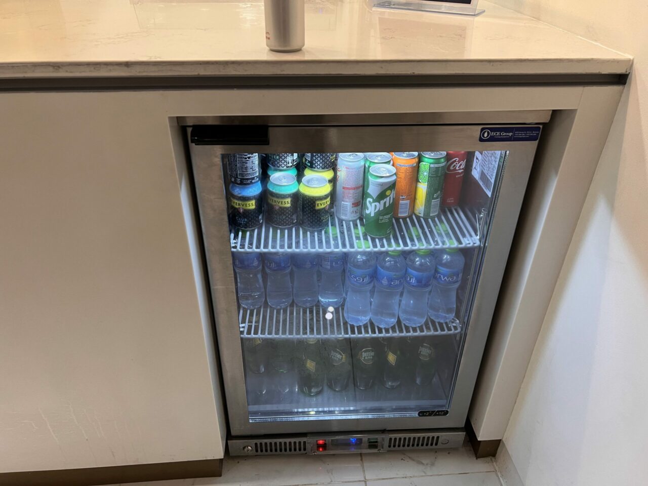 As for drinks, self-serve soft drinks in fridges were dotted around the lounge. For alcohol, a bar area is available in the main seating concourse with alcohol displayed visibly (which is not always a given in this part of the world). I didn’t manage to get a direct shot of the spirits, but the essentials seem to be available, as well as a basic assortment of wine and beer.