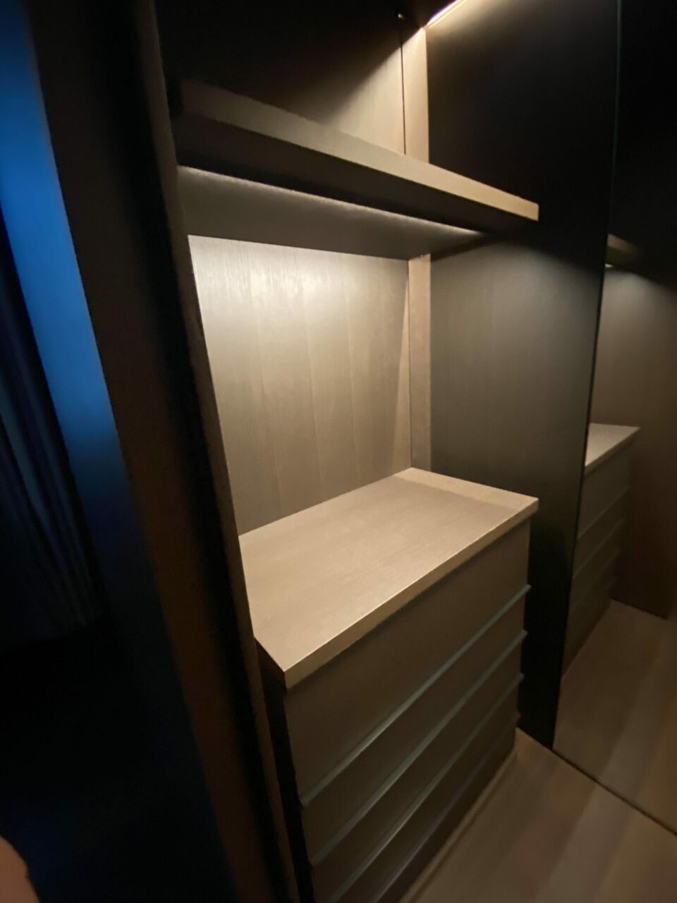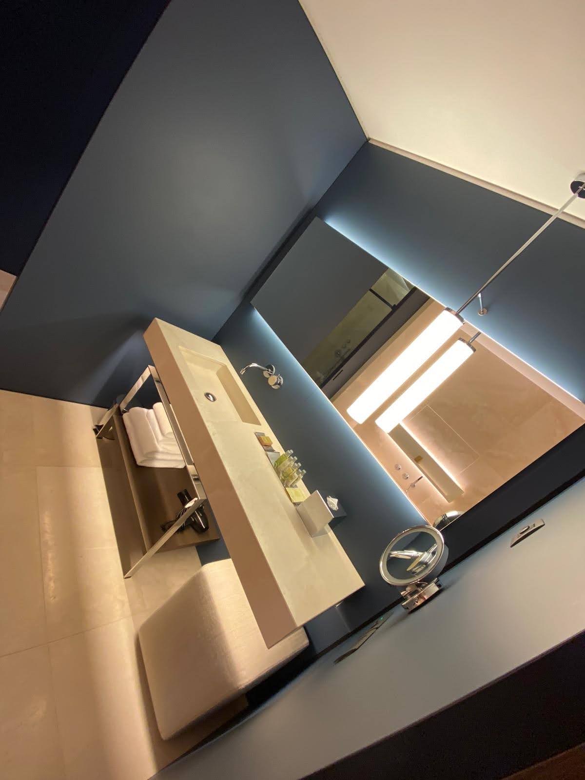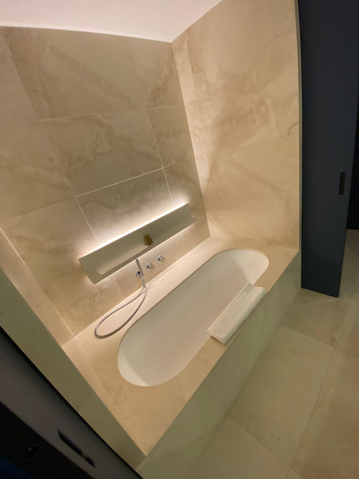One bedroom was more of a master suite with a walk-in wardrobe and a larger bathroom. Toiletries were the standard Hilton ones but a larger size. The bath looked great, but was actually quite uncomfortable as you could not relax your head back on the hard narrow edge unless you used a towel! I liked that there was a stool to sit and do your hair or makeup with power points next to it and a magnifying mirror.