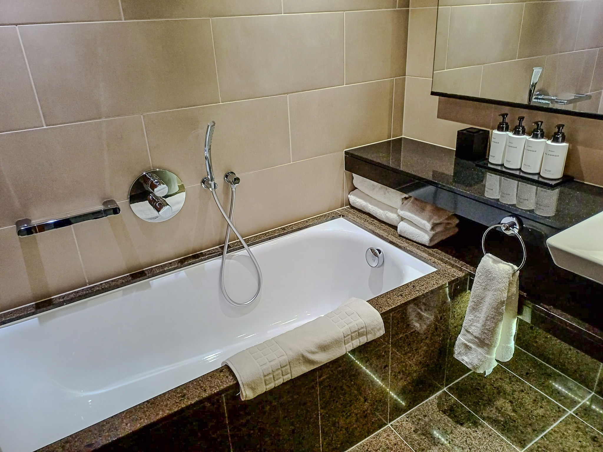 The bed in particular was massive (with alternative/extra pillows swiftly delivered on request) and the bathroom had a spacious and deep tub, with an equally roomy rain shower. The toiletries were Bal D’Afrique, which I wasn’t familiar with before, but they provided a pleasant change in that they were not clamped to the wall. They were maximum size – one assumes so it is obvious that they are not for taking home – and were enjoyable to use.