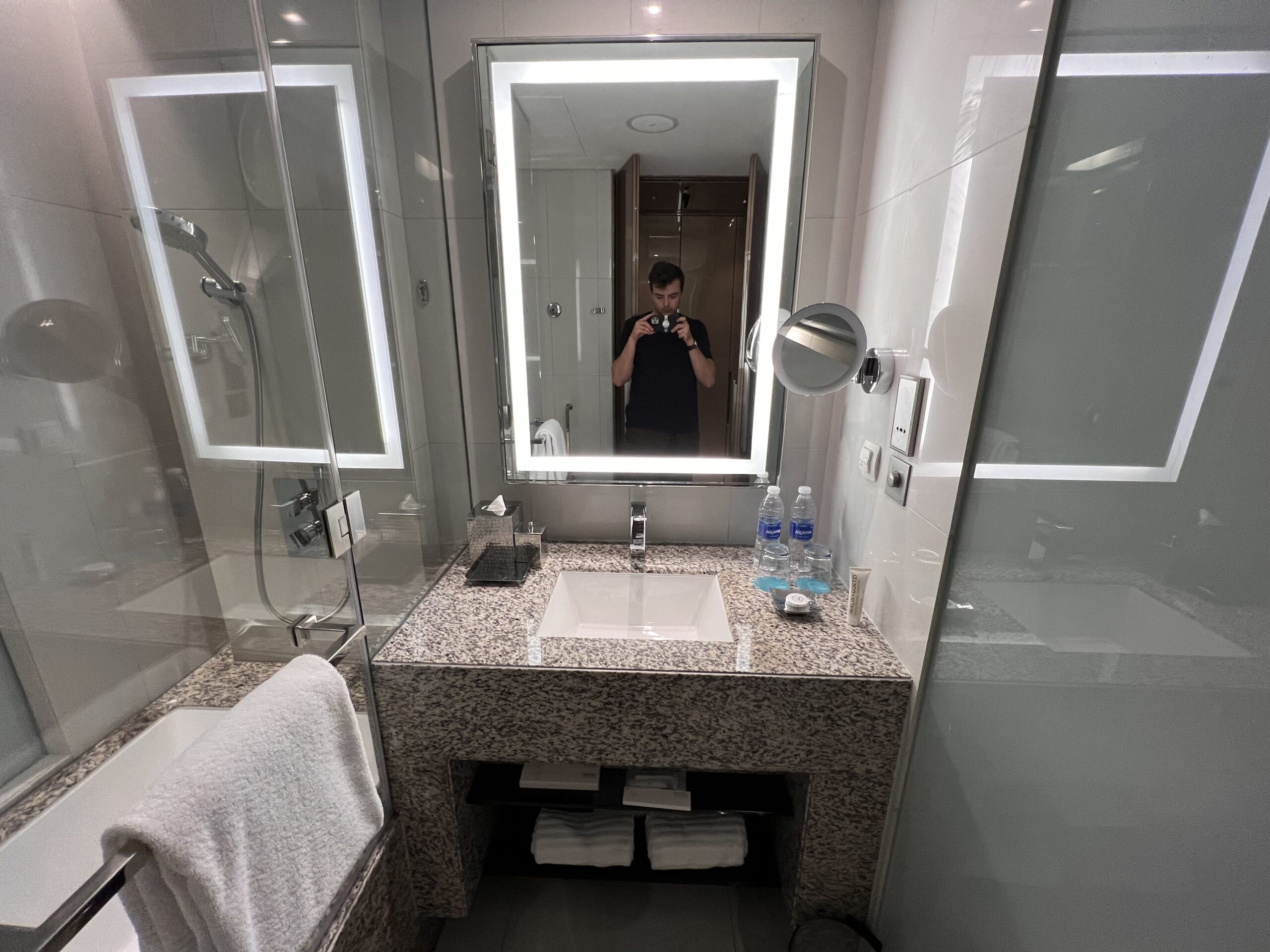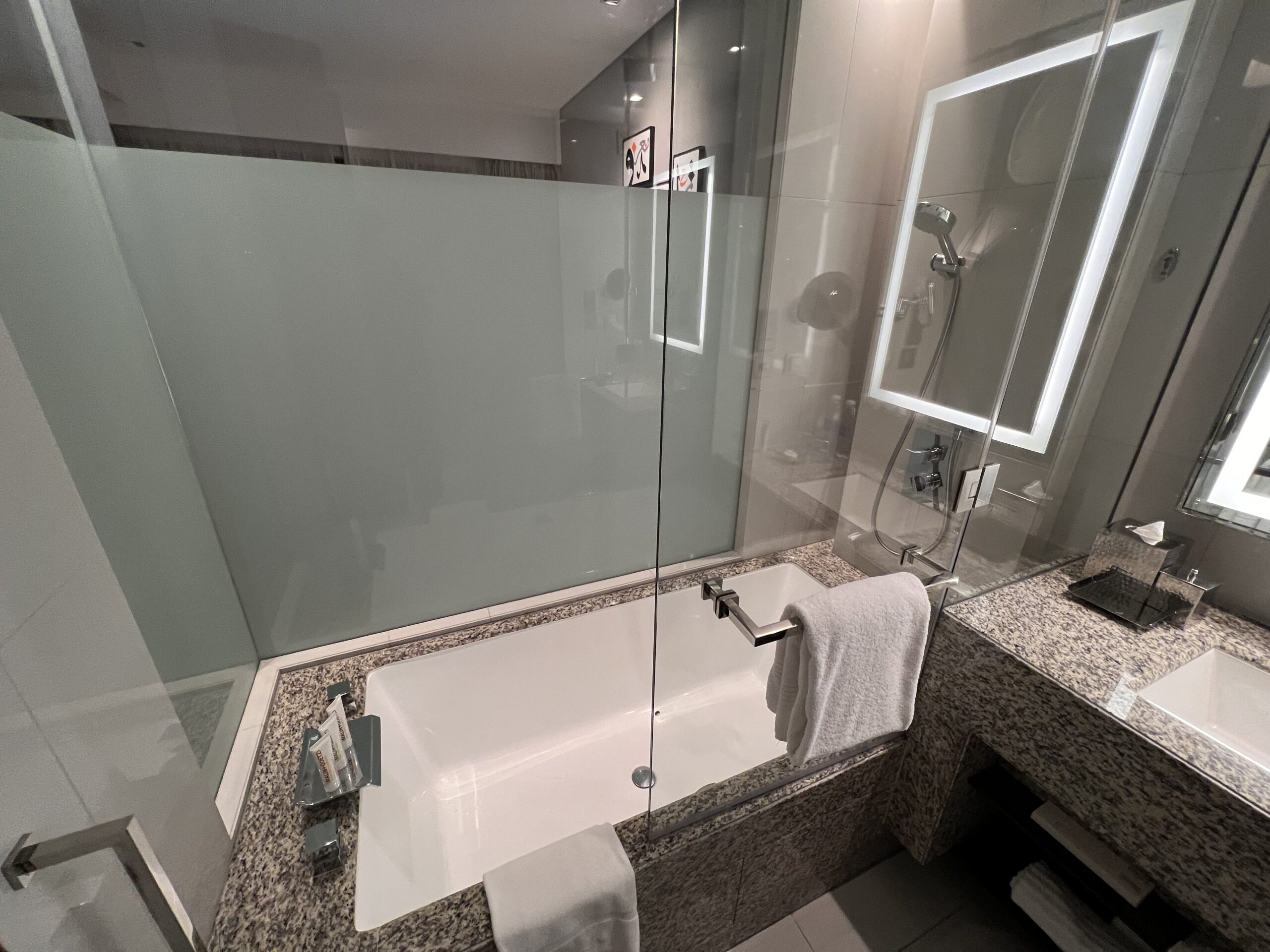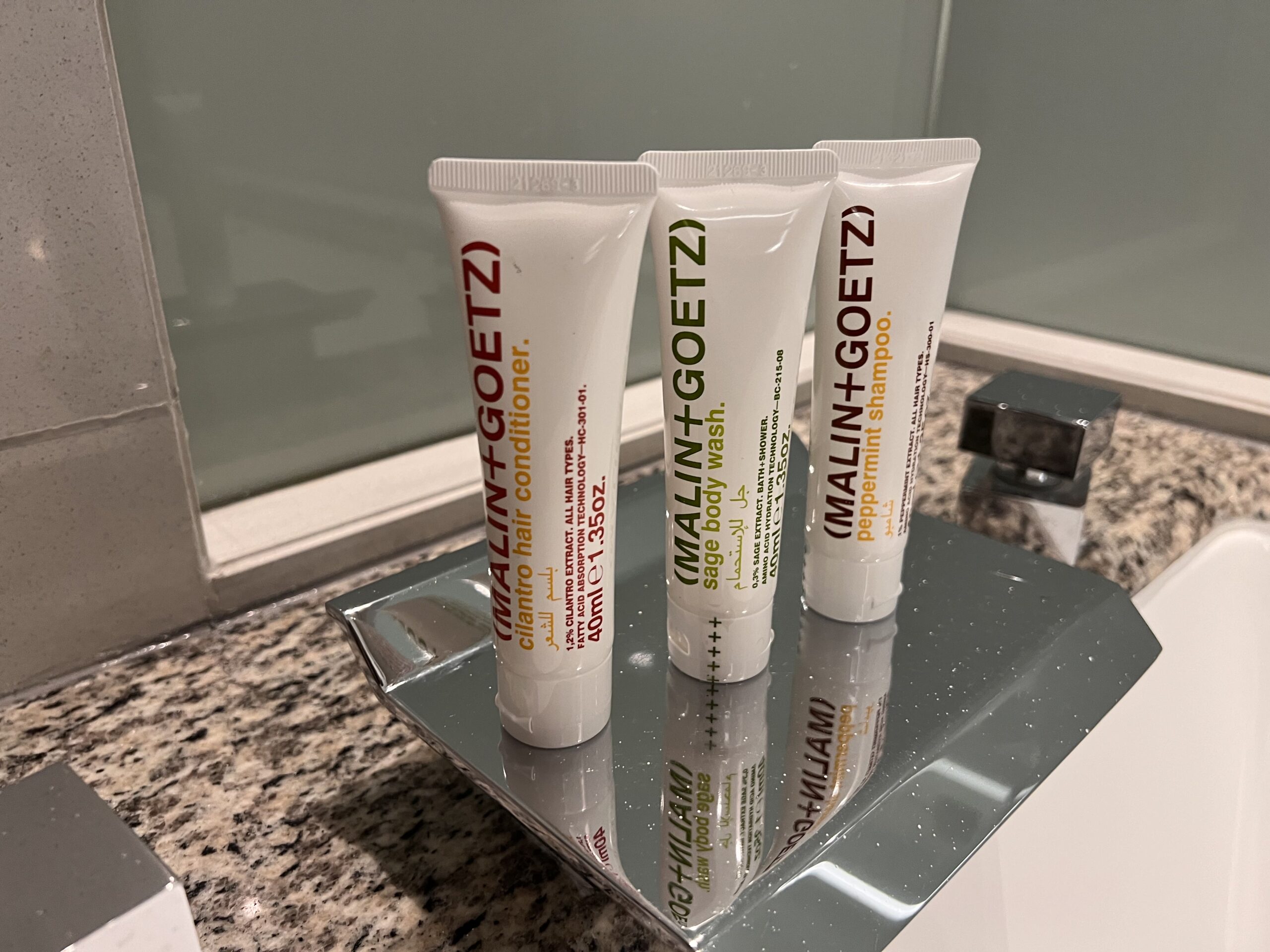 A sizeable bathroom completes this room. Bright lights, excellent water temperature and pressure, as well as plenty of room to move around make this a pretty good facility. Small amenities are sourced from the Malin+Goetz brand.